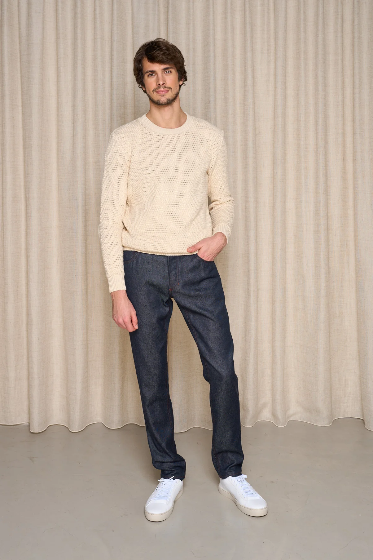 Le tissu est un sergé renforcé, composé de Lin de Normandie et de Laine Mérinos française La solidité du lin en fil de chaîne et la douceur de la laine en fil de trame confèrent à nos jeans une qualité et un confort exceptionnels.