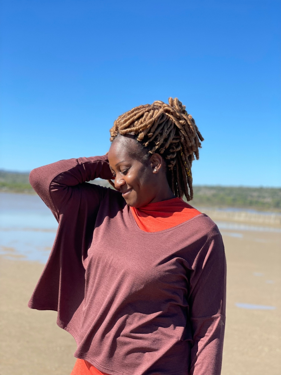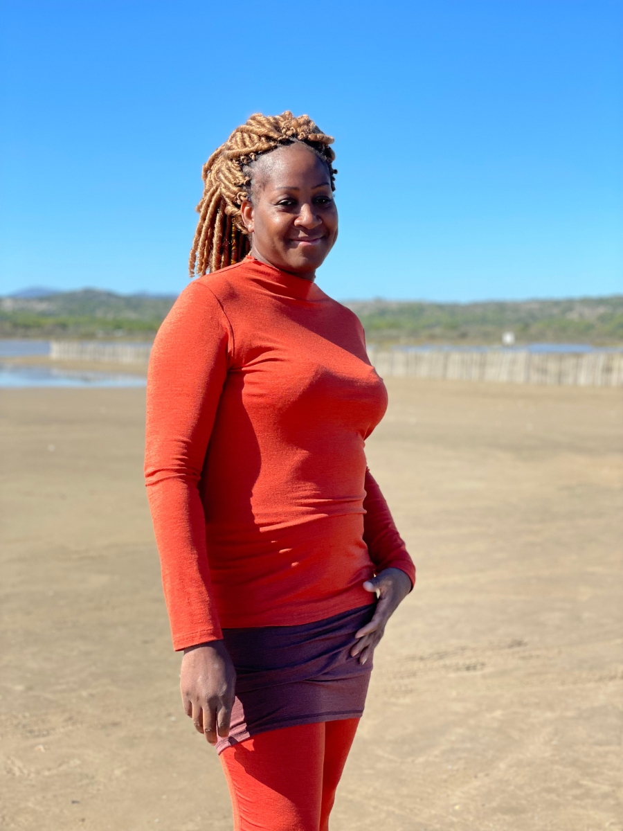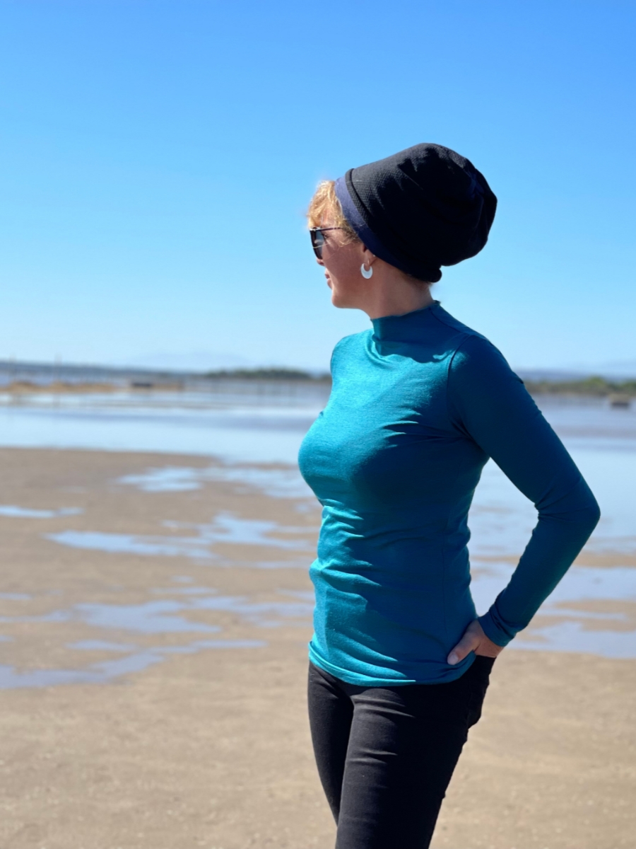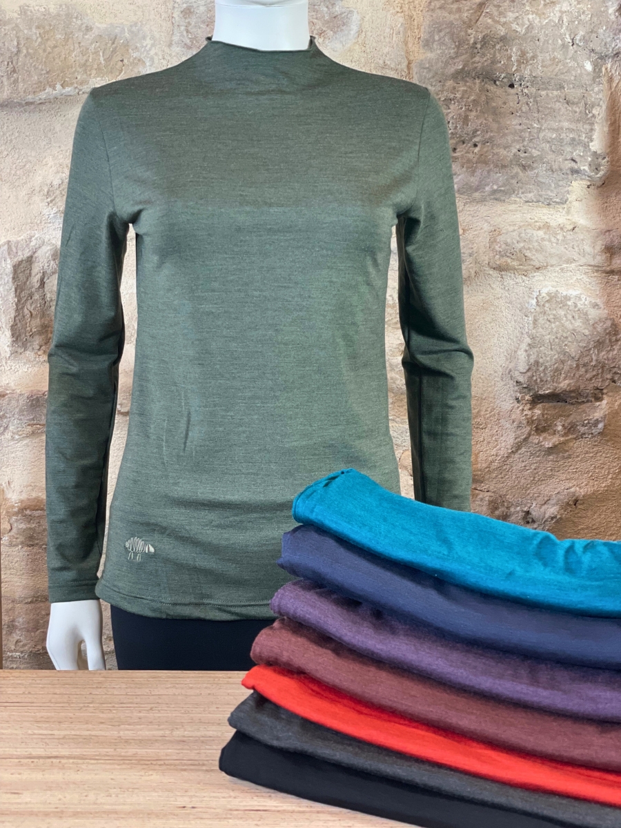 Pas de couture au niveau du col contrairement aux sous-pulls classiques, il a simplement une encolure montante délicatement fini par un point bourdon, comme nos tubandeau, maxitube et chèche.