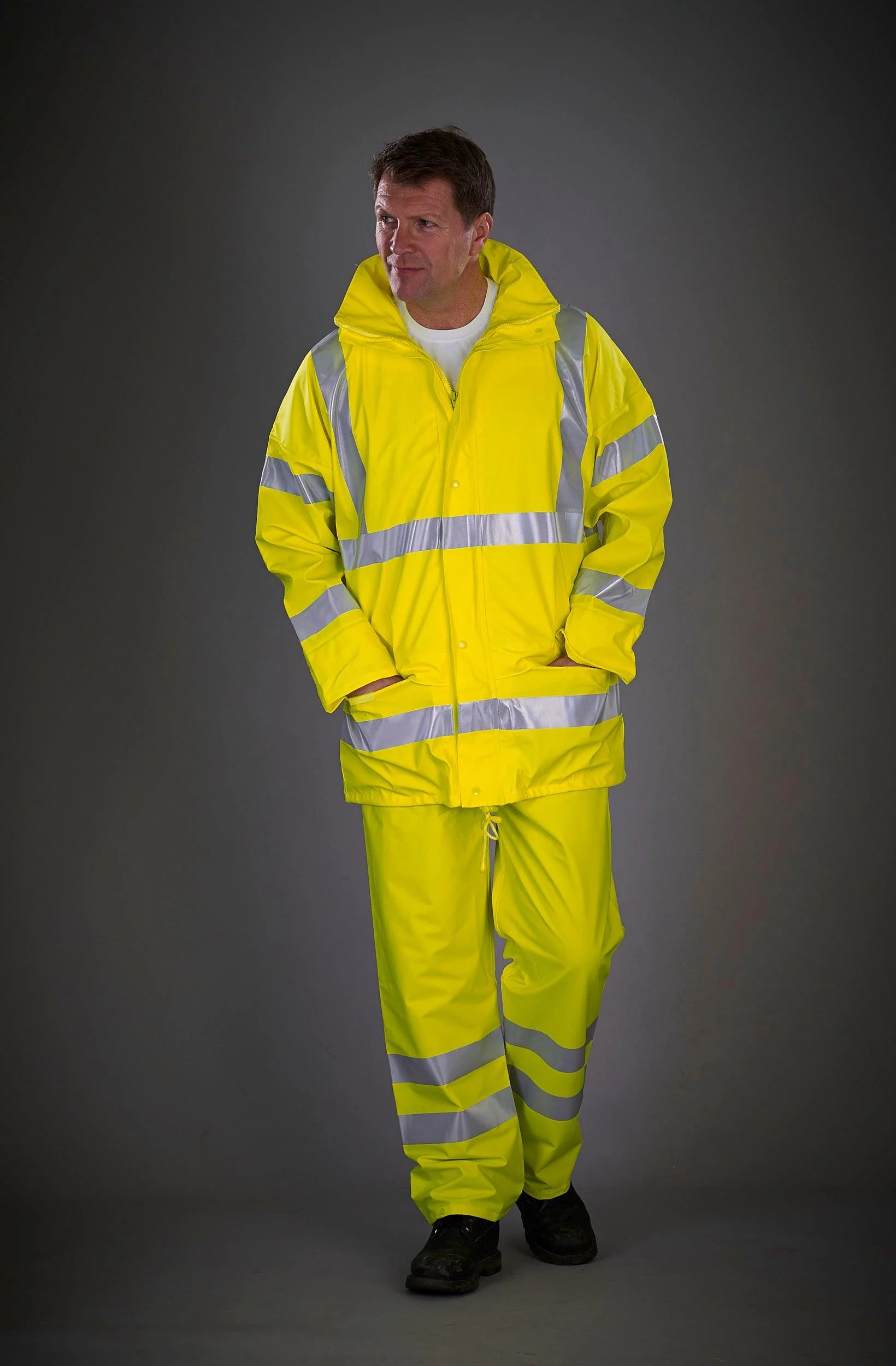 100% Polyester. Tissu extérieur doux au toucher et respirant. 3M rubans réfléchissants scellés à la chaleur autour du bas de chaque jambe; deux poches d’accès; boutons-pressions pour la cheville réglable; coutures cousues et soudées avec du ruban adhésif. Conforme à la norme EN ISO20471:2013 Catégorie 1 et EN343 Class 3.3