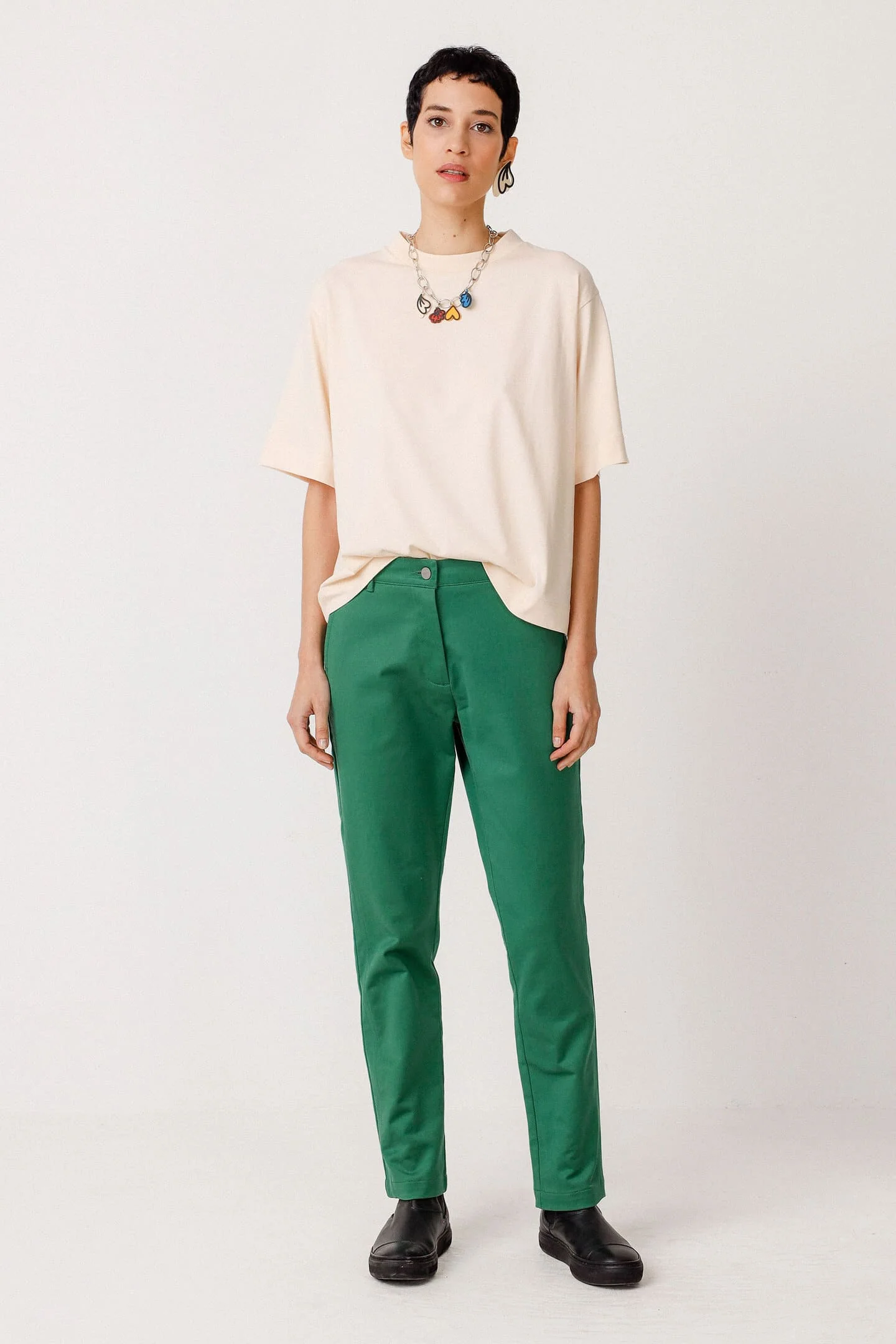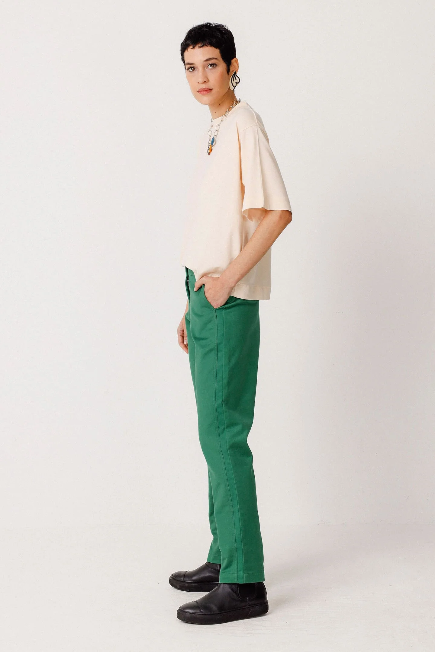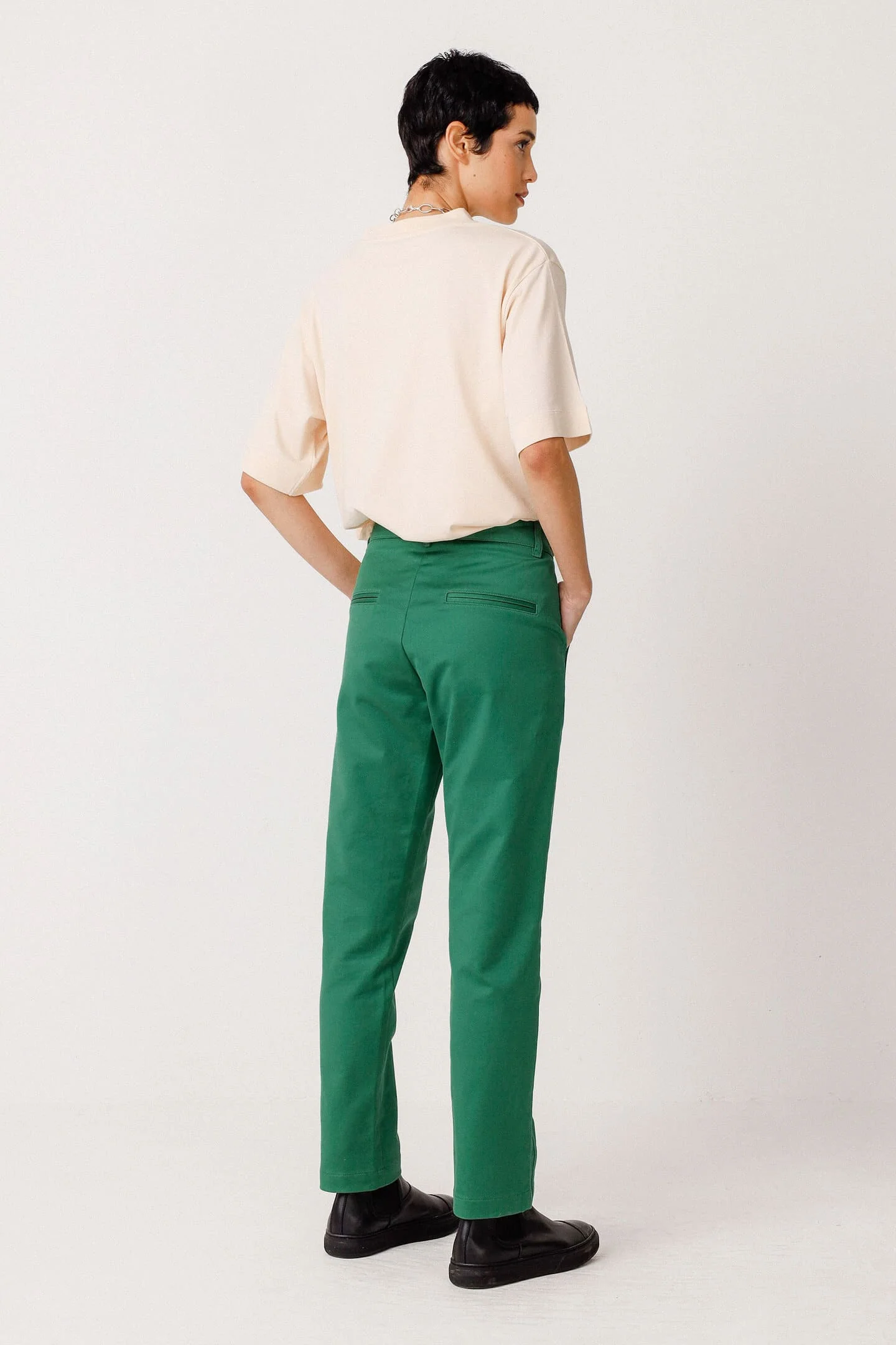 Ce pantalon femme vert en coton bio, qui arrive à la cheville est un basique bien coupé.