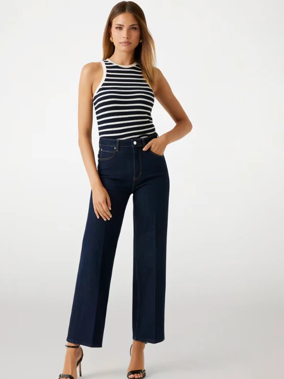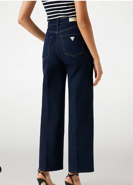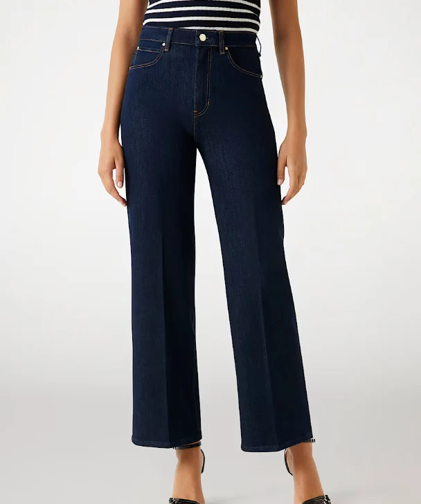 Jean stretch jambe large avec lavage foncé. Construction à cinq poches. Taille haute confortable et coupe décontractée. Fermeture par bouton et glissière.