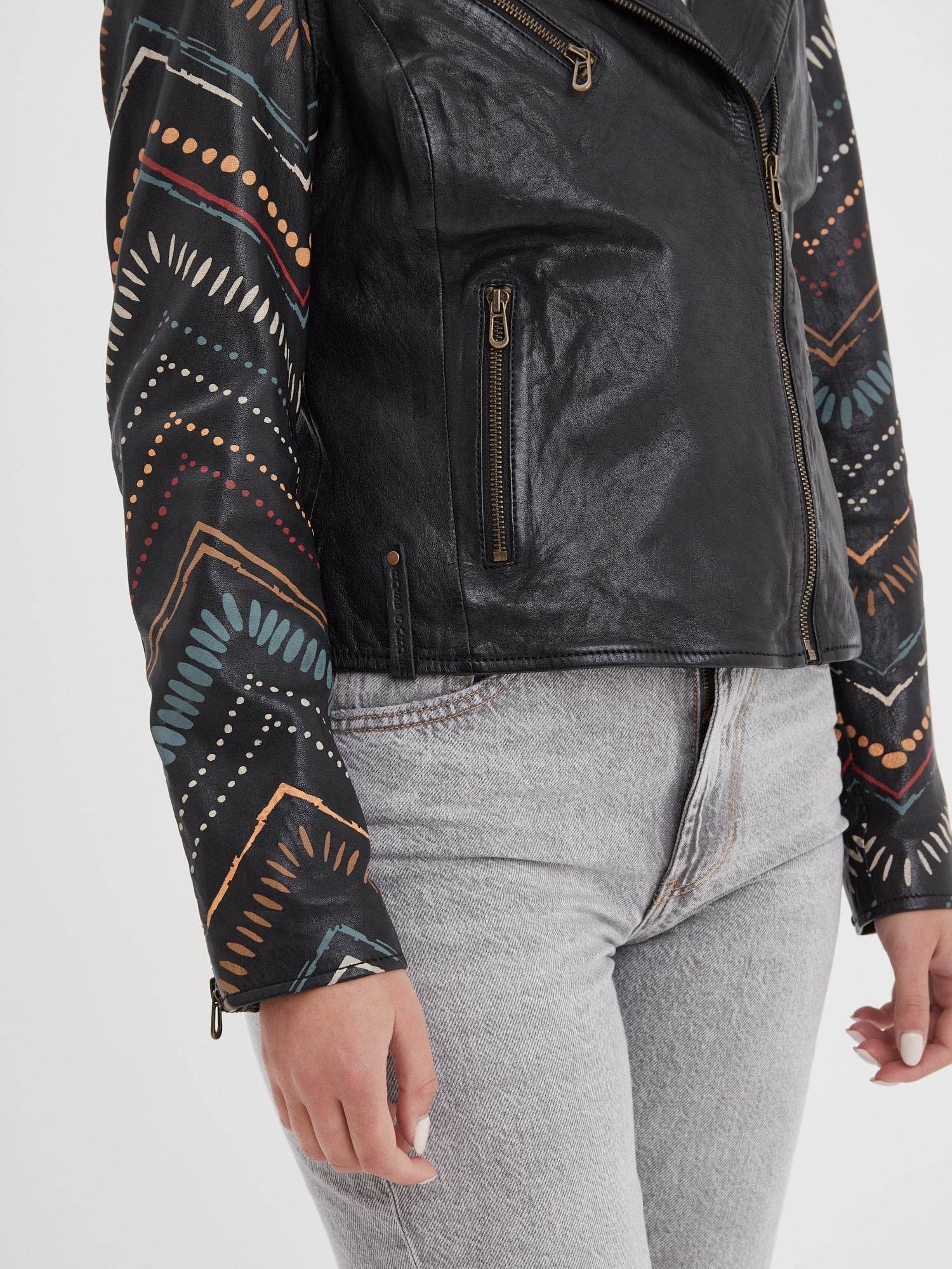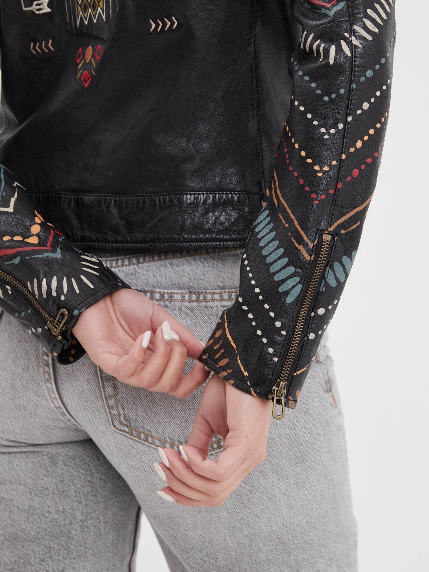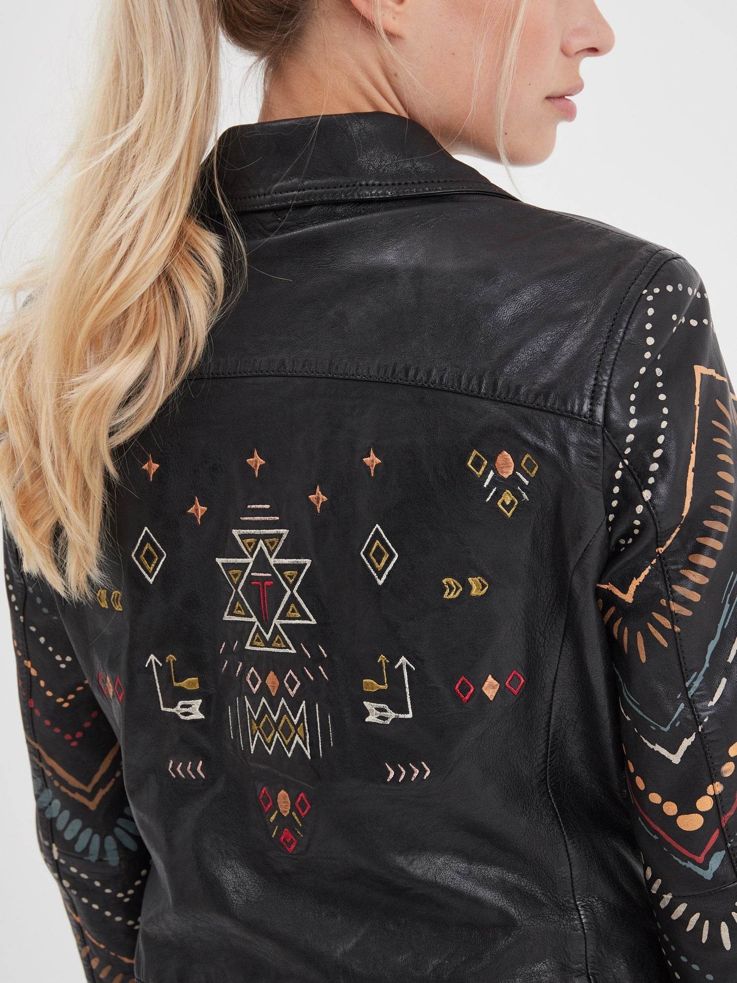 Ce blouson en cuir au look original reprend des visuels inspirés de la période Amérindienne. Les motifs sont imprimés au bras et en broderie dans le dos.
