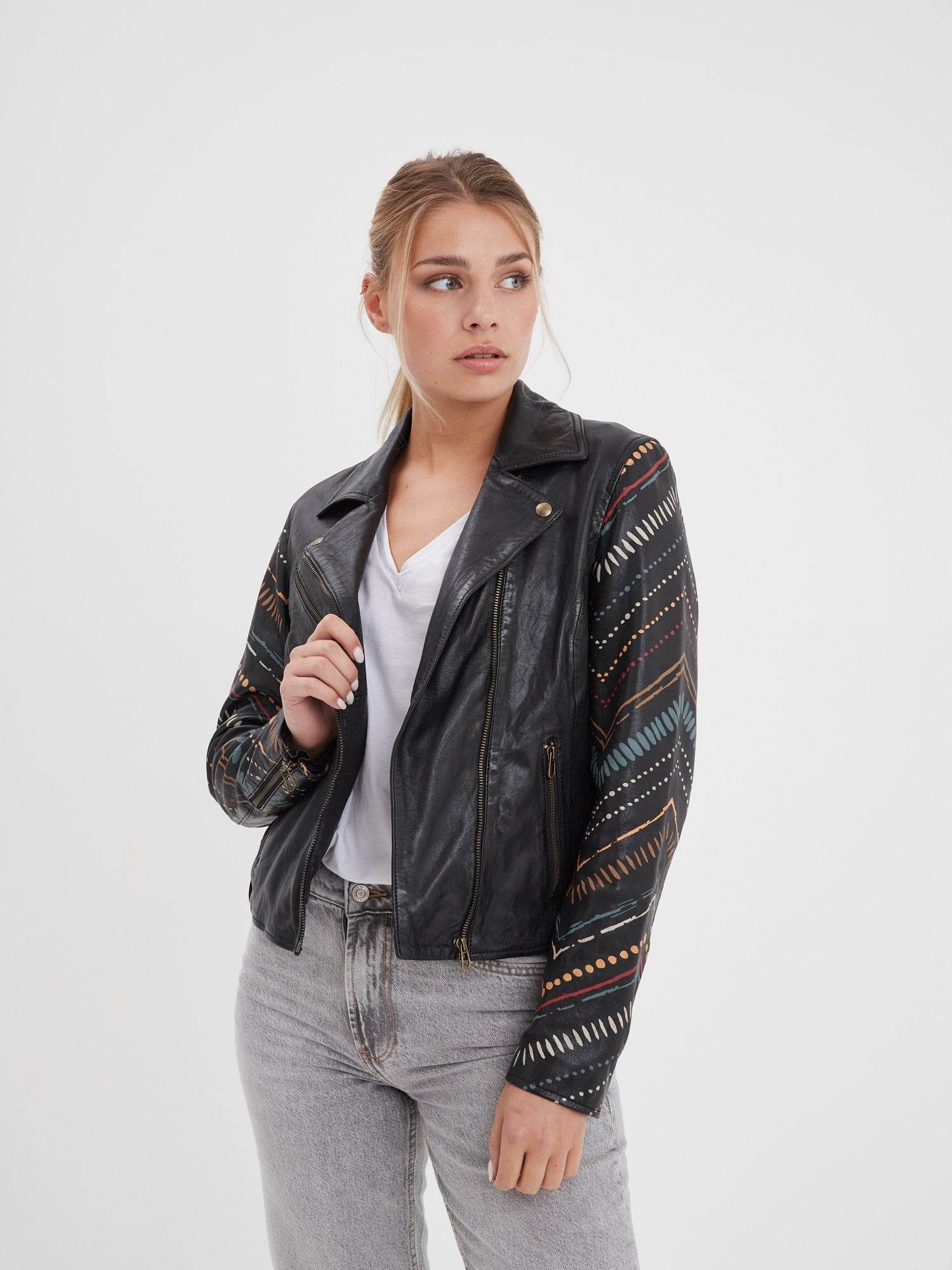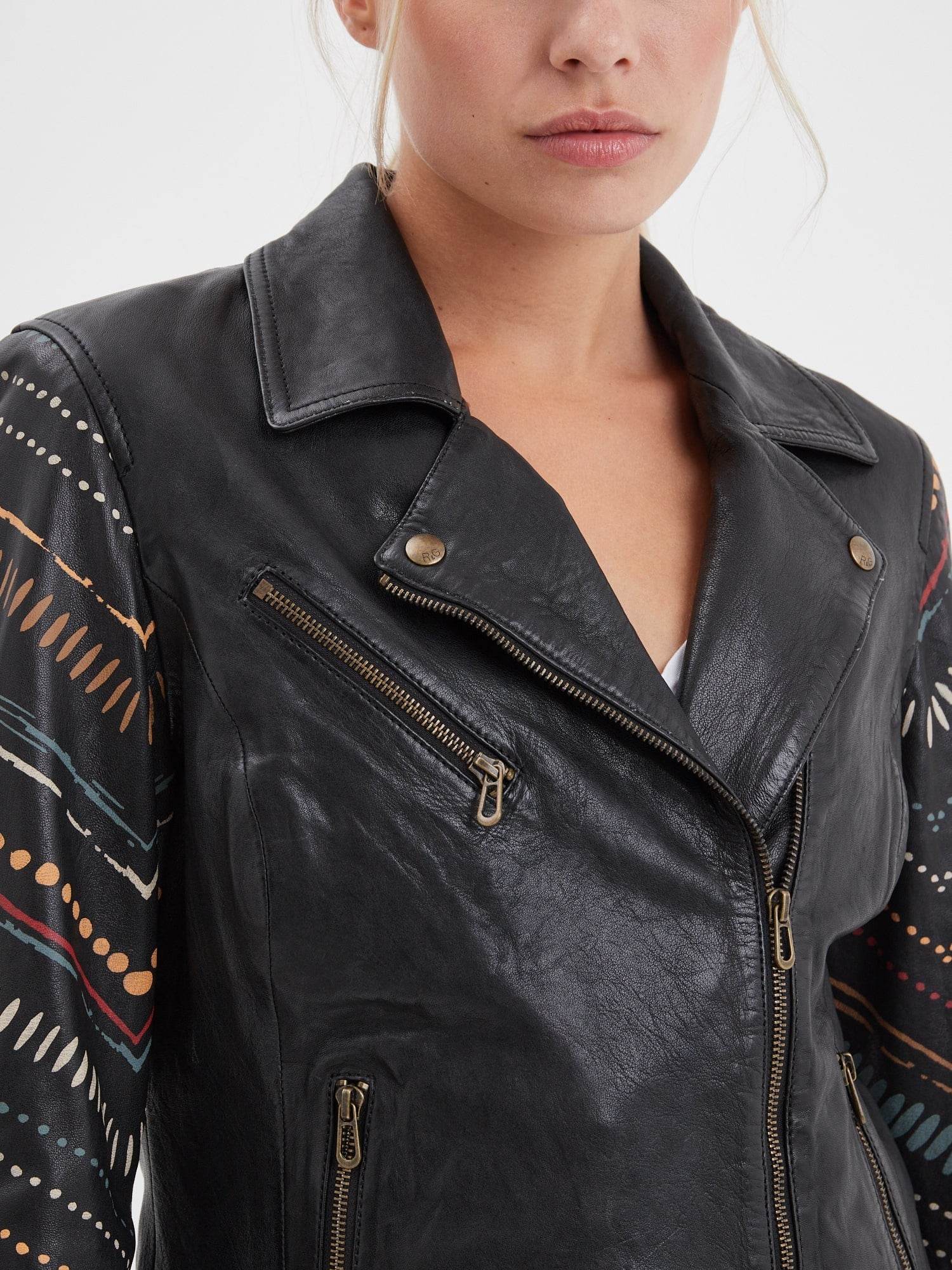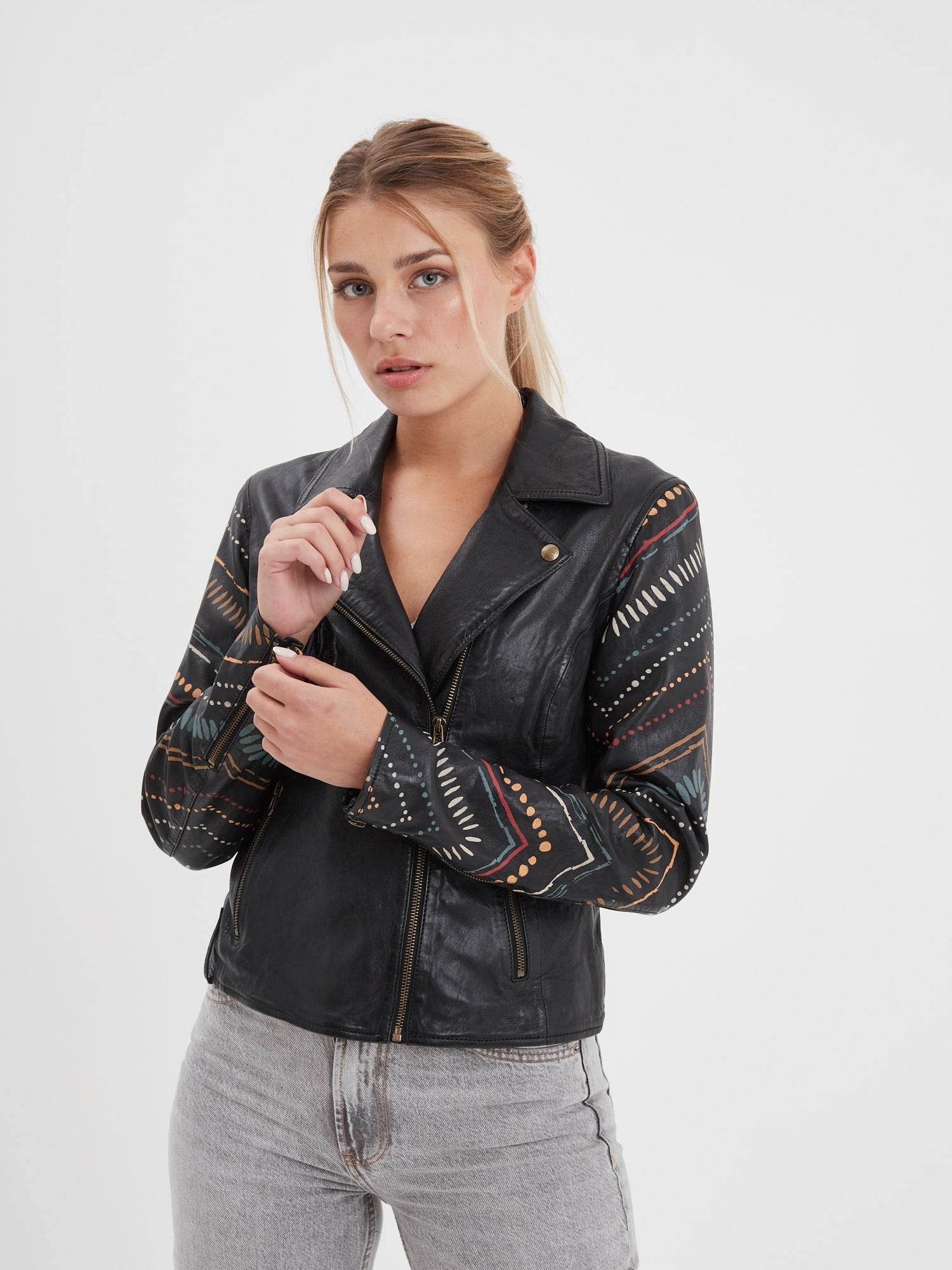 Ce blouson en cuir au look original reprend des visuels inspirés de la période Amérindienne. Les motifs sont imprimés au bras et en broderie dans le dos.