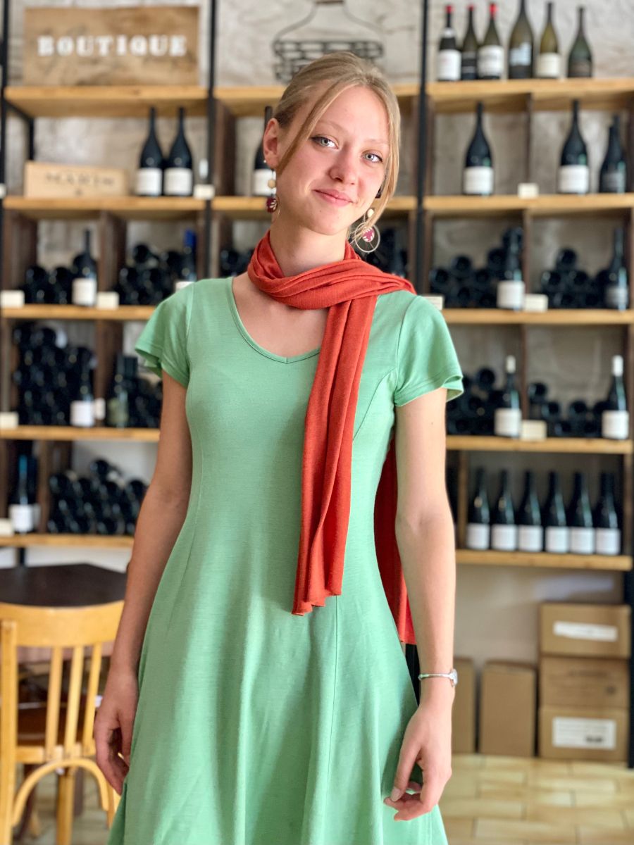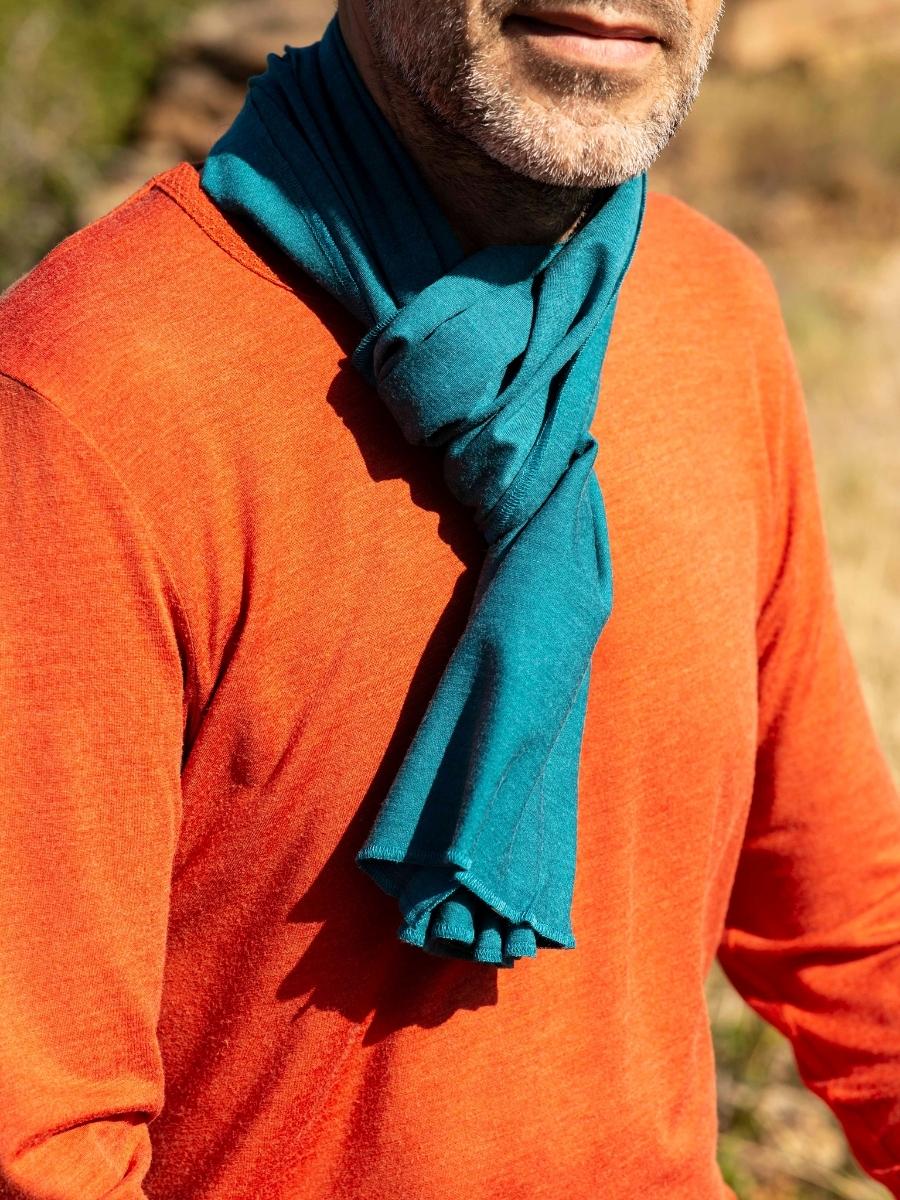 Bien enroulé autour du cou ou jeté délicatement sur l’épaule, le p’tit chèche (40x150cm) est réalisé en jersey ou nid d’abeille 70% laine biologique et 30% soie naturelle ou en jersey Lycra 66,5% laine mérinos biologique, 28,5% soie naturelle et 5% élasthanne