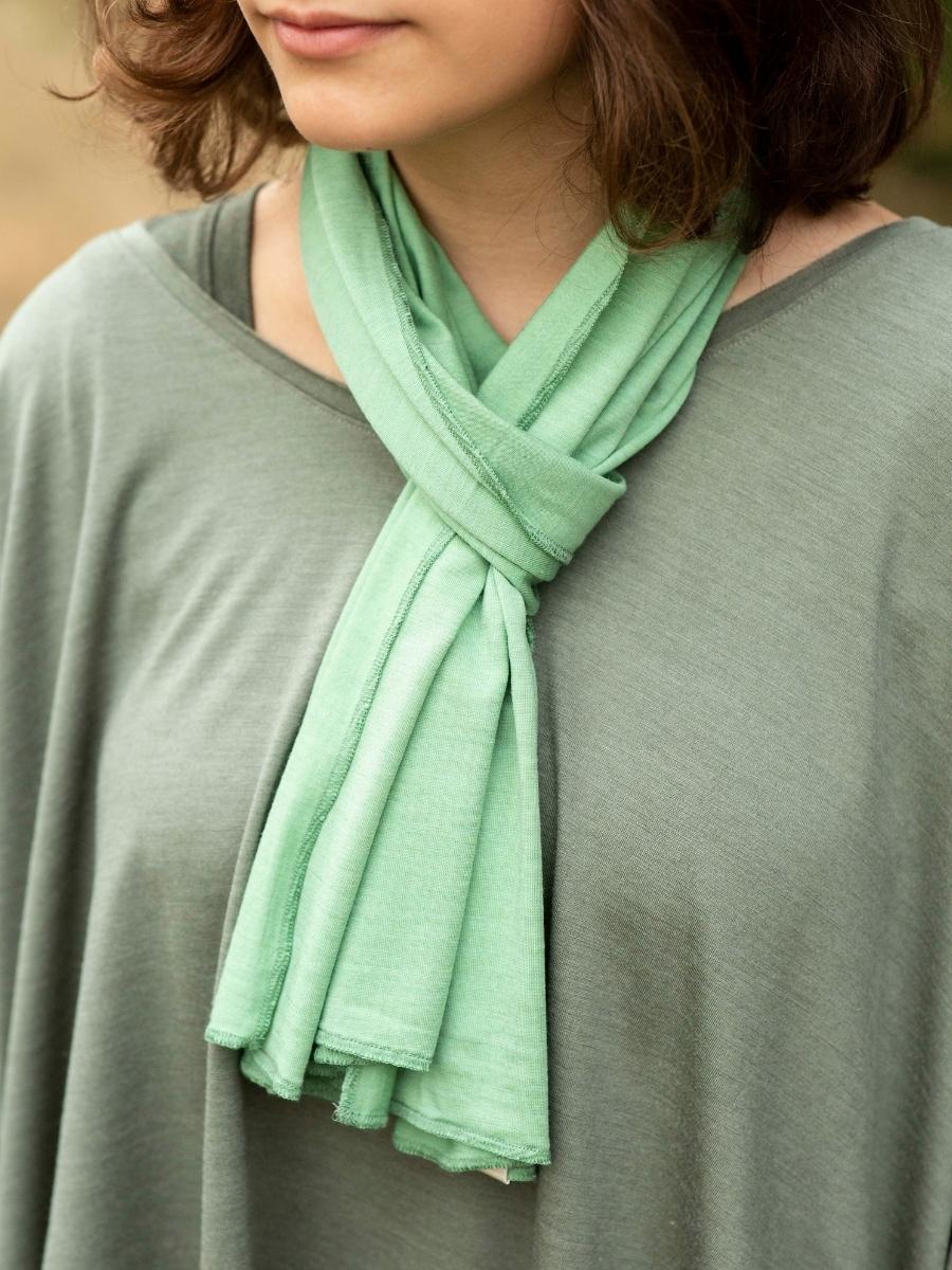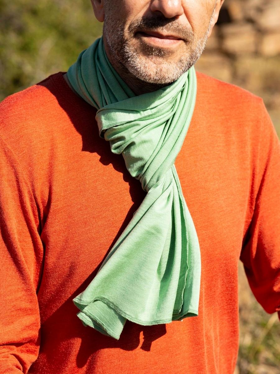 Bien enroulé autour du cou comme une écharpe ou jeté délicatement sur l’épaule, le p’tit chèche (40x150cm) est réalisé en jersey ou nid d’abeille 70% laine mérinos biologique et 30% soie naturelle ou en jersey Lycra 66,5% laine mérinos biologique, 28,5% soie naturelle et 5% élasthanne
