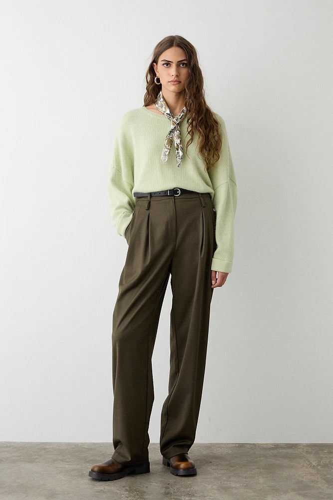 Pull avec hémile inversé sur les manches, toucher doux, coupe ample, encolure droite, manches longues