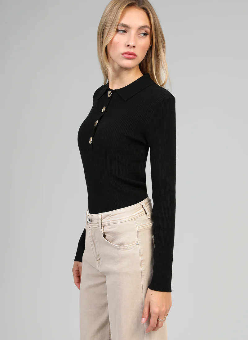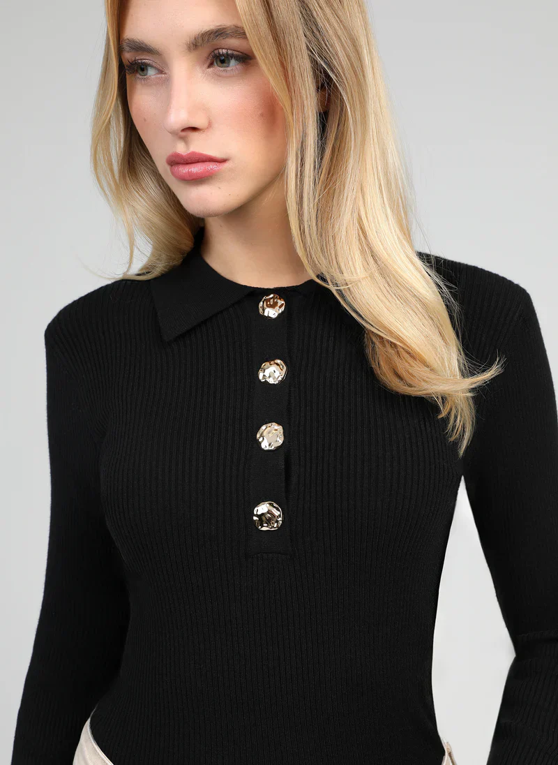 PULL Col polo Manches longues Maille côtelée Coupe ajustée A adopter pour un style glamour et féminin Boutons métal