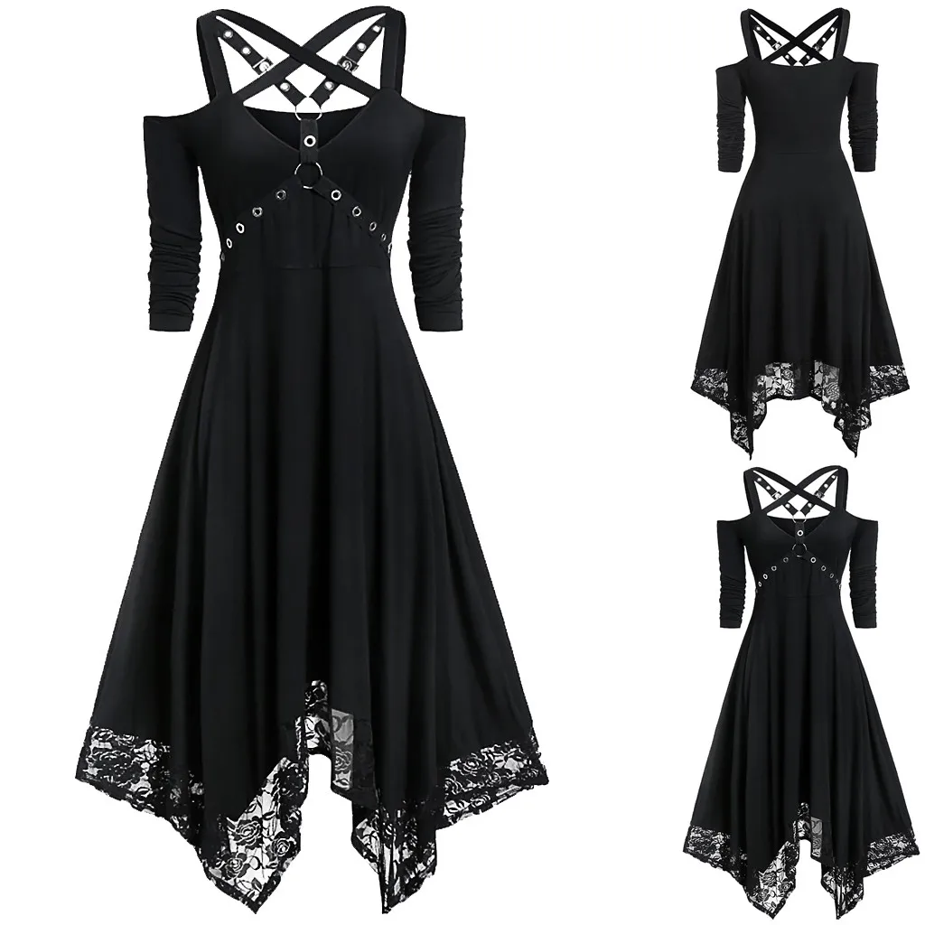 Découvrez cette magnifique robe à épaules dénudées gothique, une pièce incontournable pour toute garde-robe alternative. Son design élégant et mystérieux, accentué par des manches longues et des bretelles croisées, est parfait pour celles qui cherchent à ajouter une touche de glamour sombre à leur style. La dentelle délicate qui orne l’ourlet asymétrique ajoute une touche de féminité et de sophistication.