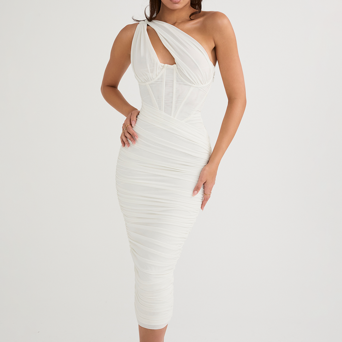 L’alliance du sensuel et de l’élégant se retrouve parfaitement dans cette robe sans bretelles avec bretelle asymétrique. Le corset intégré mettra subtilement en valeur votre morphologie. Sa jupe évasée est particulièrement séduisante. Ajoutez des boucles d’oreilles et des escarpins élégants pour parfaire votre look.