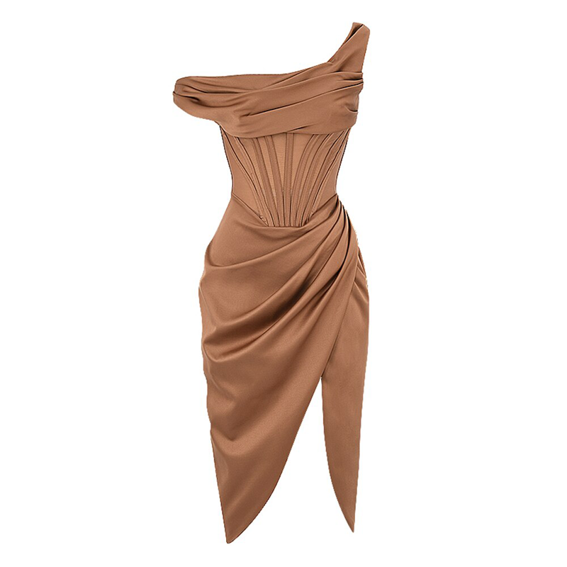 Cette robe bustier asymétrique marron avec épaule découverte vous offrira un look à la fois sensuel et raffiné. Son allure est sublimée par une fente latérale et un décolleté bénitier.