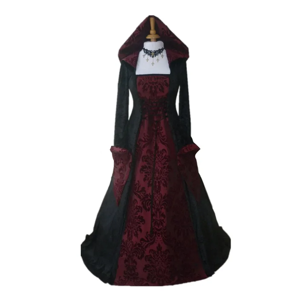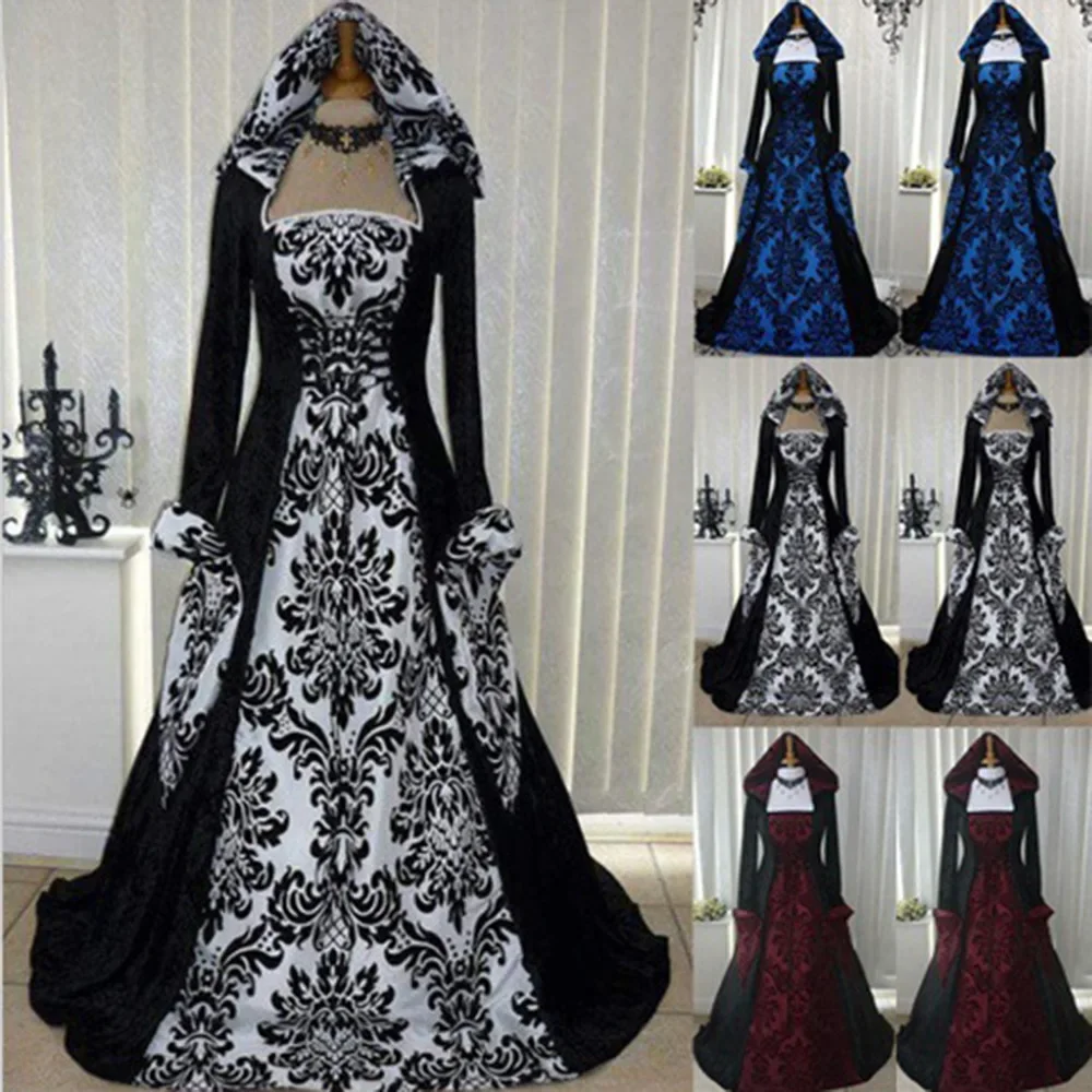 « Milady » évoque les fastes d’un palais ancien : une robe Renaissance femme à la silhouette A-line, longue jusqu’au sol, façonnée dans un somptueux motif damassé noir & blanc. Sa capuche drapée et ses manches longues soulignent un style à la fois médiéval, gothique et romantique, idéal pour bal costumé, festival ou cosplay. Le tombé fluide et la taille naturelle dessinent une ligne royale qui magnifie la démarche.