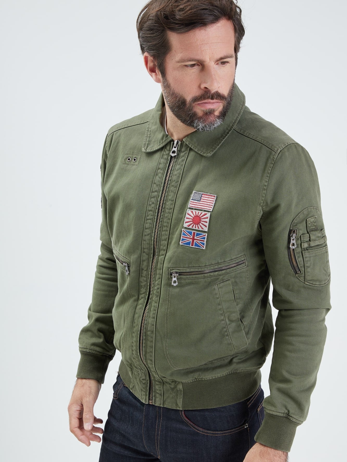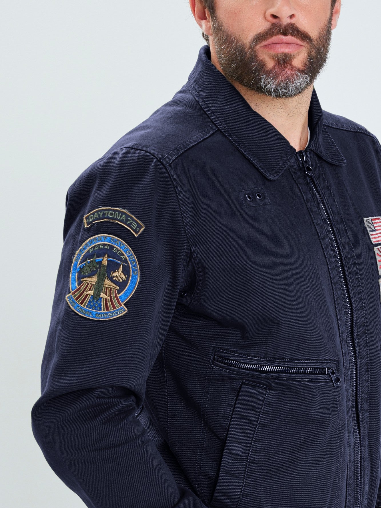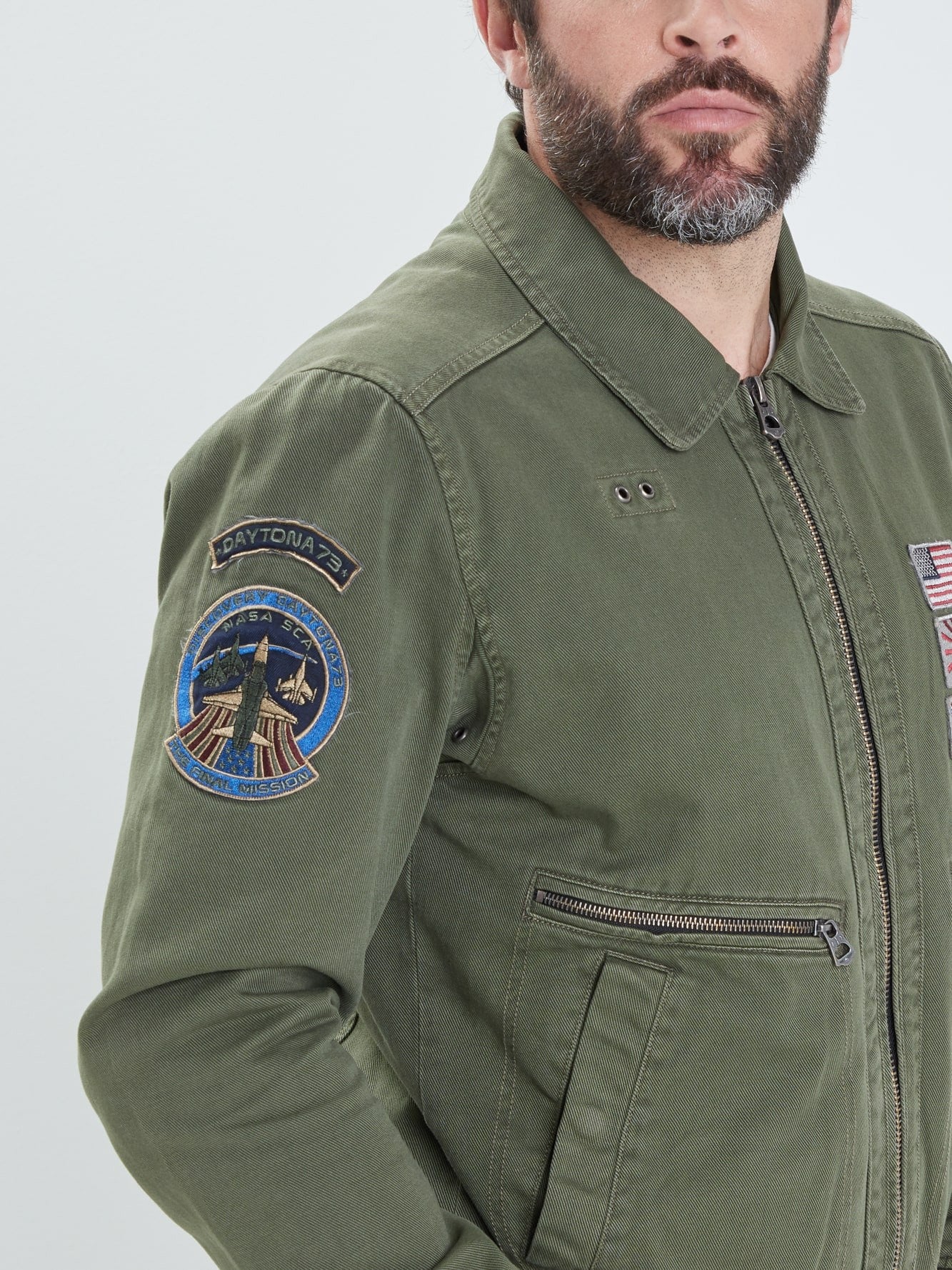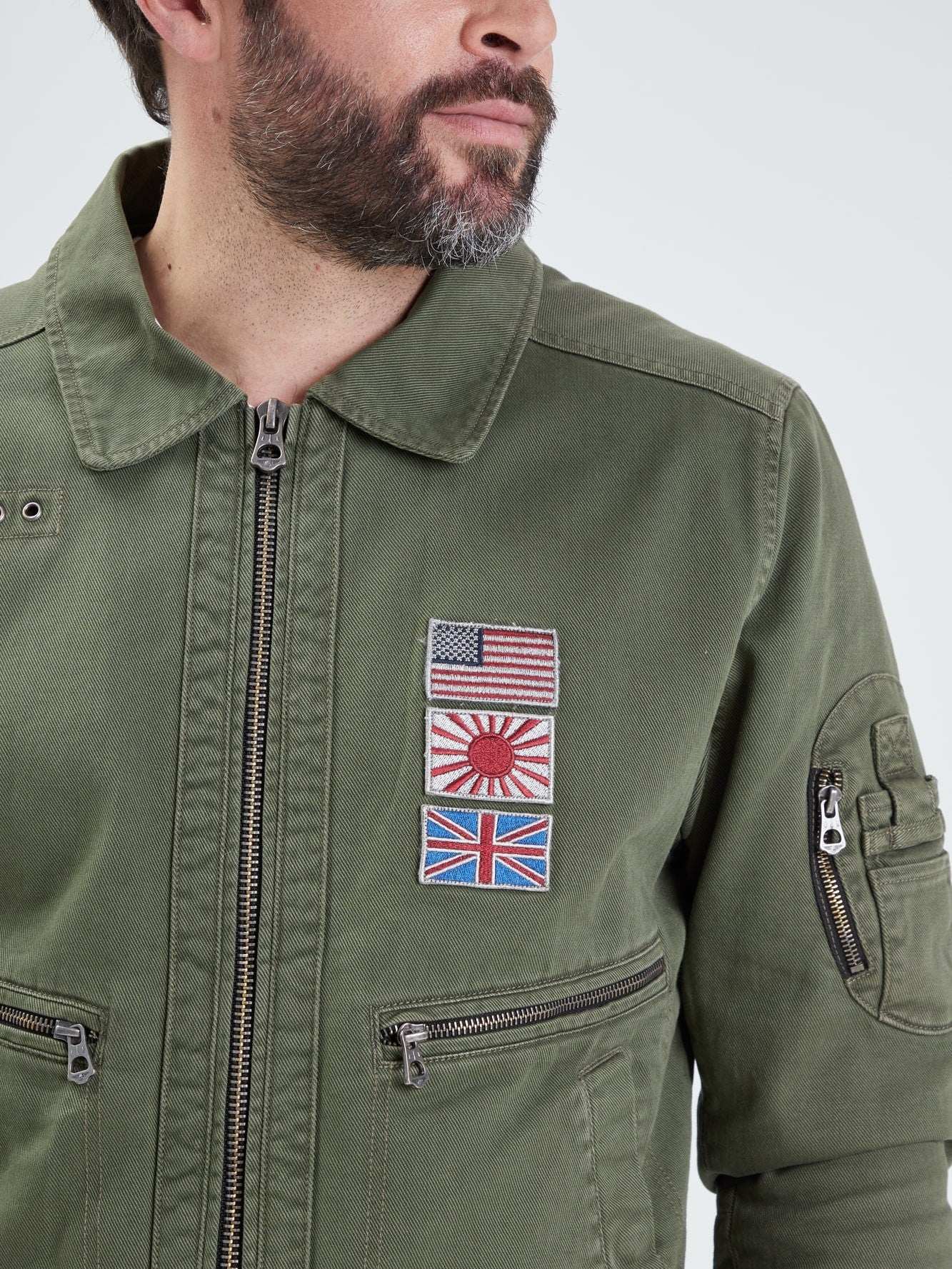 Cette veste style worker fait partie de notre gamme inspiration army fabriquée en coton twill. Les patchs brossés lui donne un aspect vintage.