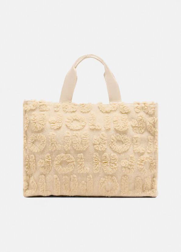 Dimensions : 40 x 30 x 20 cm Shopper noir Réalisé en tissu enduit effet peau de mouton Détails teddy Logo brodé Clous appliqués Poignées pratiques Bandoulière en gros-grain logoté réglable et amovible Poche intérieure zippée Fermeture zippée Cet accessoire peut être porté aussi en bandoulière et/ou épaule