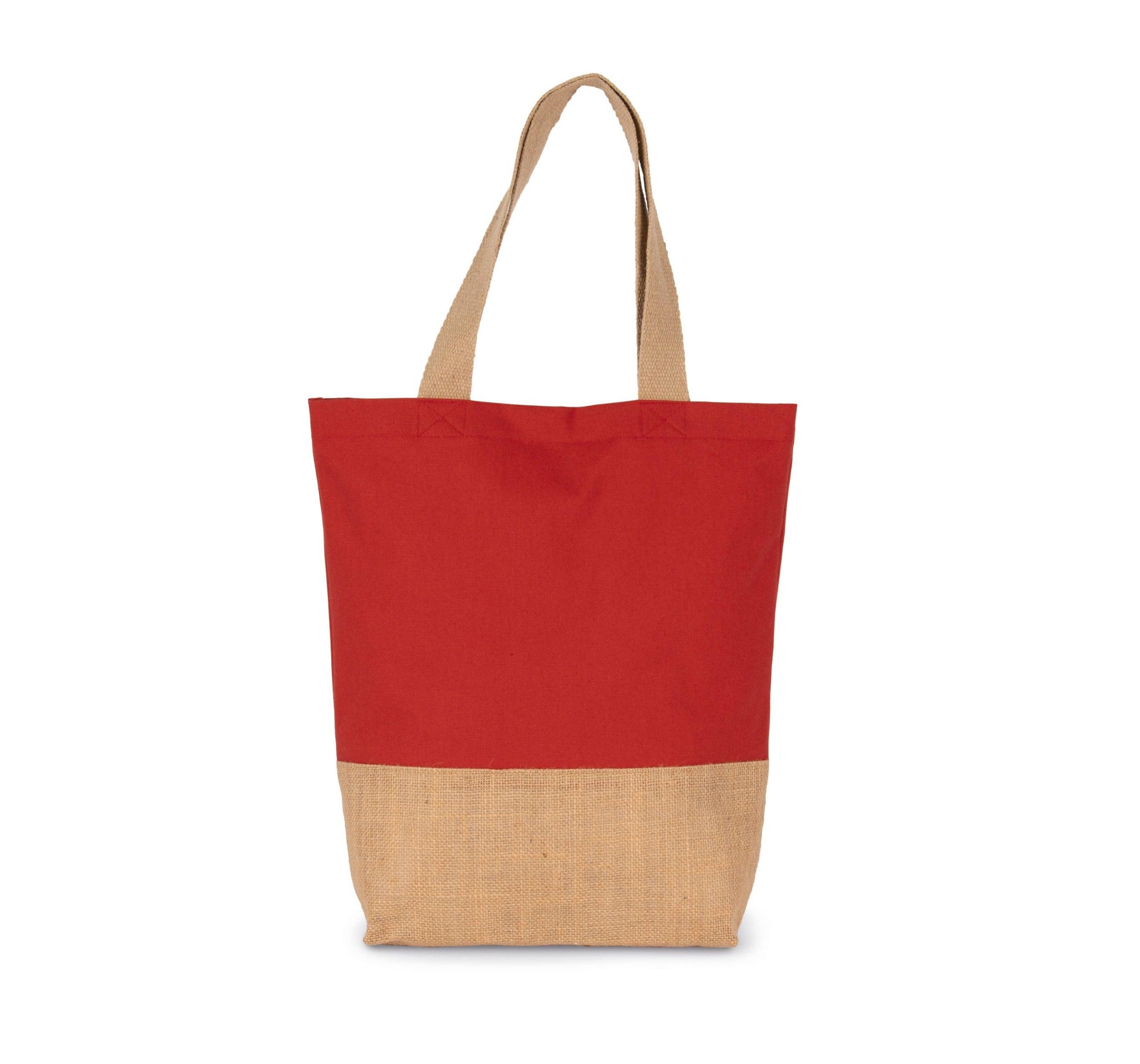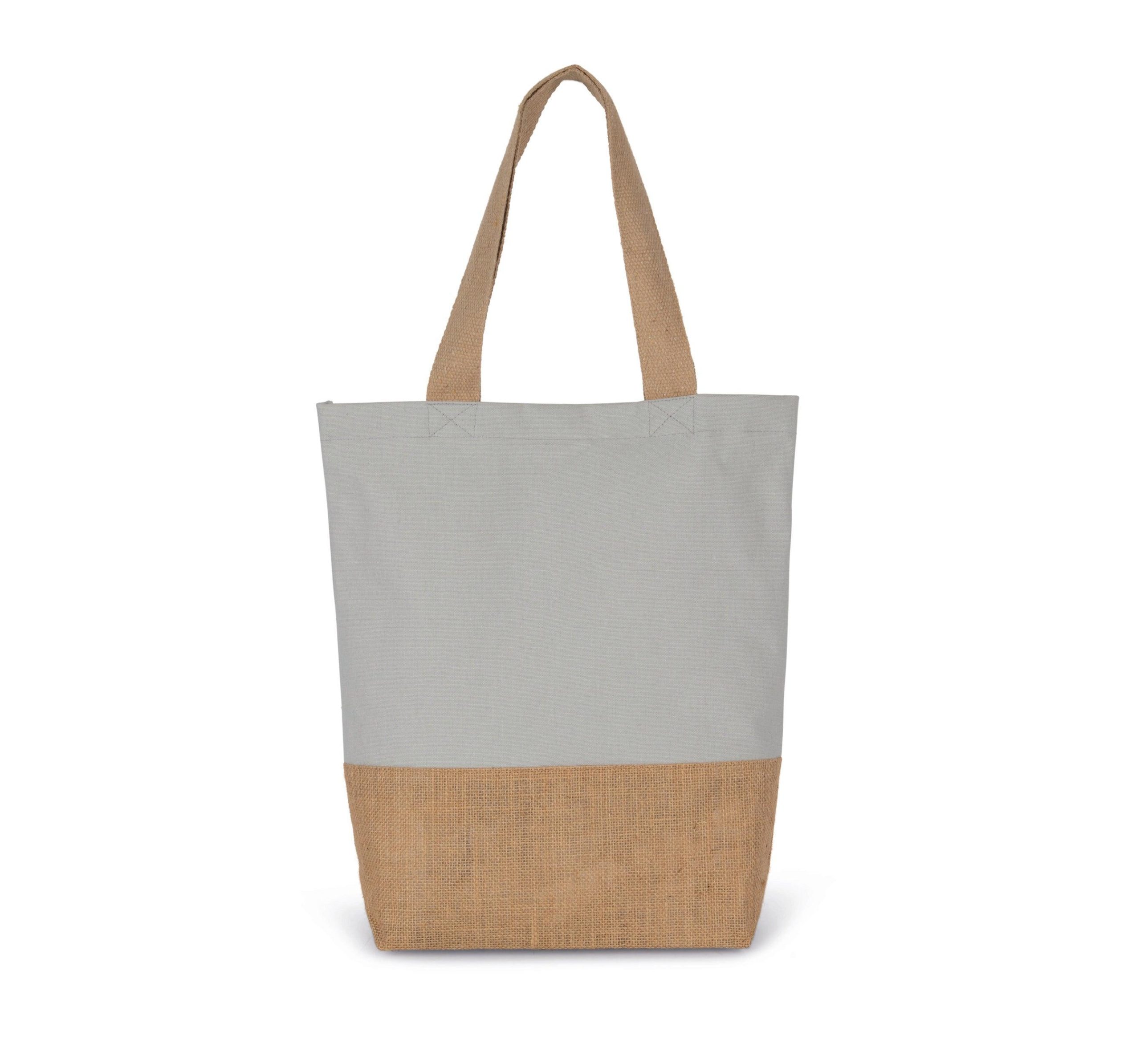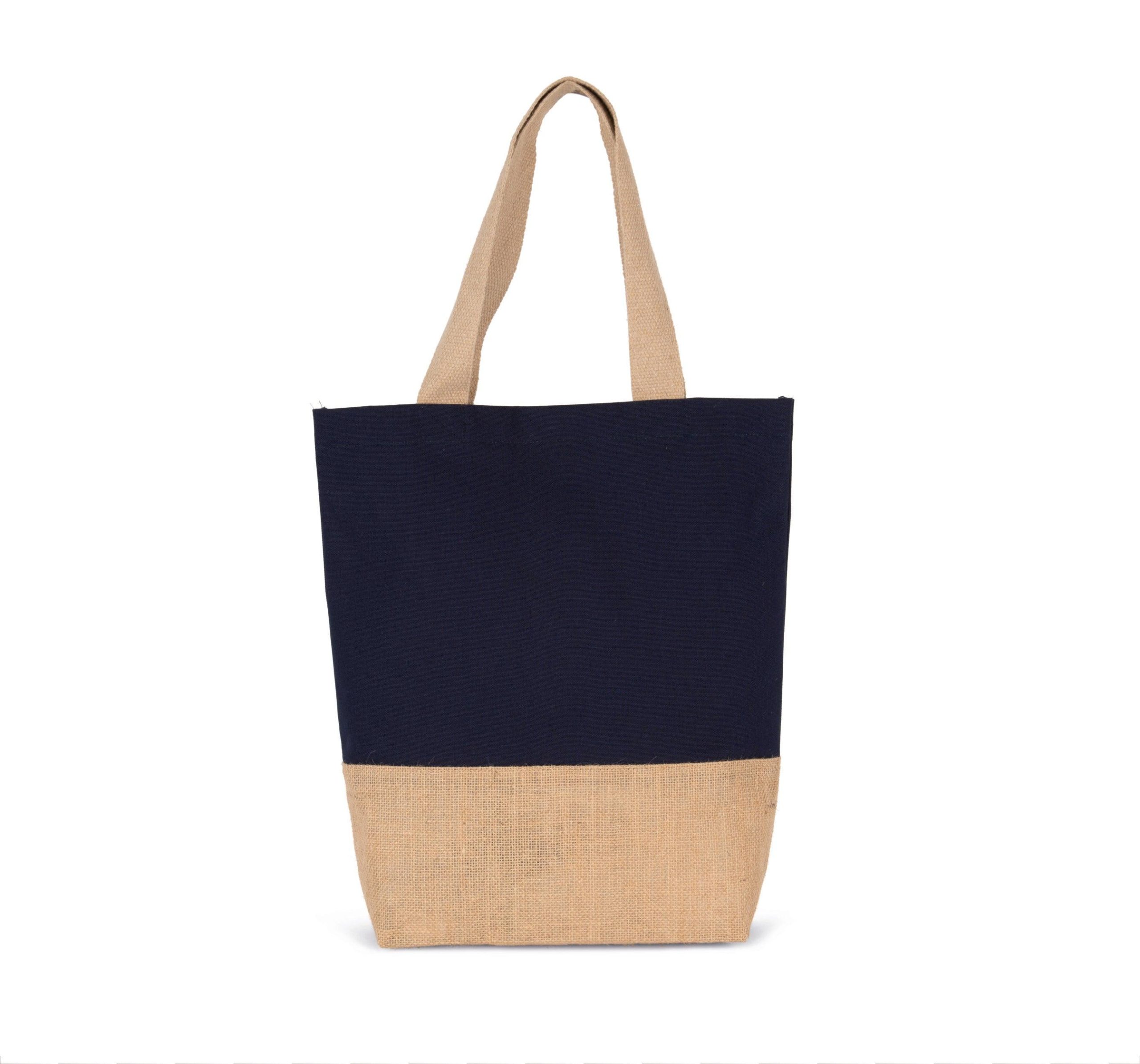 100% jute + 100% coton. Sac de shopping classique composé d’un panneau inférieur en jute laminée et d’un panneau principal en coton pour faciliter la personnalisation. Poignées en coton.