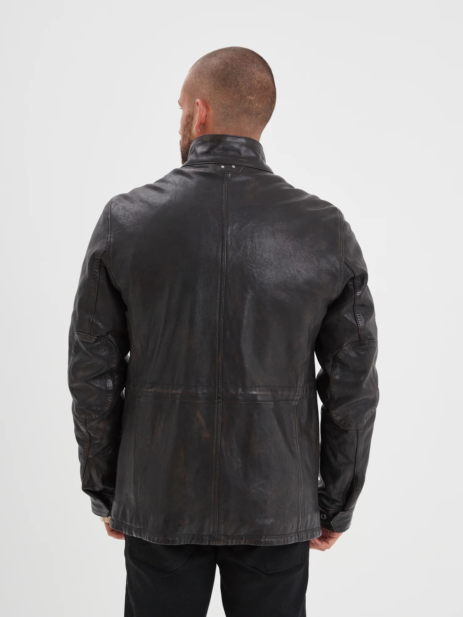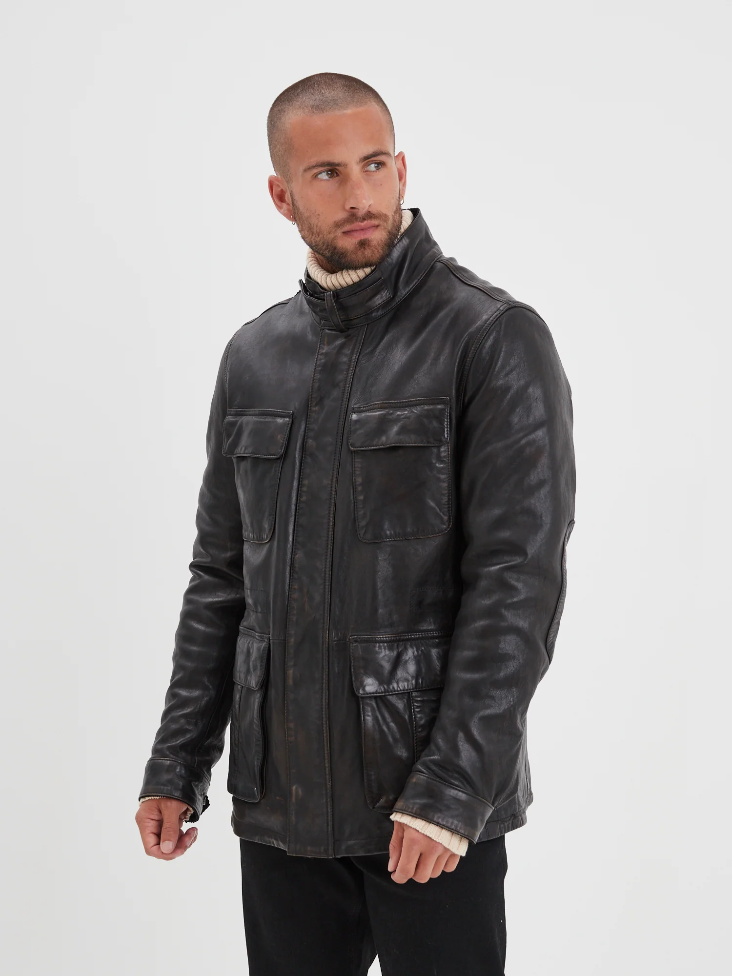 Découvrez cette veste en cuir d’agneau vieilli, une pièce intemporelle qui allie confort, style et durabilité. Son cuir souple et léger, spécialement travaillé pour offrir un fini vieilli, lui confère un aspect unique et élégant.
