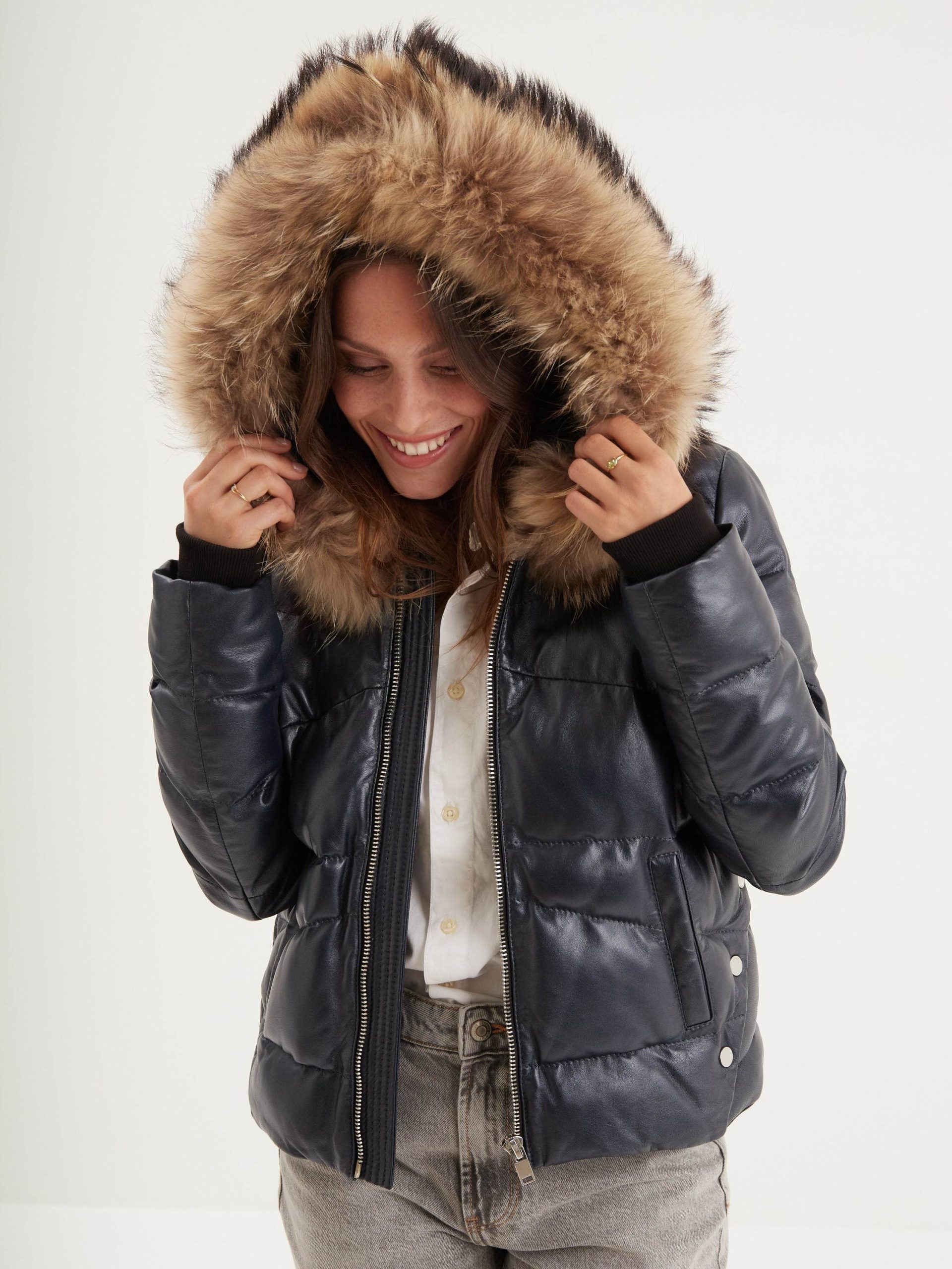 C’est la doudoune tendance du dressing féminin pour l’hiver. Ce modèle au style loose est fabriqué en cuir d’agneau effet métallique et possède une capuche en fourrure véritable qui est amovible. Attention: Ce modèle possède une coupe très ajustée. Il est conseillé de choisir une taille au-dessus.