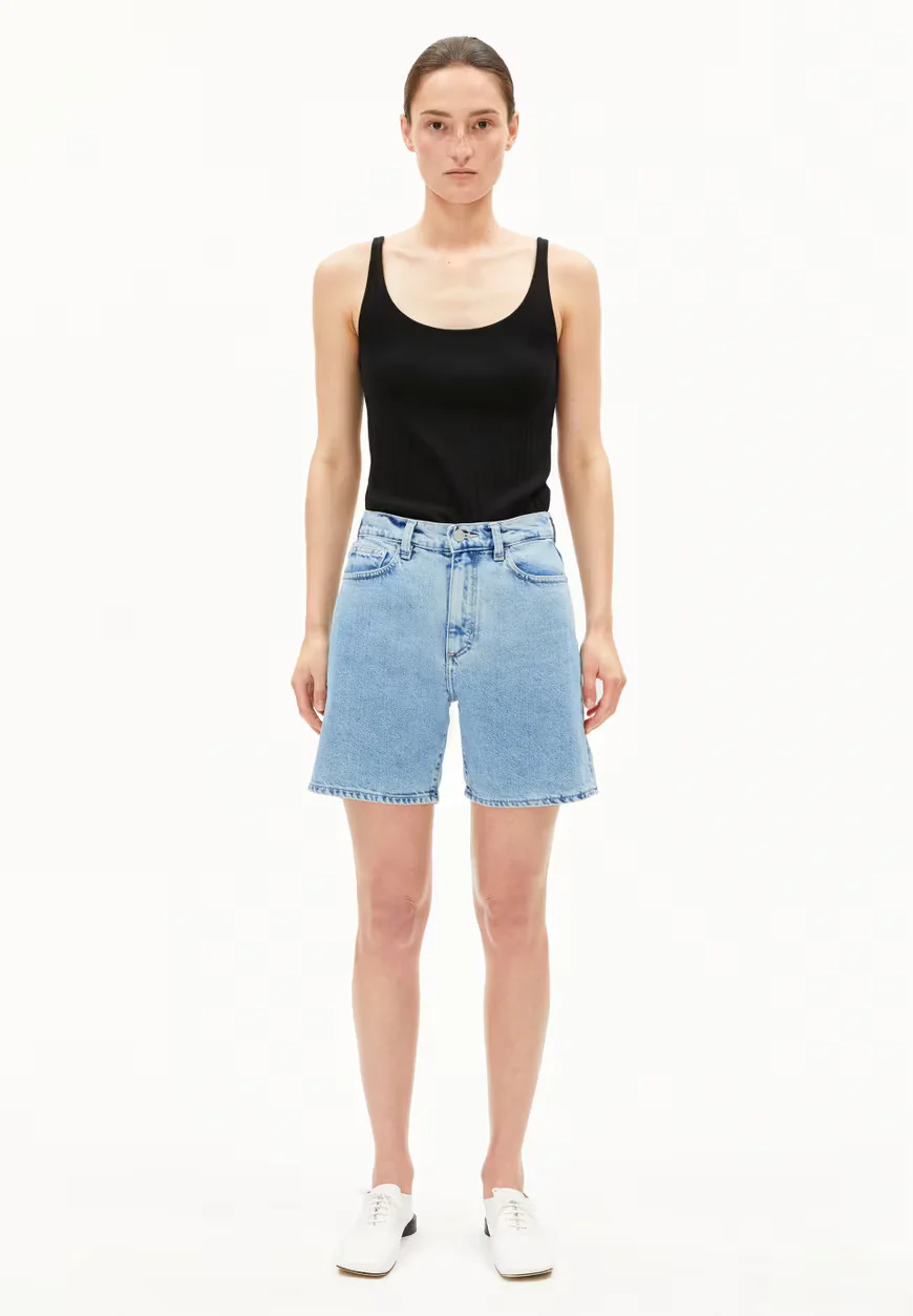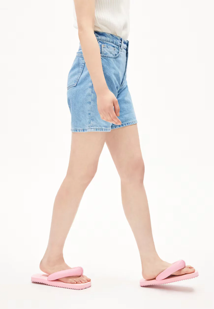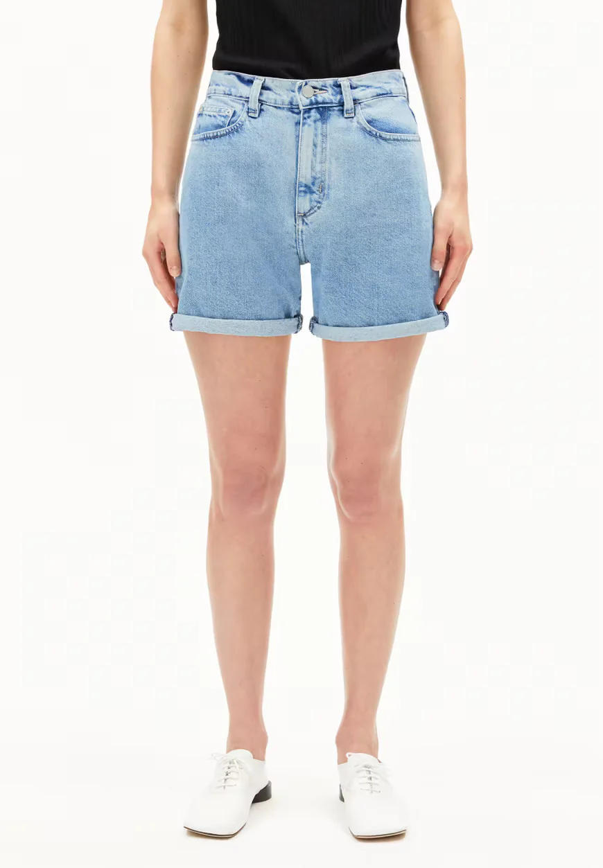 Ce short en jean femme, en coton recyclé, bleu délavé allie style décontracté et engagement écologique. Son denim doux et durable offre un confort optimal tout en apportant une touche moderne à votre look.
