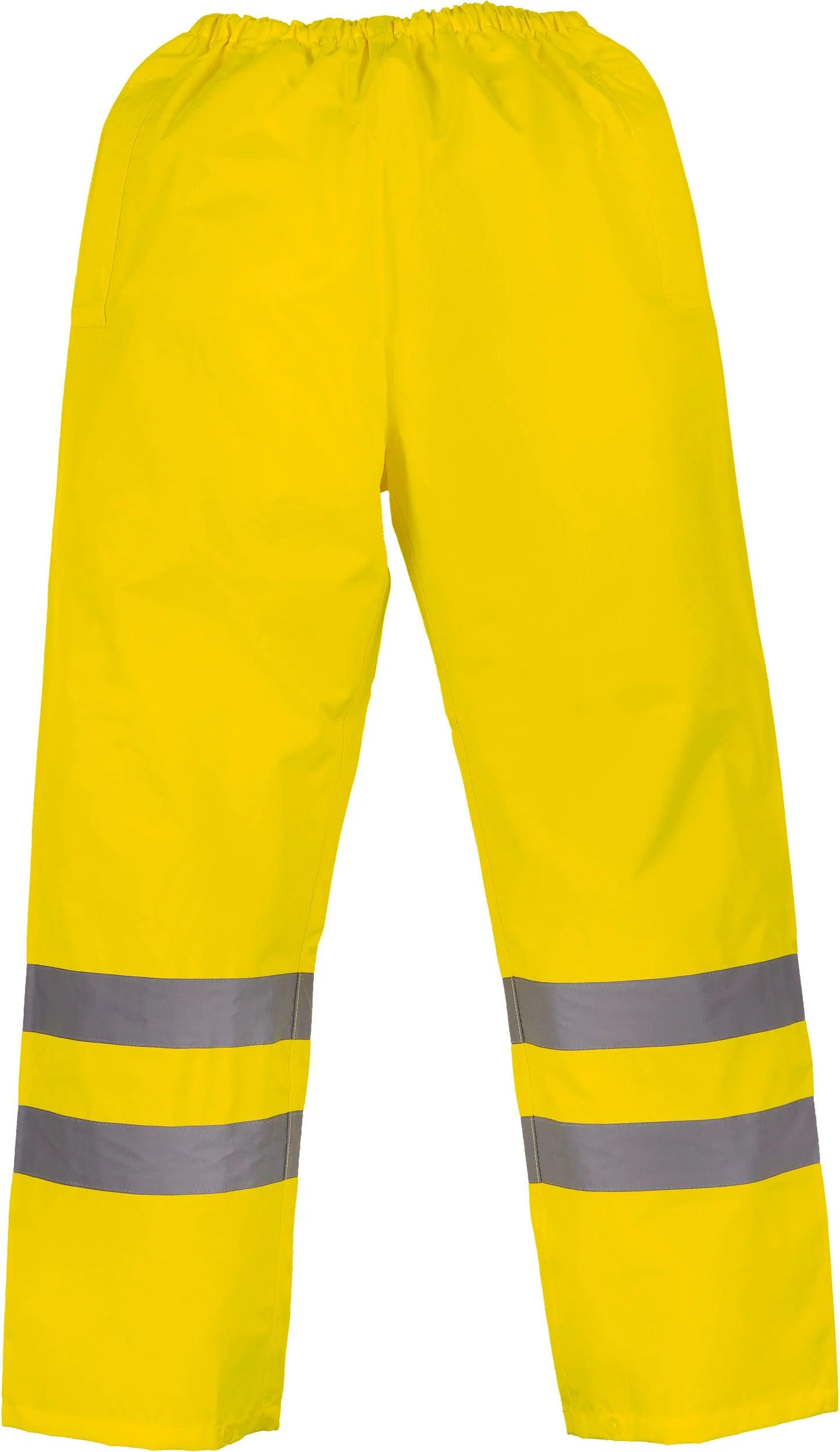 100% polyester. Revêtement Oxford PU. Imperméable. Deux bandes réfléchissantes de 5 cm de large au bas des jambes. Ceinture élastiquée. Boutons pressions au bas pour le réglage. Coutures cousues et collées. Conforme aux normes EN ISO20471:2013 catégorie 1 et EN343 relative à la protection contre le mauvais temps : uniquement Hi Vis Yellow, Hi Vis Yellow/Navy, Hi Vis Orange et Hi Vis Orange/Navy. Egalement conforme à la norme relative aux ‘Vêtements de Haute Visibilité’ des chemins de fer UK GO/RT 3279 Issue 8:2013 (Hi Vis orange et Hi Vis orange/navy).