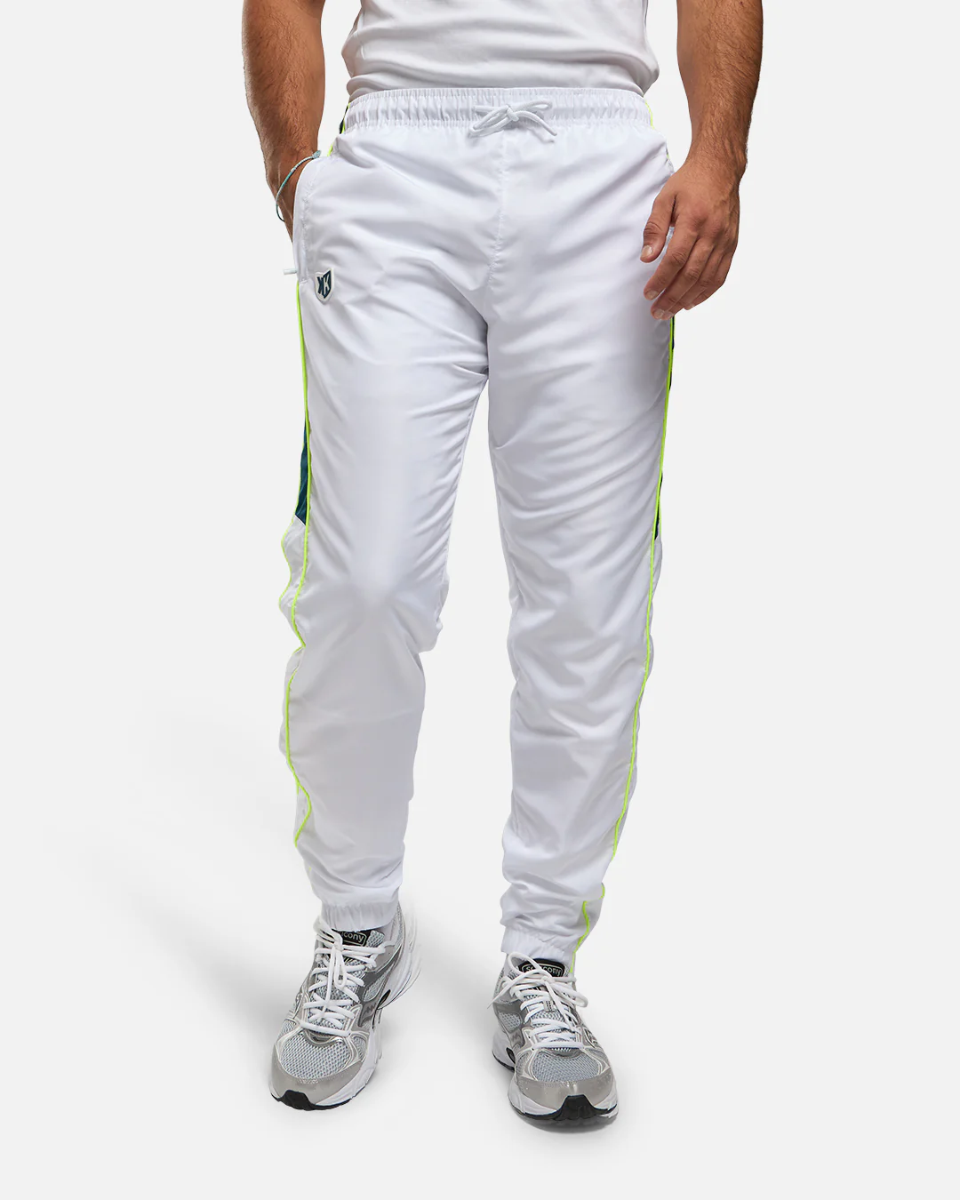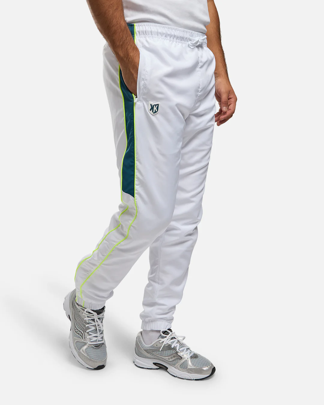 Le pantalon assorti, majoritairement blanc, reprend les mêmes détails colorés sur les côtés pour une harmonie parfaite. Sa coupe fuselée assure un maintien optimal et une grande liberté de mouvement, que ce soit pour le sport ou pour le quotidien.