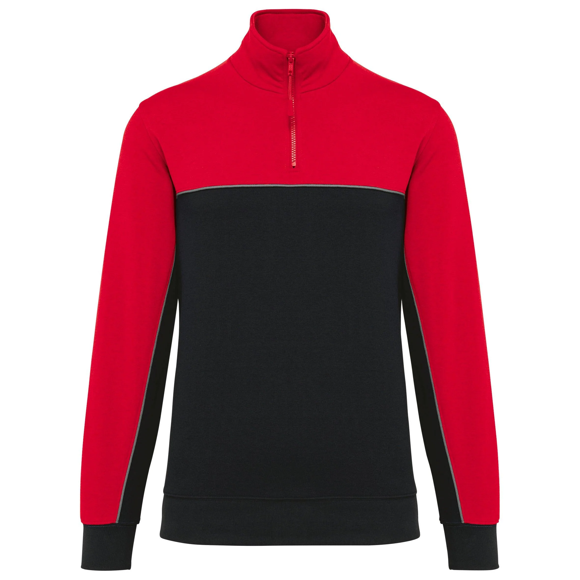 60% coton biologique / 40% polyester recyclé. Molleton gratté 3 fils LSF (Low Shrinkage Fleece). Coupe ajustée. Manches montées. Col avec zip plastique et tire-zip ton sur ton recyclé. Bande de propreté contrastée en chevron. Finition demi-lune encolure dos pour faciliter la personnalisation de marque à l’intérieur. Passepoil contrasté entre les parties du vêtement bicolores (corps et manches devant et dos). Bord-côte 1×1 au bas de manche et de vêtement. Porte-stylo élastiqué 3 compartiments sur la manche gauche au porter. Etiquette de marque Tear Away.