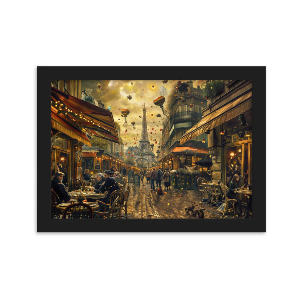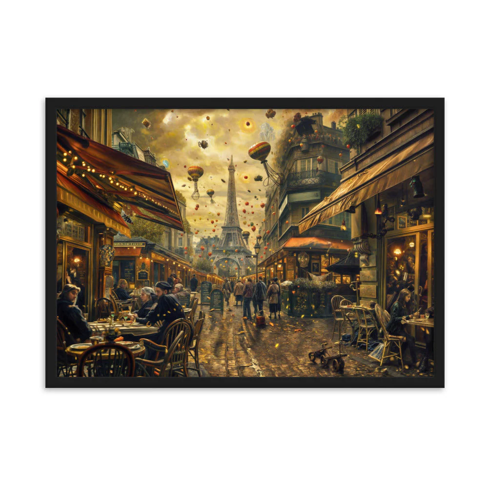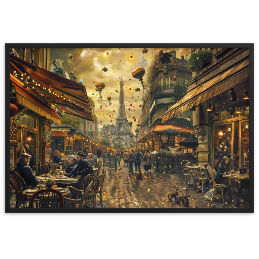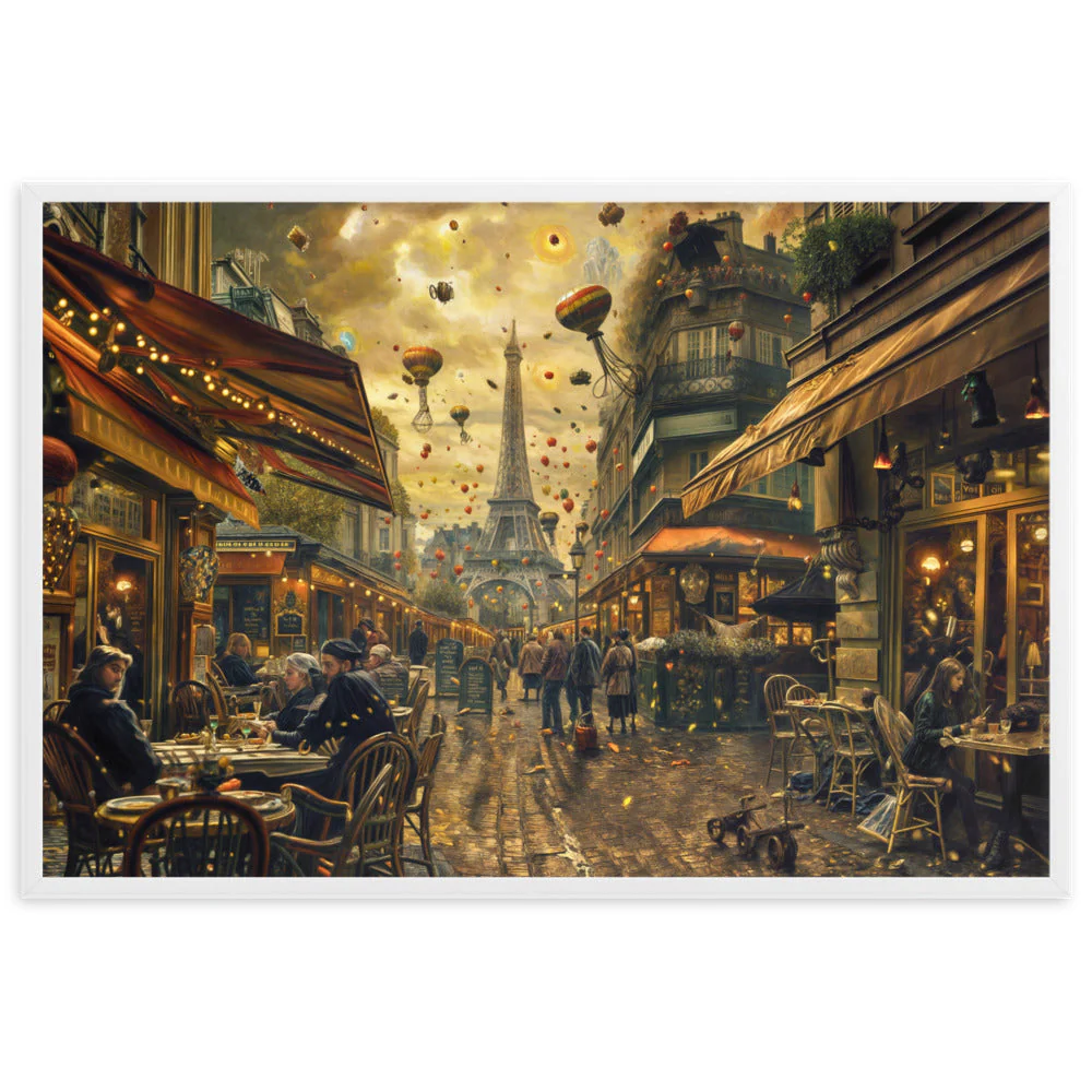 Notre toile murale dépeint une scène de vie quotidienne au cœur de Paris, rehaussée d’éléments surréalistes. Les silhouettes peintes avec soin évoquent l’effervescence des cafés, tandis que le ciel parsemé de montgolfières apporte une dimension poétique et steampunk, parfait pour décorer votre espace avec originalité.