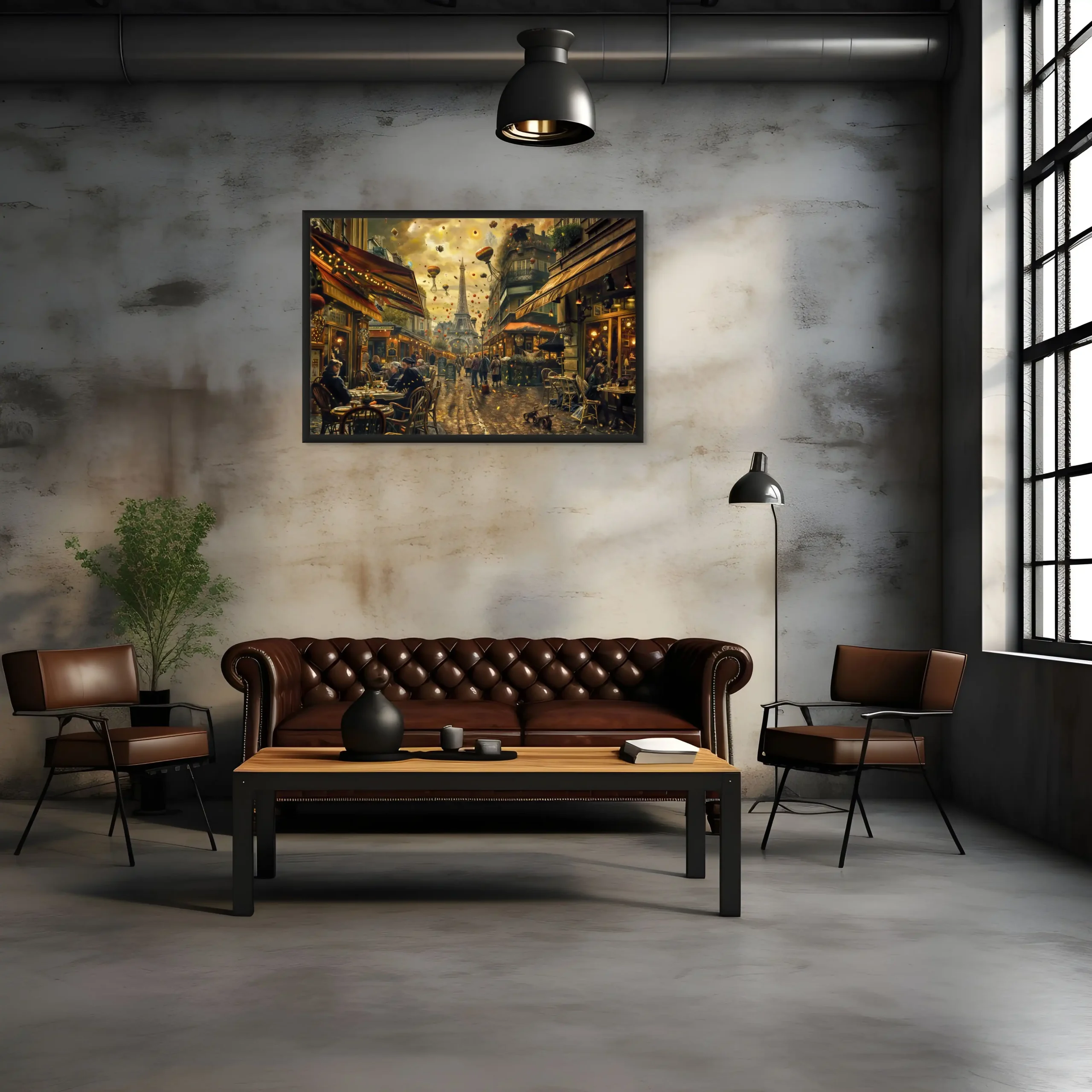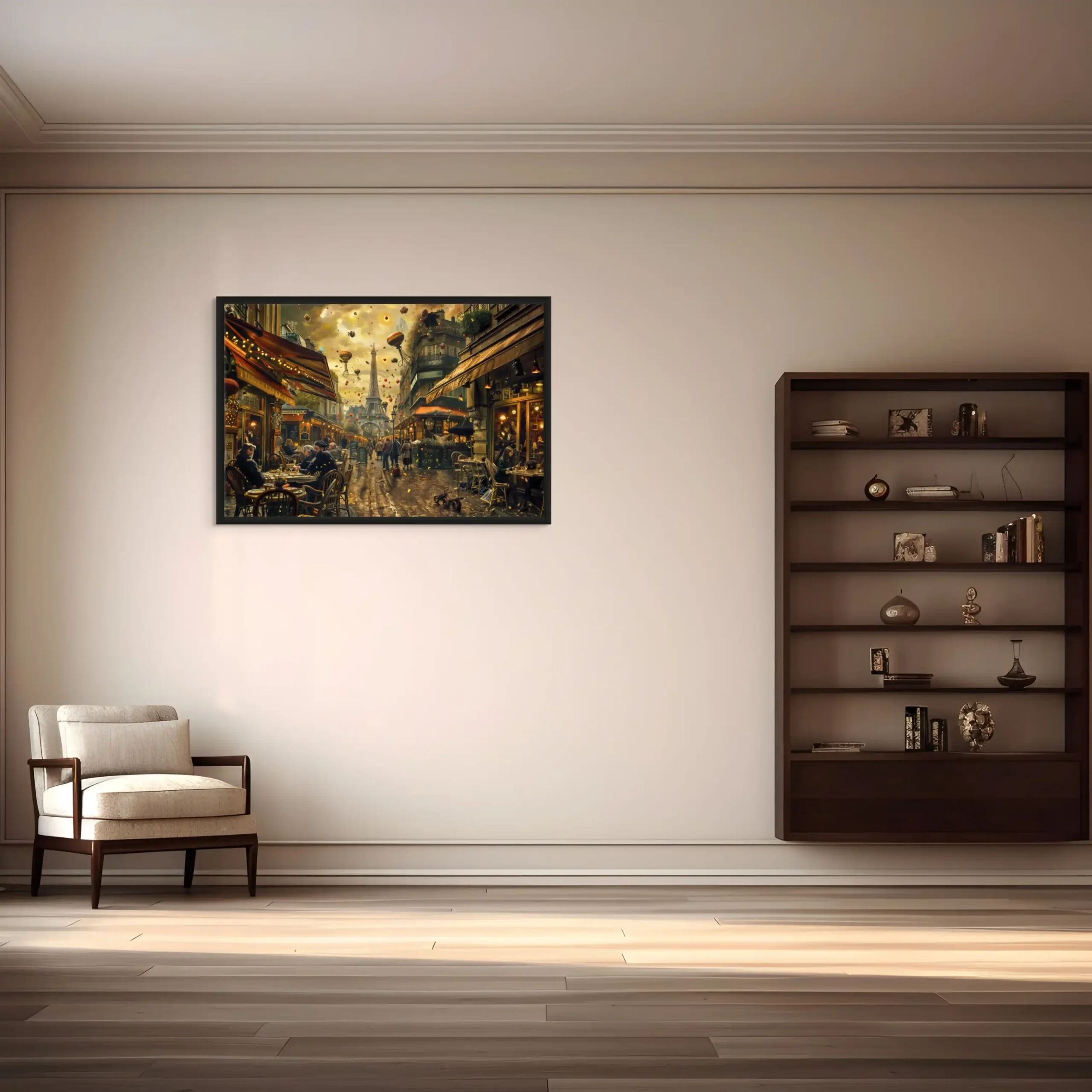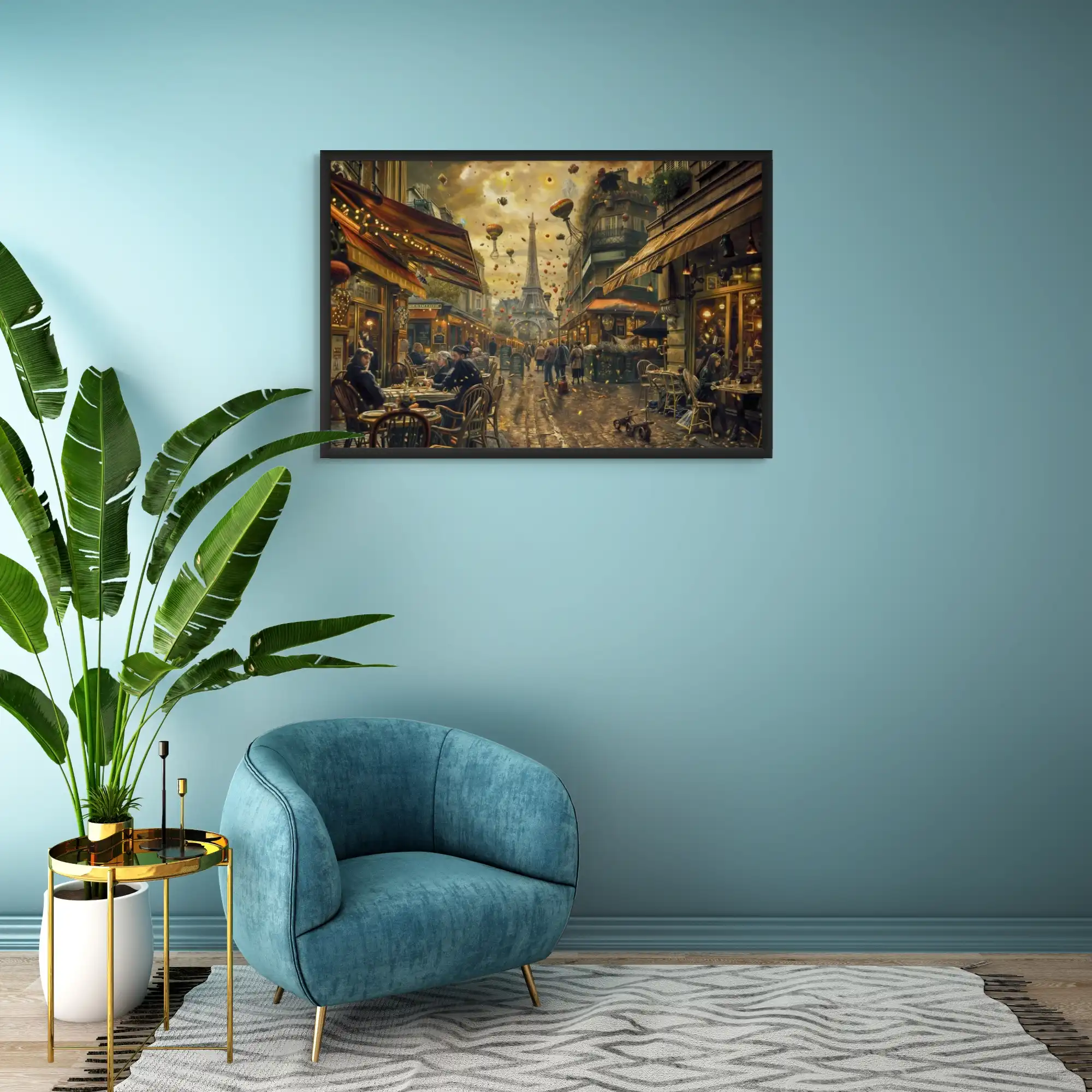 Notre toile murale dépeint une scène de vie quotidienne au cœur de Paris, rehaussée d’éléments surréalistes. Les silhouettes peintes avec soin évoquent l’effervescence des cafés, tandis que le ciel parsemé de montgolfières apporte une dimension poétique et steampunk, parfait pour décorer votre espace avec originalité.
