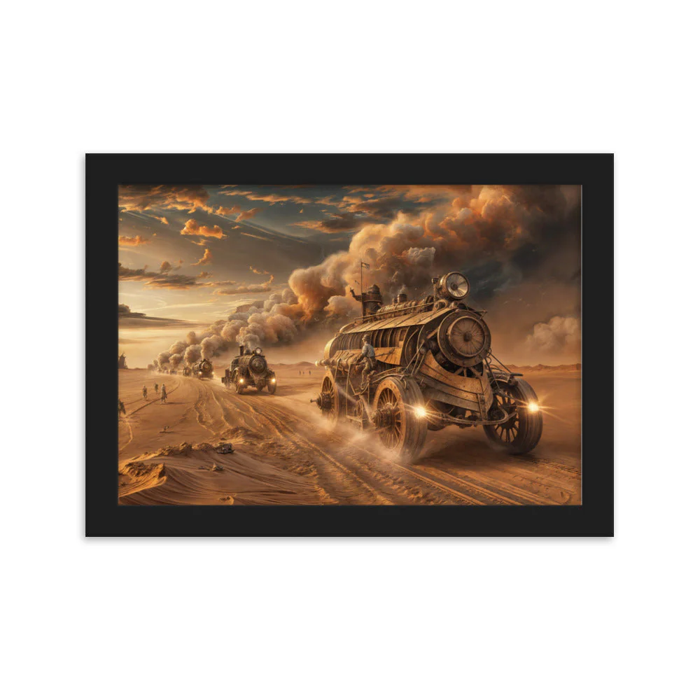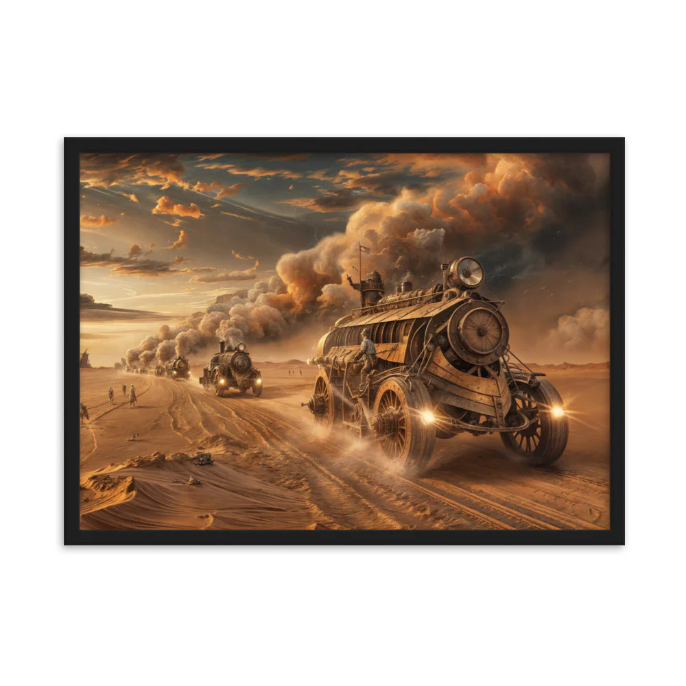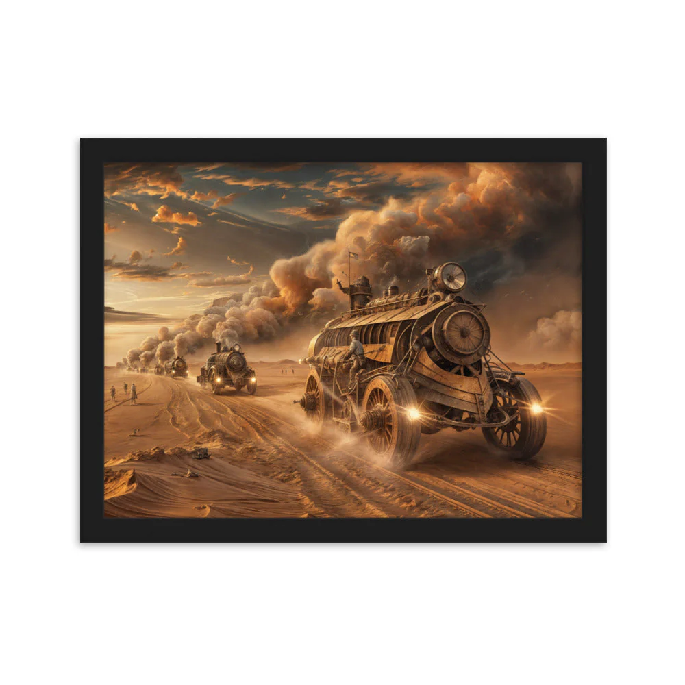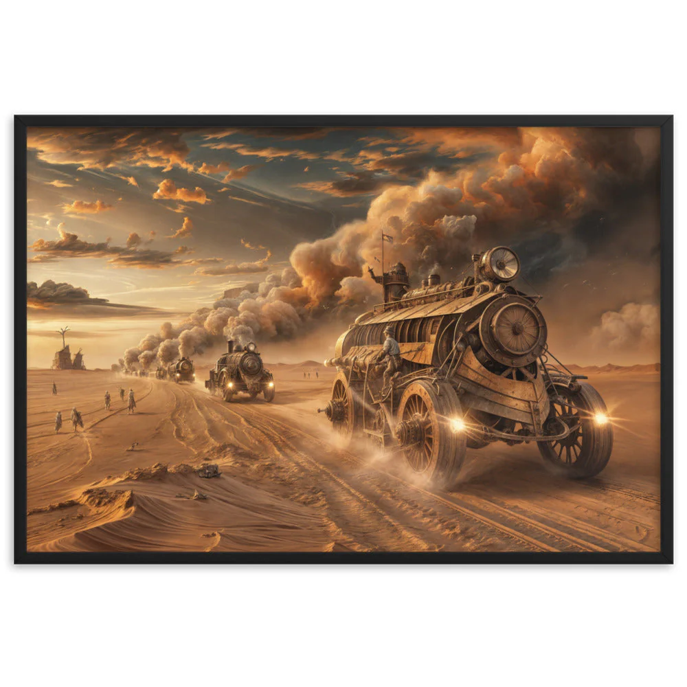 Chaque détail de ce tableau, depuis les véhicules dominants les dunes sablonneuses jusqu’aux explorateurs en quête de survie, est une célébration des univers de Jules Verne et de H.G. Wells. Les tons de bronze et de laiton, mêlés aux teintes de marron du désert, évoquent les nuances de la littérature steampunk, créant une esthétique qui est à la fois nostalgique et tournée vers l’avenir.