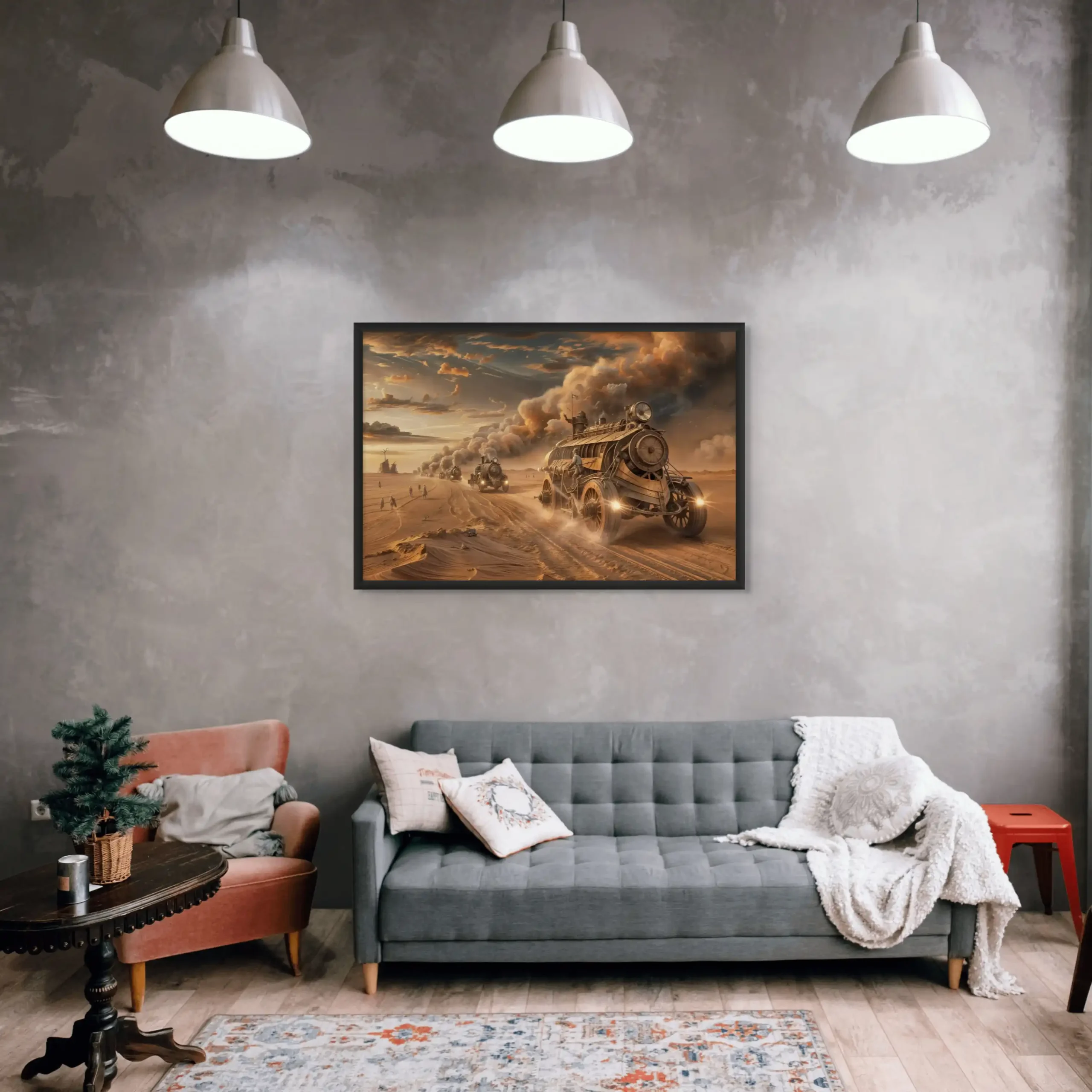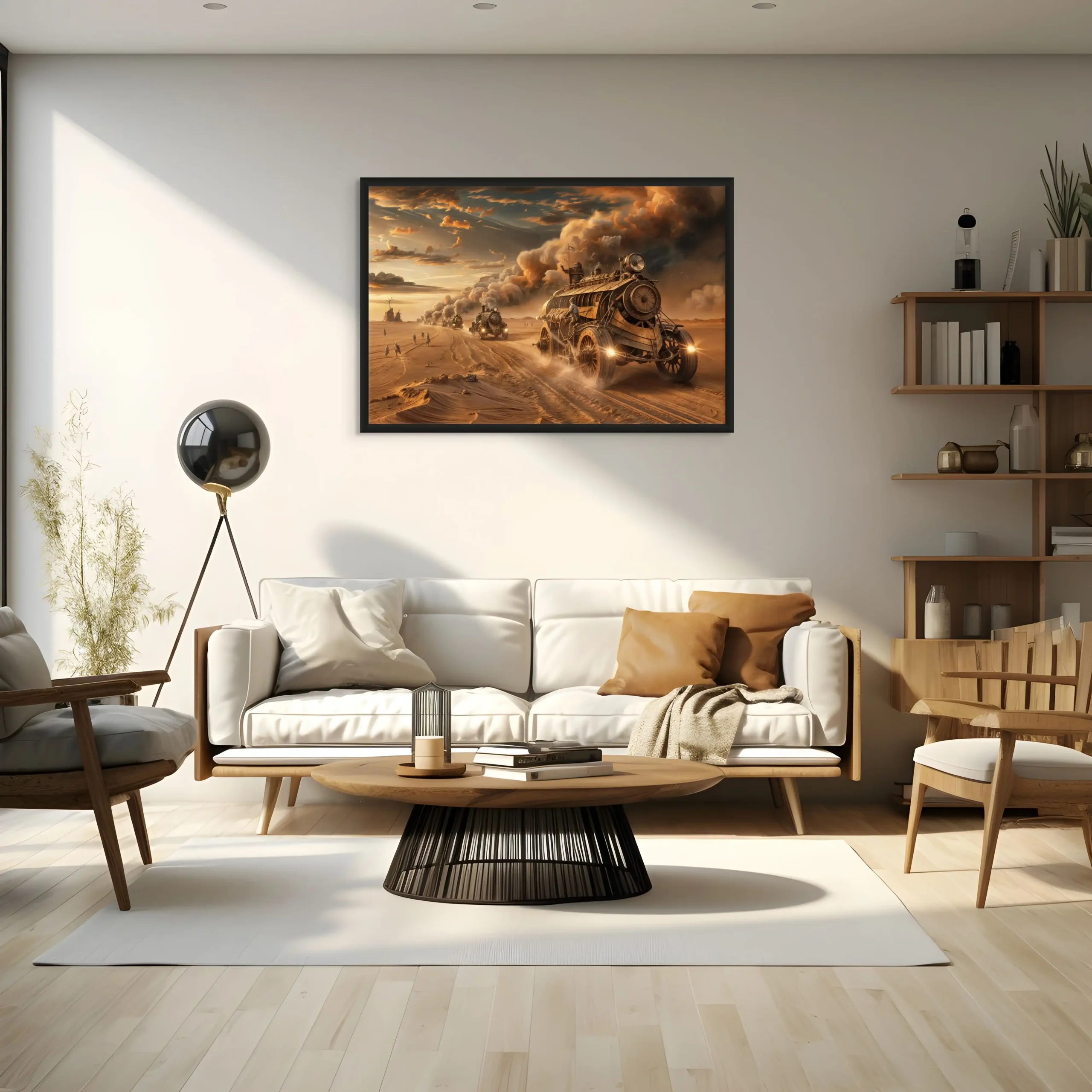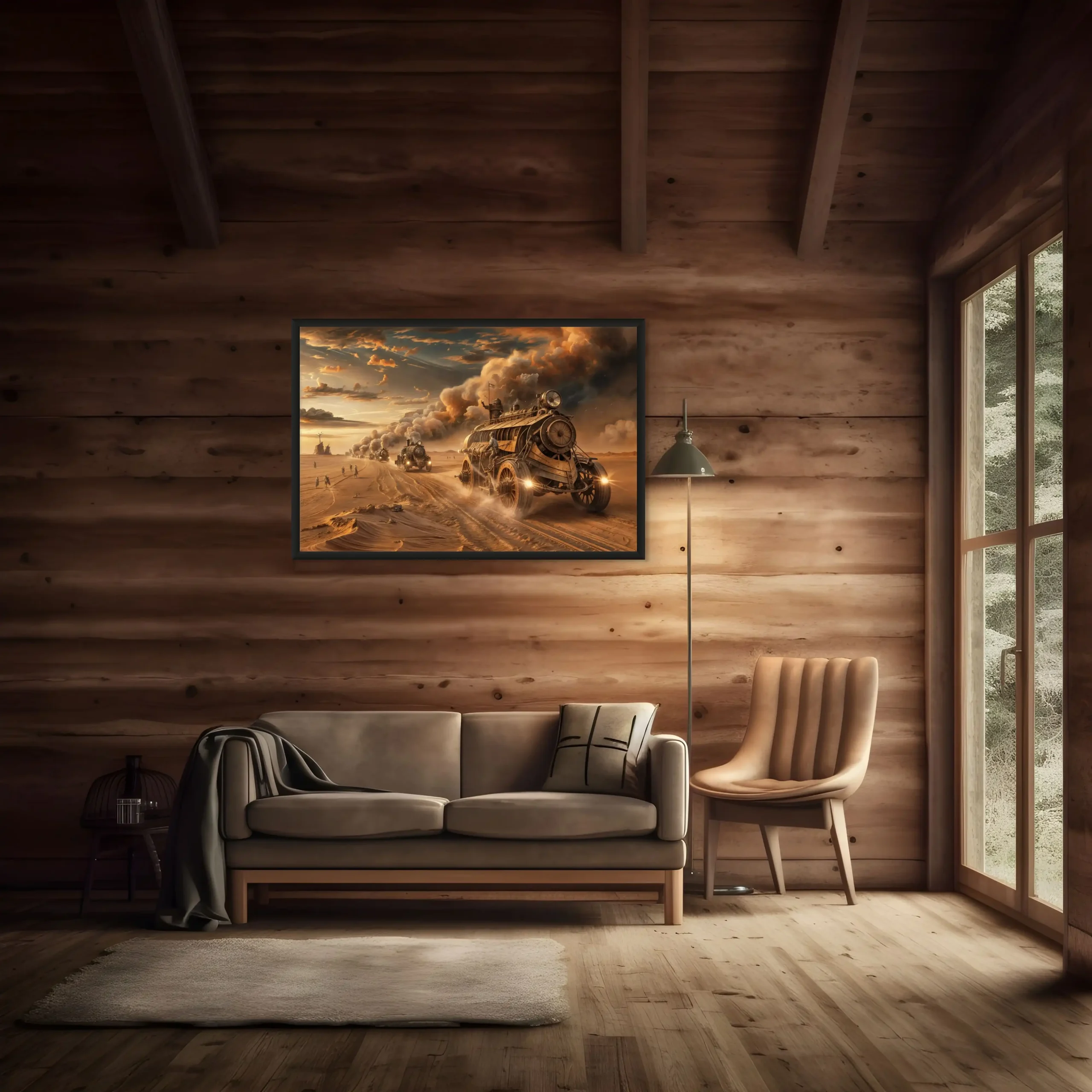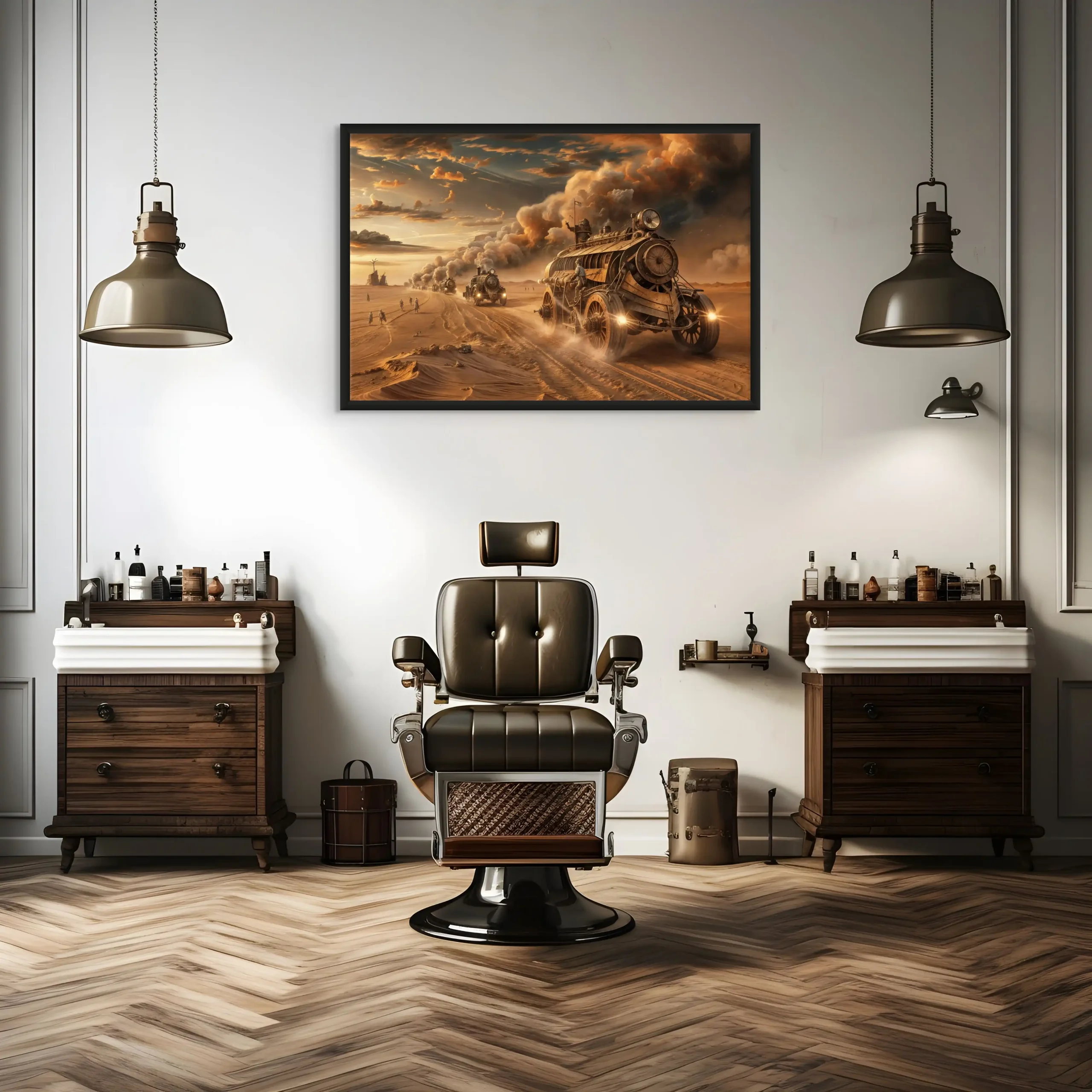 Chaque détail de ce tableau, depuis les véhicules dominants les dunes sablonneuses jusqu’aux explorateurs en quête de survie, est une célébration des univers de Jules Verne et de H.G. Wells. Les tons de bronze et de laiton, mêlés aux teintes de marron du désert, évoquent les nuances de la littérature steampunk, créant une esthétique qui est à la fois nostalgique et tournée vers l’avenir.