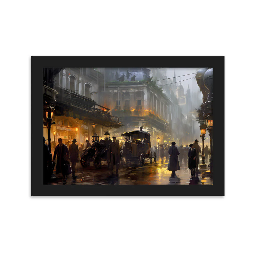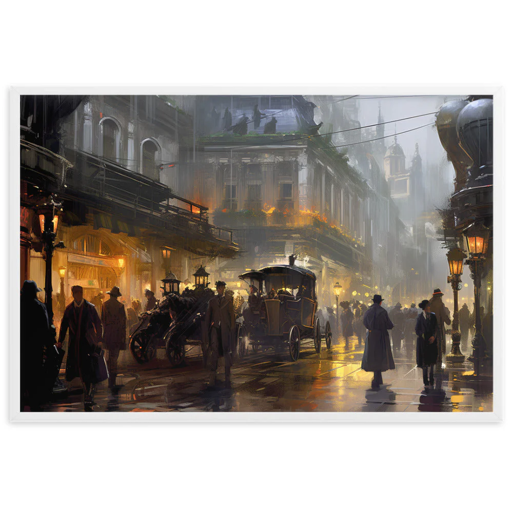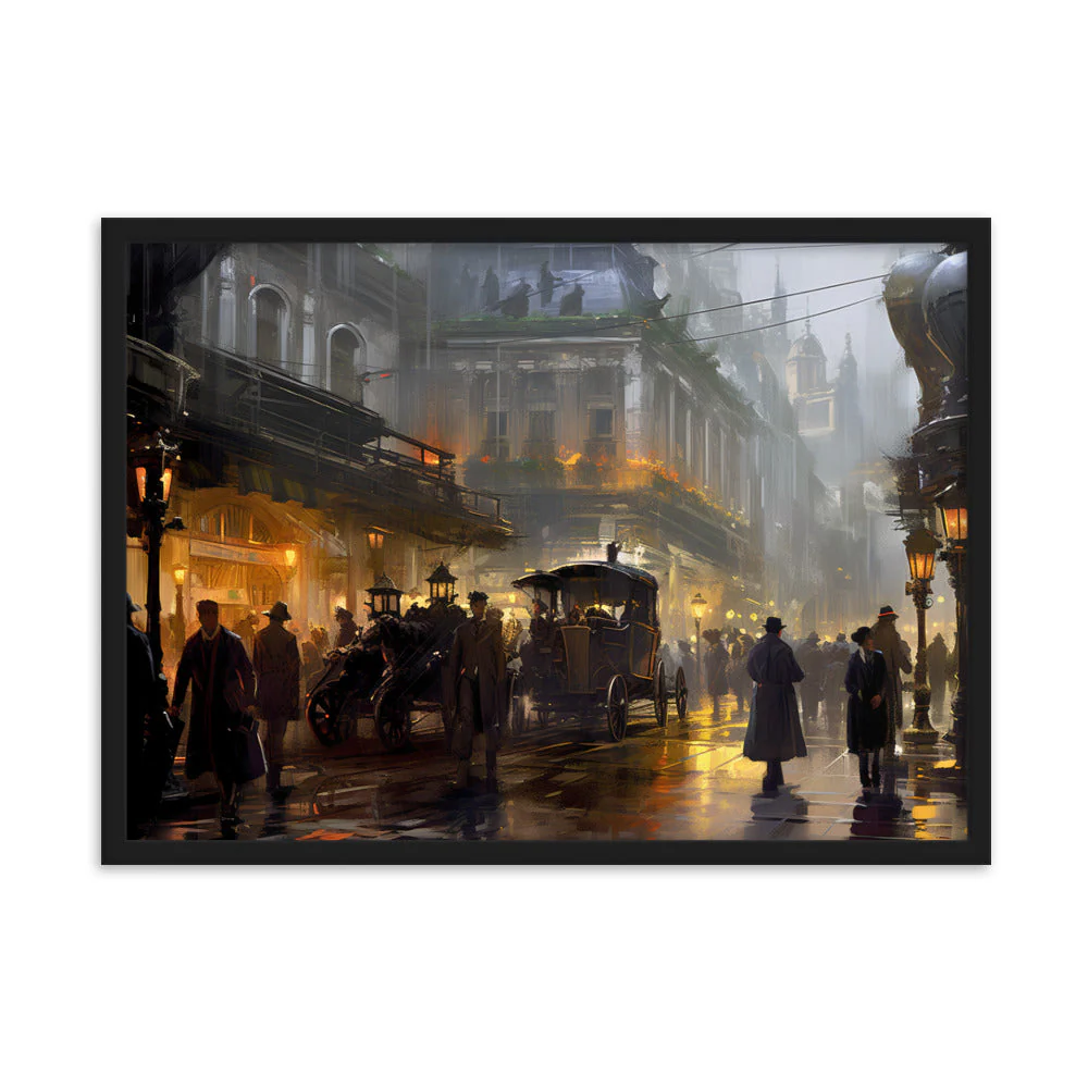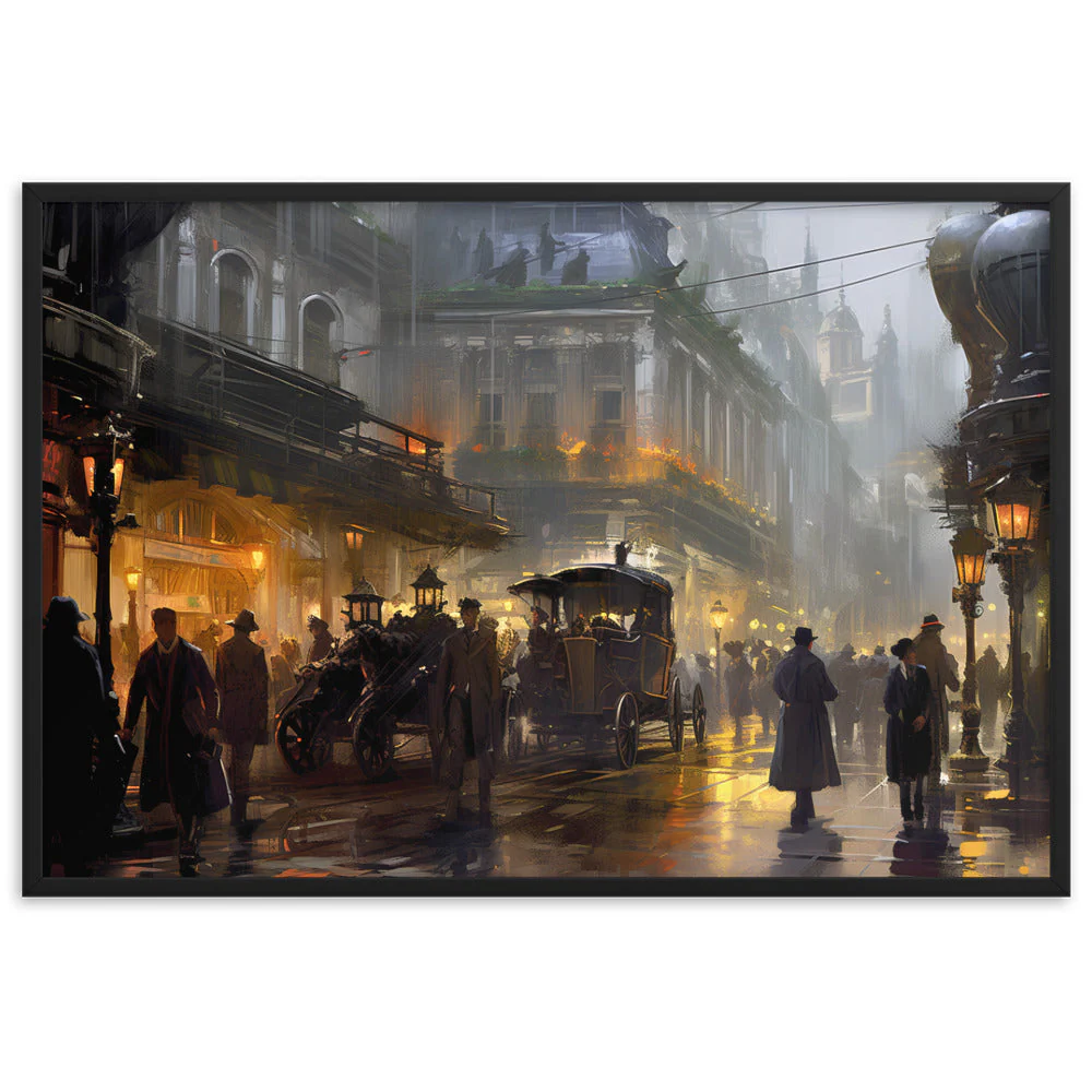 Plongez-vous dans une représentation unique d’une cité des années 1920, alliant l’aura d’une ville vintage sous la pluie à la magie du steampunk. Évoquant la mystique d’une époque révolue, ce chef-d’œuvre est inspiré par des talents tels que Magali Villeneuve et František Dvořák.