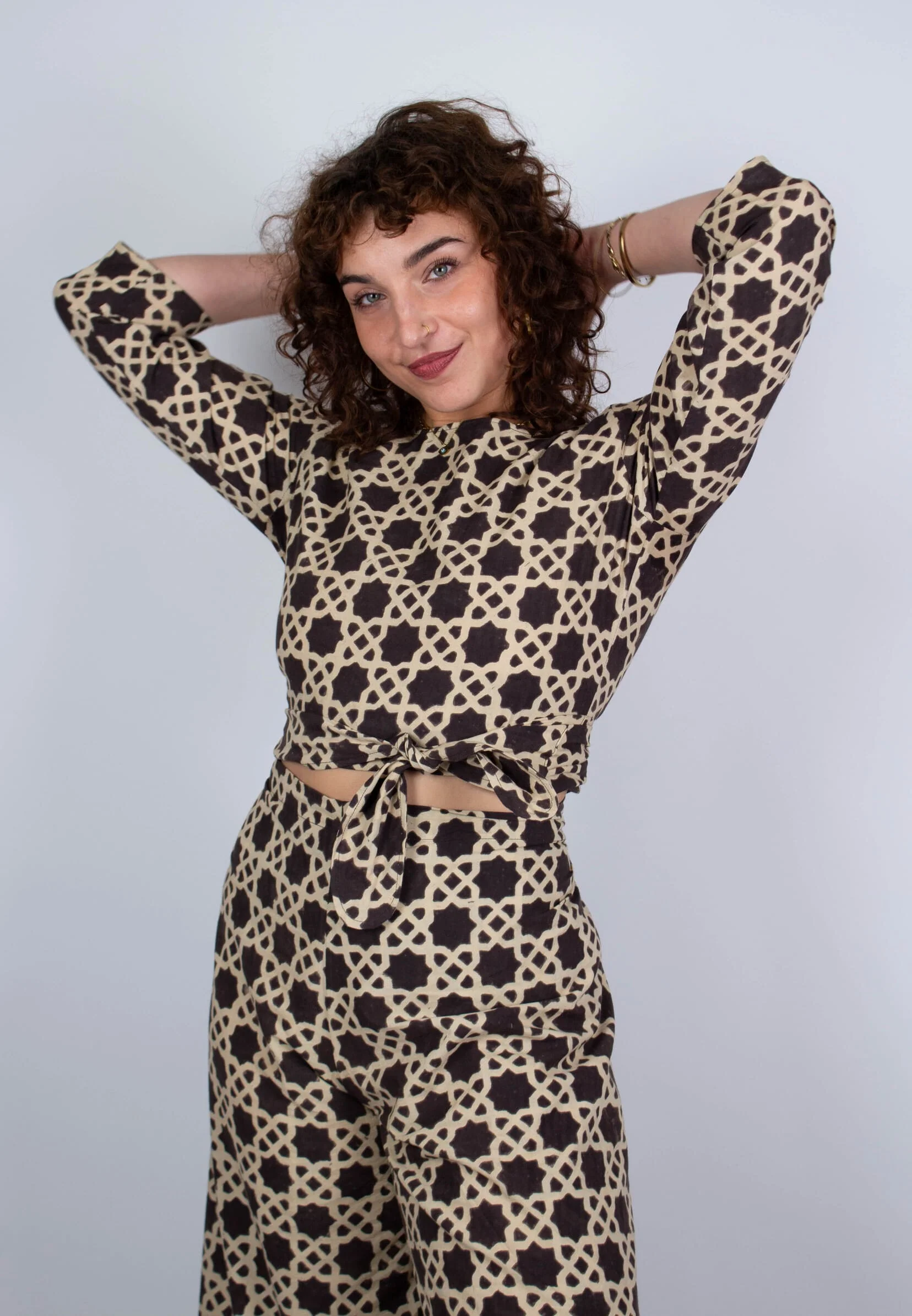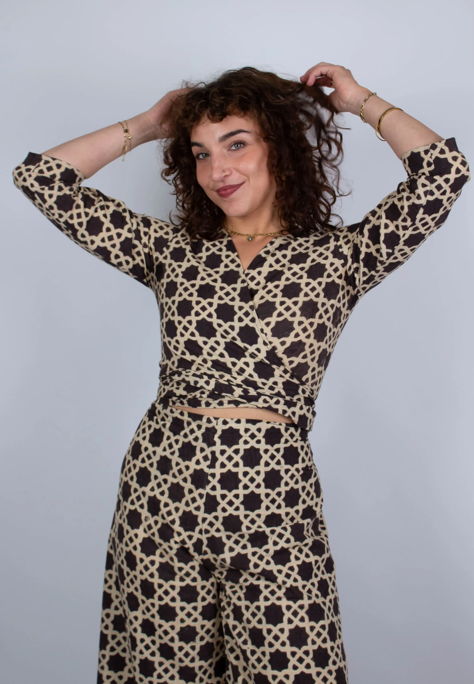Le top Benares en coton bio imprimé Baramada noir et blanc à manches 3/4 est aussi beau que fonctionnel. Il peut se porter de 5 manières différentes, en gilet noué, en cache-coeur, en crop top, en dos nu ou encore porté à l’envers. Sa coupe col V, son imprimé et sa modularité s’adaptent à de multiples looks décontractés et élégants. Le pantalon Saraswati saura parfaitement accompagner ce haut.