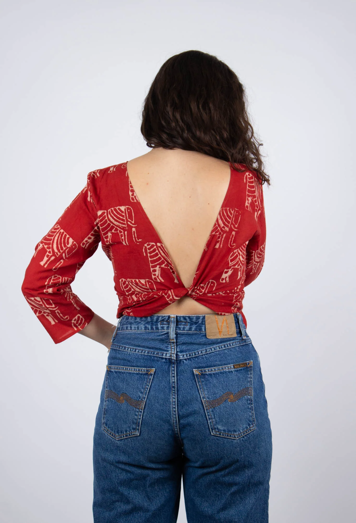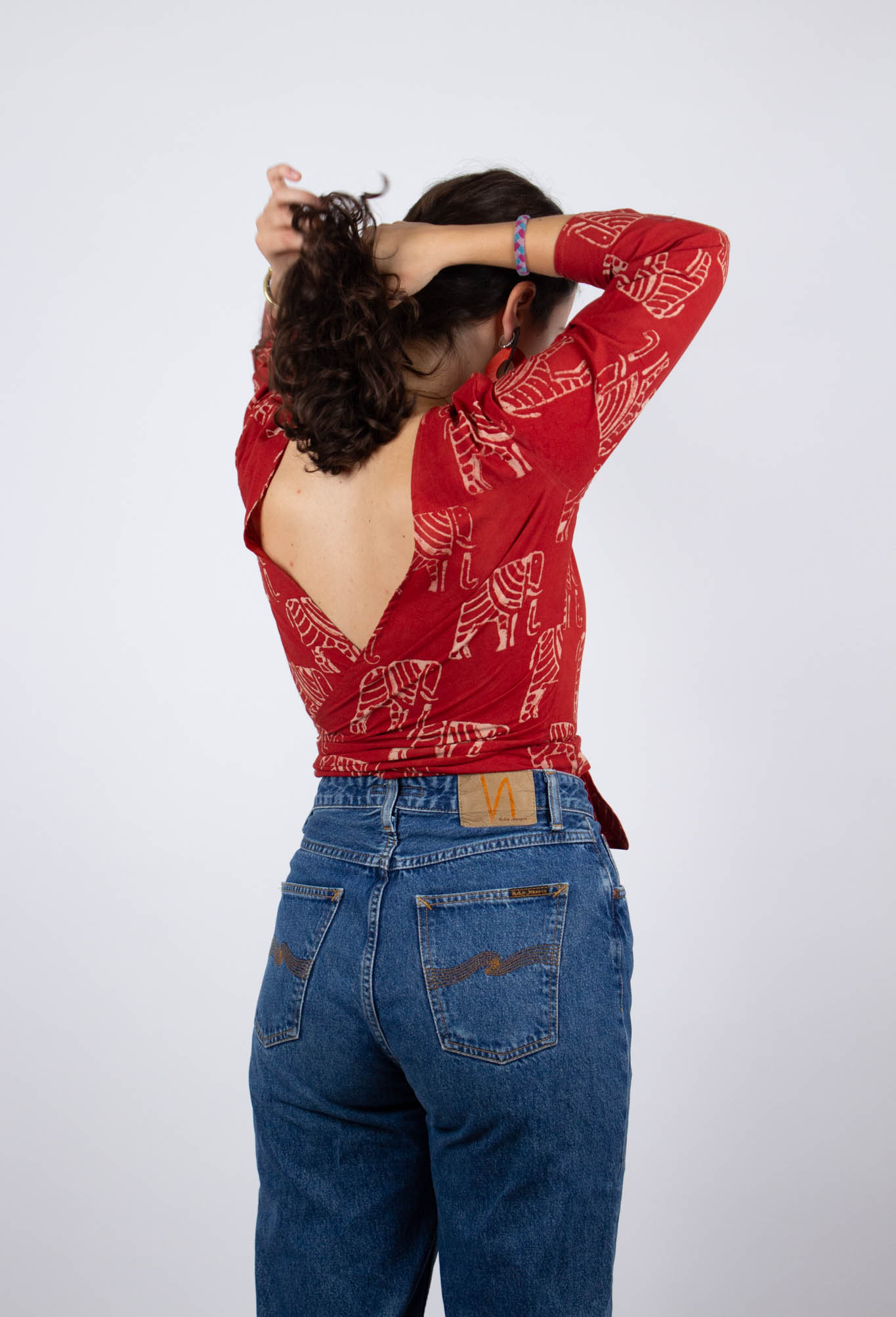Le top femme Benares en coton bio imprimé Ganesha rouge et écru à manches 3/4 est aussi beau que fonctionnel. Il peut se porter de 5 manières différentes, en gilet noué, en cache-coeur, en crop top, en dos nu ou encore porté à l’envers. Sa coupe col V, son imprimé chaud et original et sa modularité s’adaptent à de multiples looks décontractés et élégants. Le pantalon Saraswati saura parfaitement accompagner ce haut.
