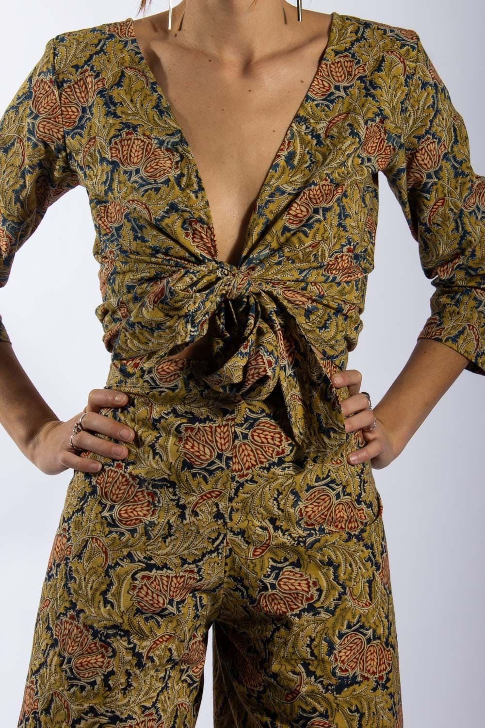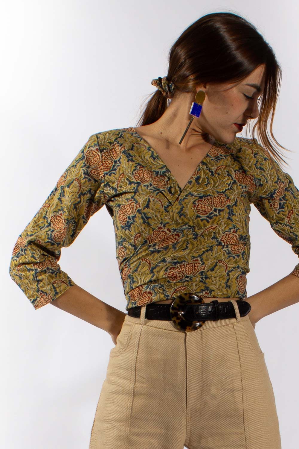Le top femme Benares en coton bio imprimé Japanese Flower bleu et jaune à manches 3/4 est aussi beau que fonctionnel. Il peut se porter de 5 manières différentes, en gilet noué, en cache-coeur, en crop top, en dos nu ou encore porté à l’envers. Sa coupe col V, son imprimé frais et coloré et sa modularité s’adaptent à de multiples looks décontractés et élégants. Le pantalon Saraswati saura parfaitement accompagner ce haut.