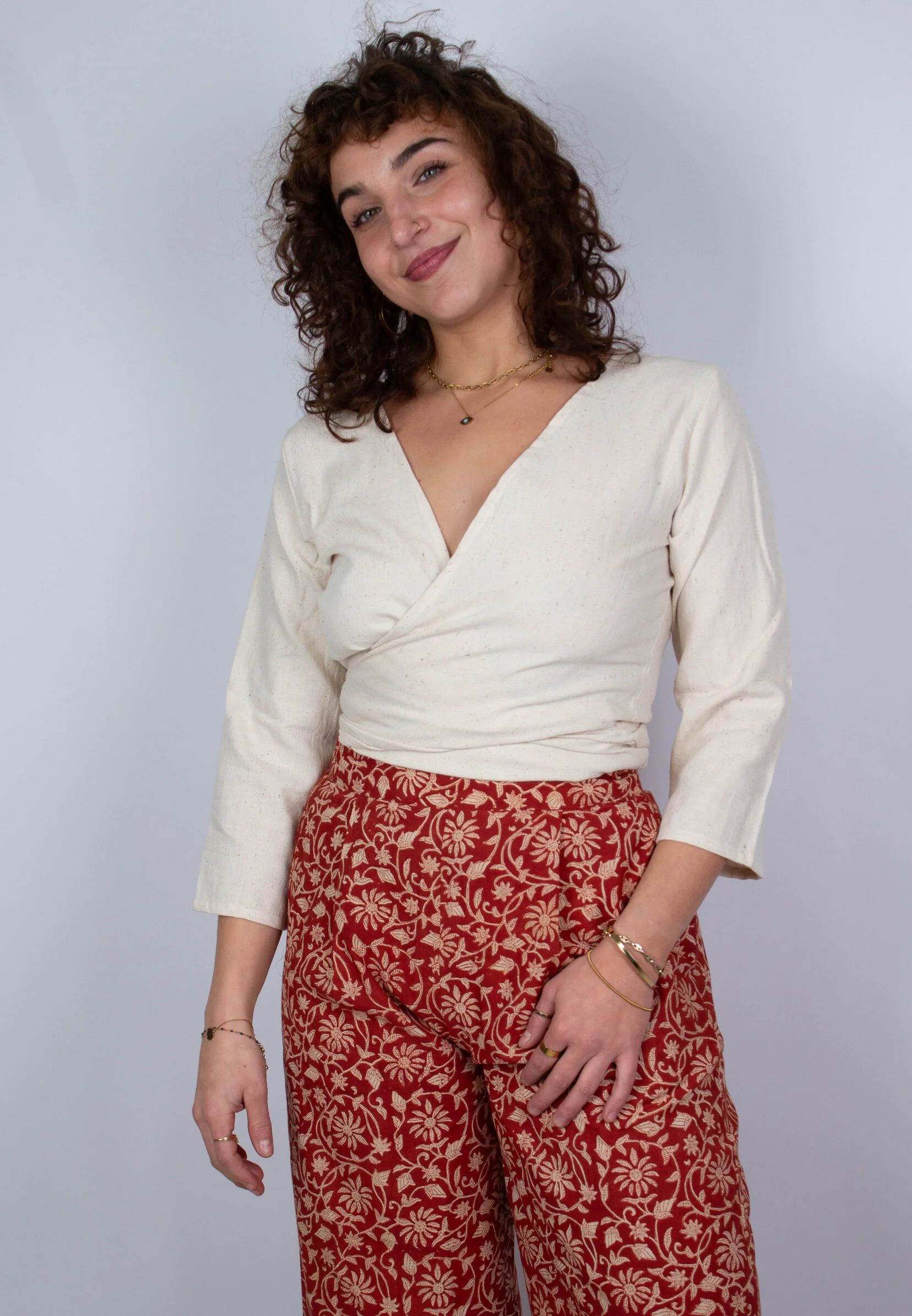 Le top femme Benares en coton bio écru à manches 3/4 est aussi beau que fonctionnel. Il peut se porter de 5 manières différentes, en gilet noué, en cache-coeur, en crop top, en dos nu ou encore porté à l’envers. Sa coupe col V, son tissu en coton brut et sa modularité s’adaptent à de multiples looks décontractés et élégants. Il est ici présenté avec le pantalon Sagara imprimé Bageecha !