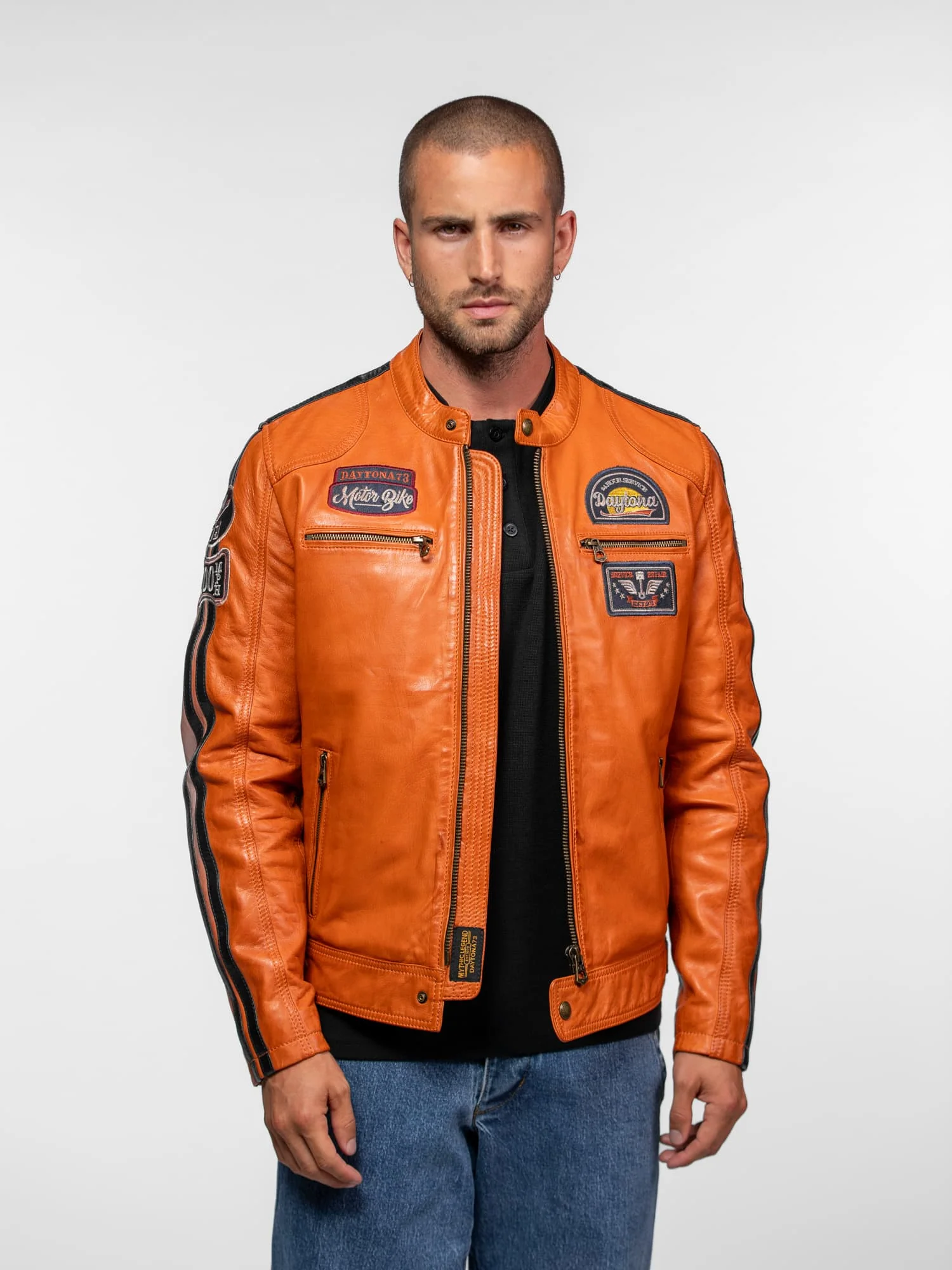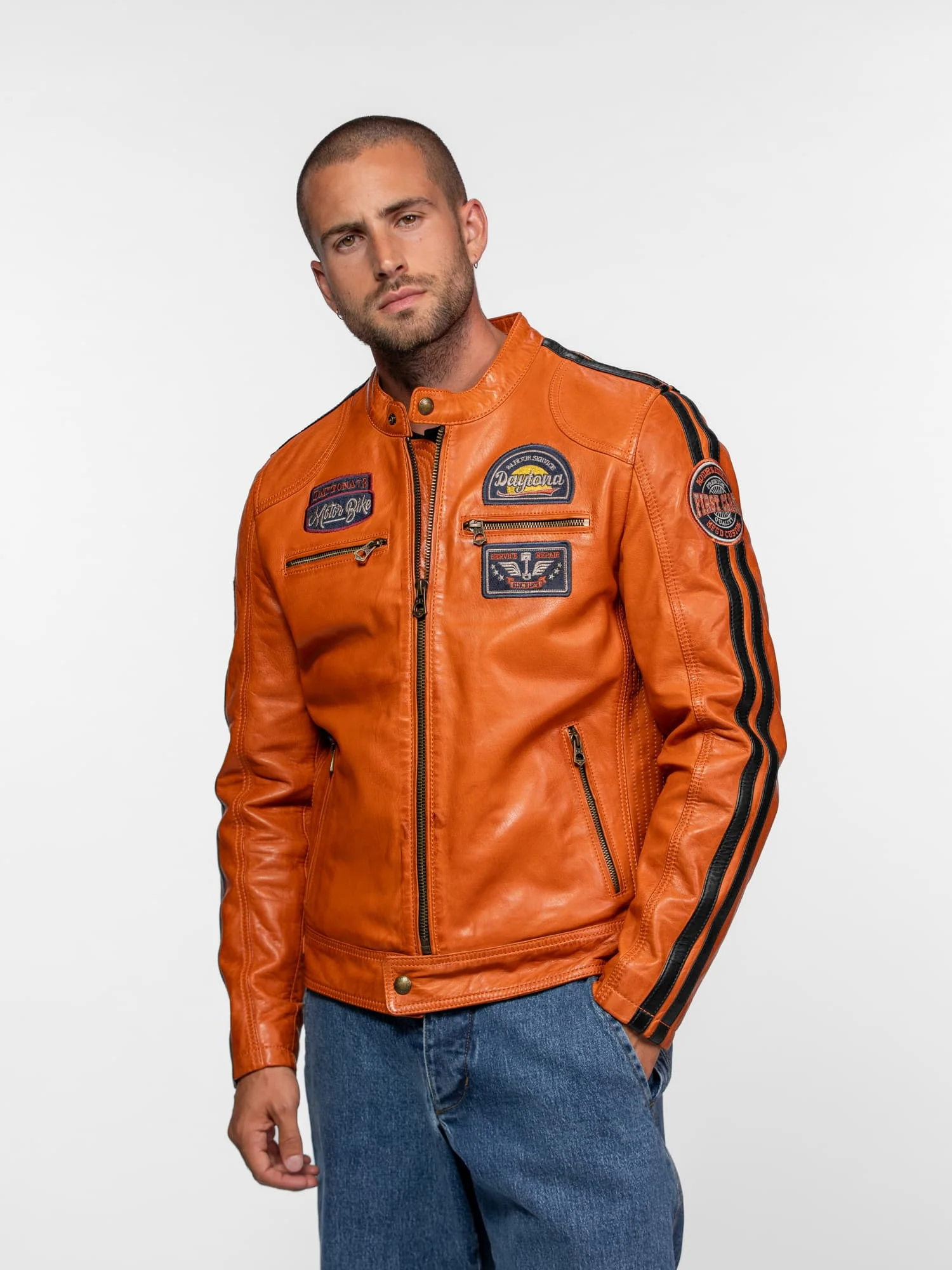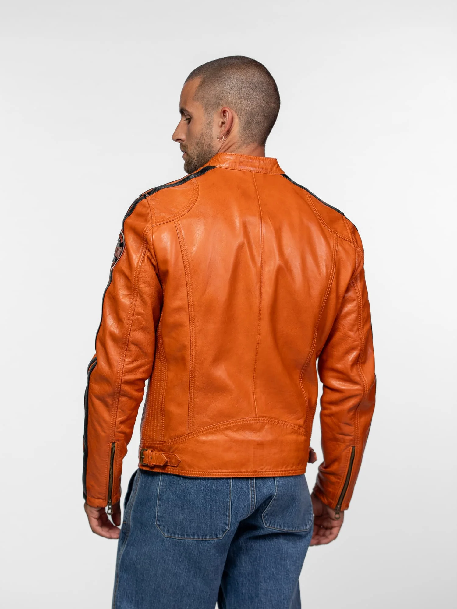 Mélange parfait de style rétro et de performance, ce blouson motard en cuir de mouton au tannage végétal est orné de patchs customisés, ajoutant une touche authentique à votre tenue. Il possède une coupe ajustée mettant en avant votre silhouette.