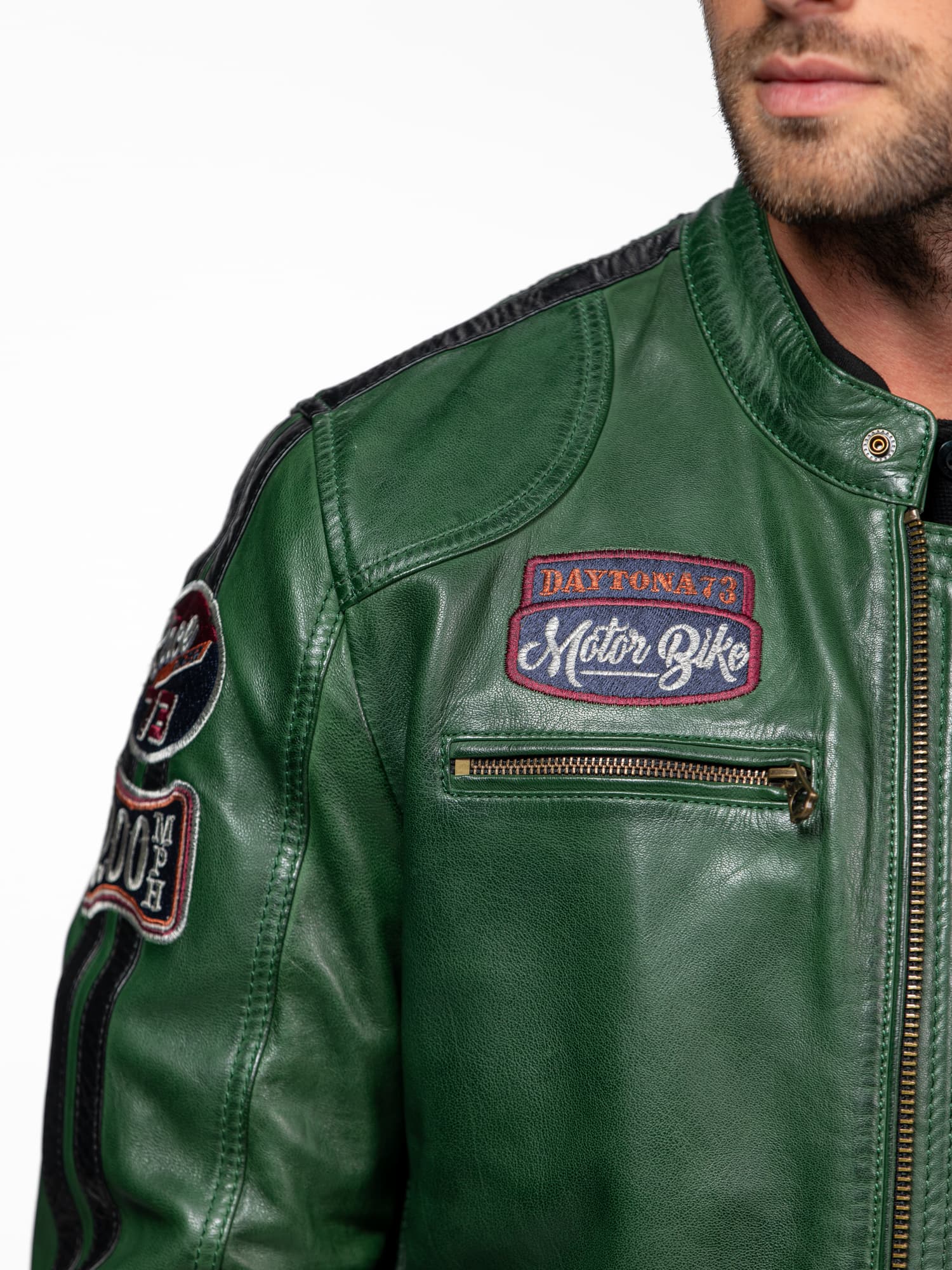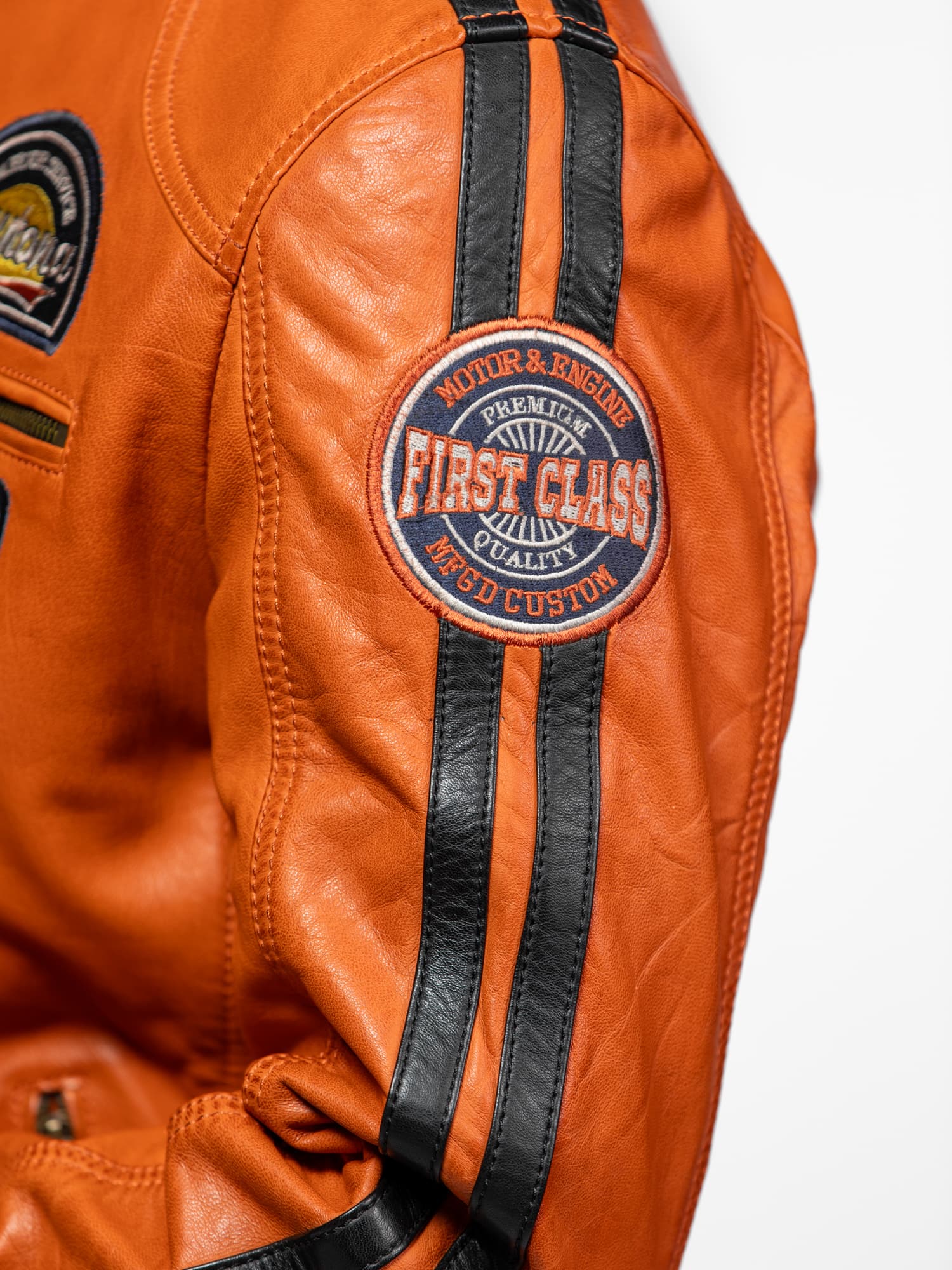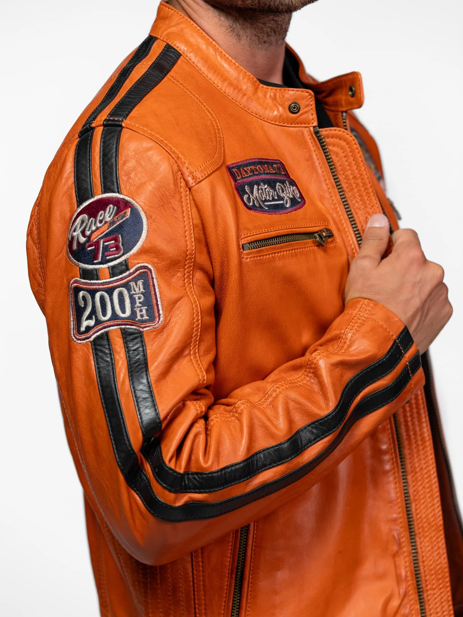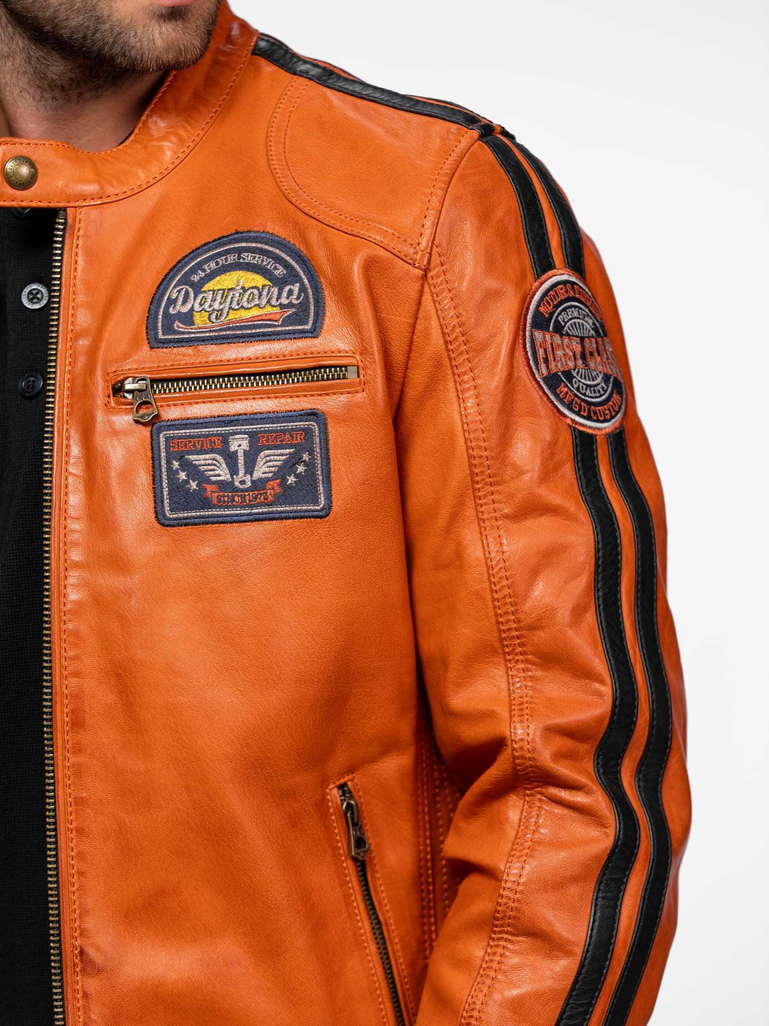 Mélange parfait de style rétro et de performance, ce blouson motard en cuir de mouton au tannage végétal est orné de patchs customisés, ajoutant une touche authentique à votre tenue. Il possède une coupe ajustée mettant en avant votre silhouette.