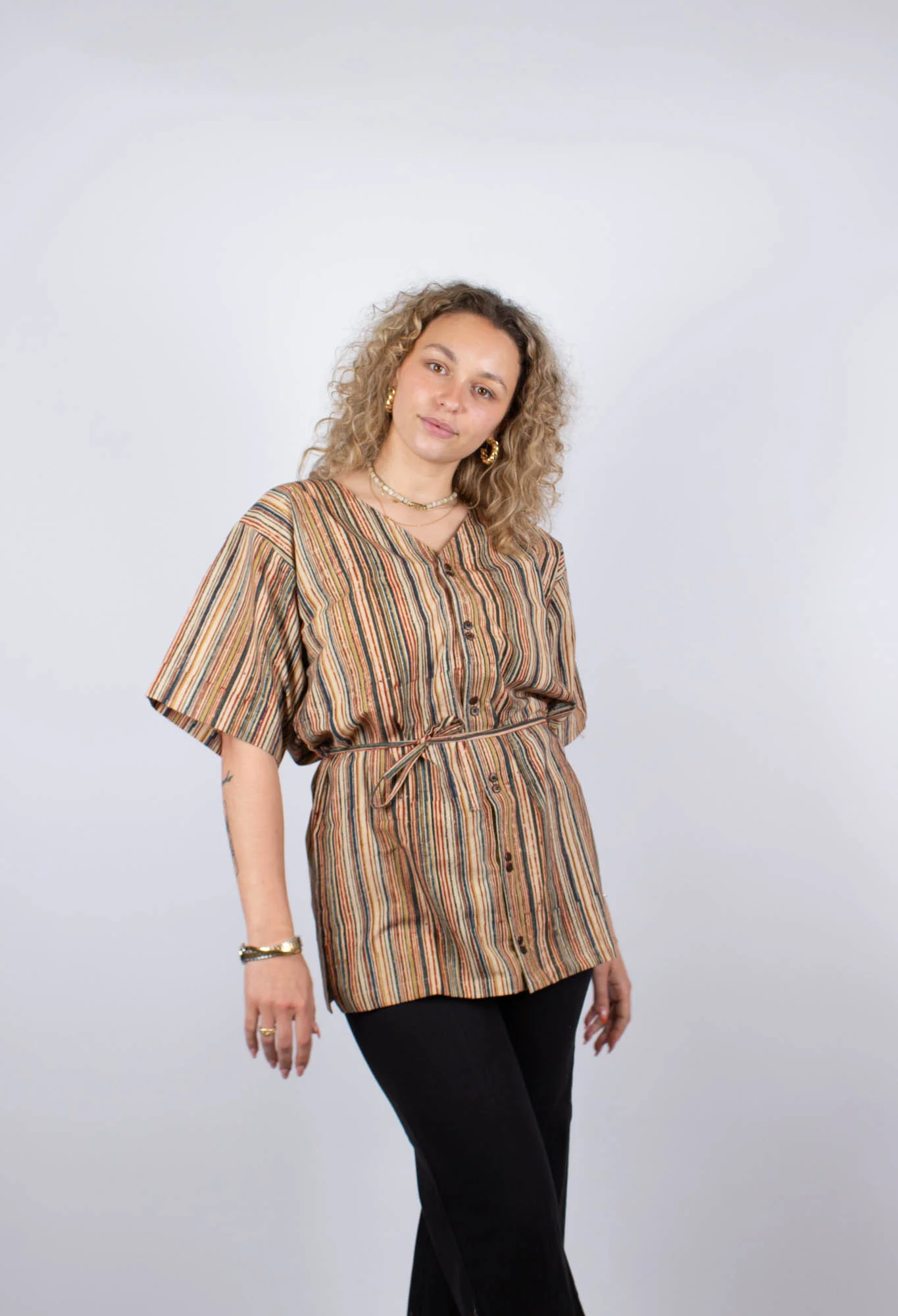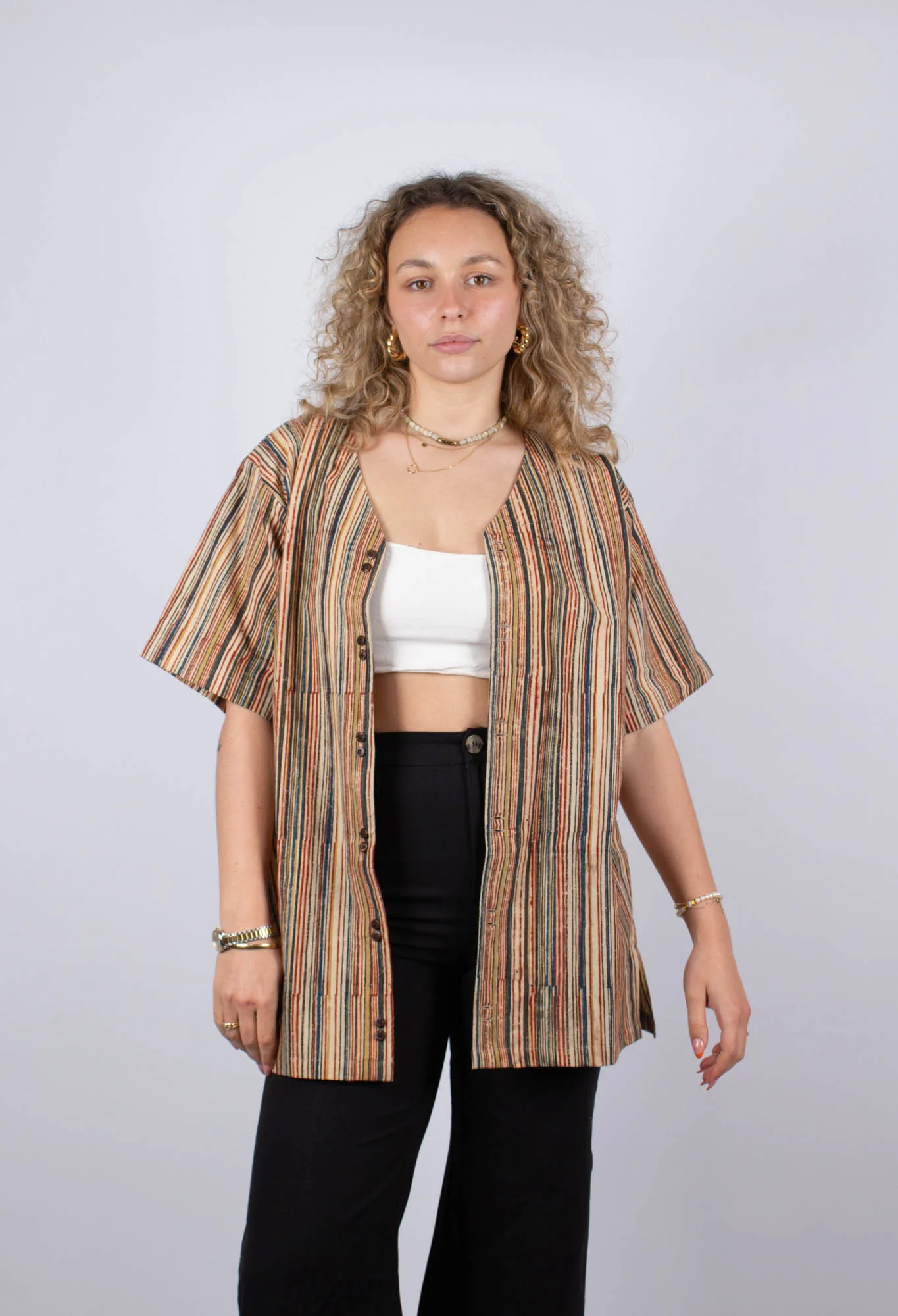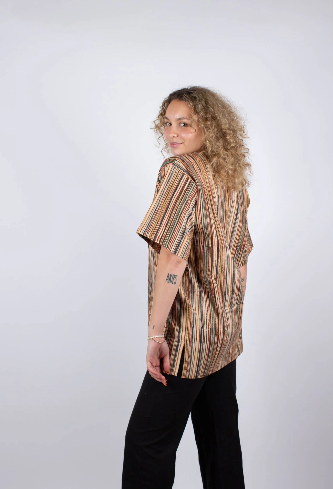 La tunique femme Chennai en coton bio imprimé Arunachala à rayures dans les tons de beige et bleu est idéale pour rester élégante et confortable. Avec sa taille unique, elle convient à toutes les morphologies et peut se porter fermée avec ou sans ceinture, ou ouverte sur un tee-shirt ! Composition : 100% coton biologique.