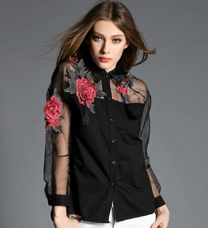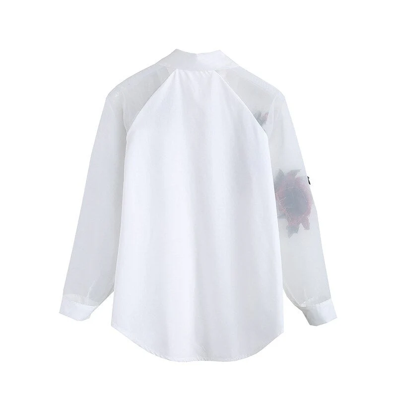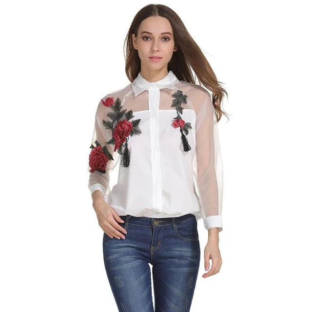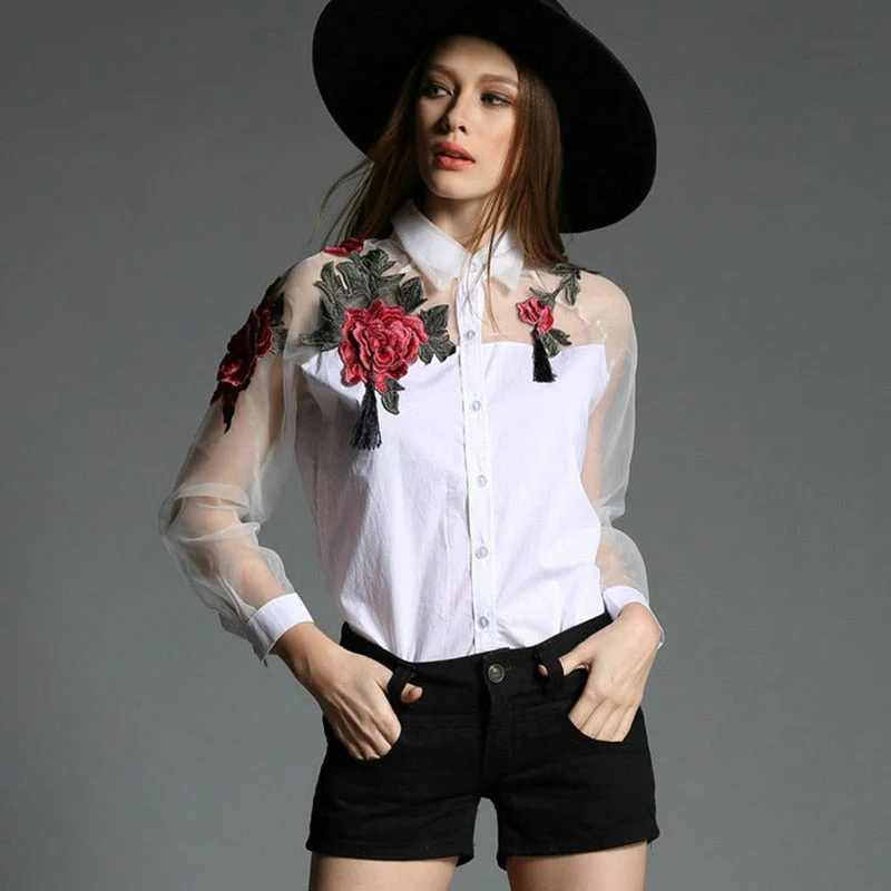 Un haut pour Femme à l’influence méridionale avec ses grandes fleurs brodées.