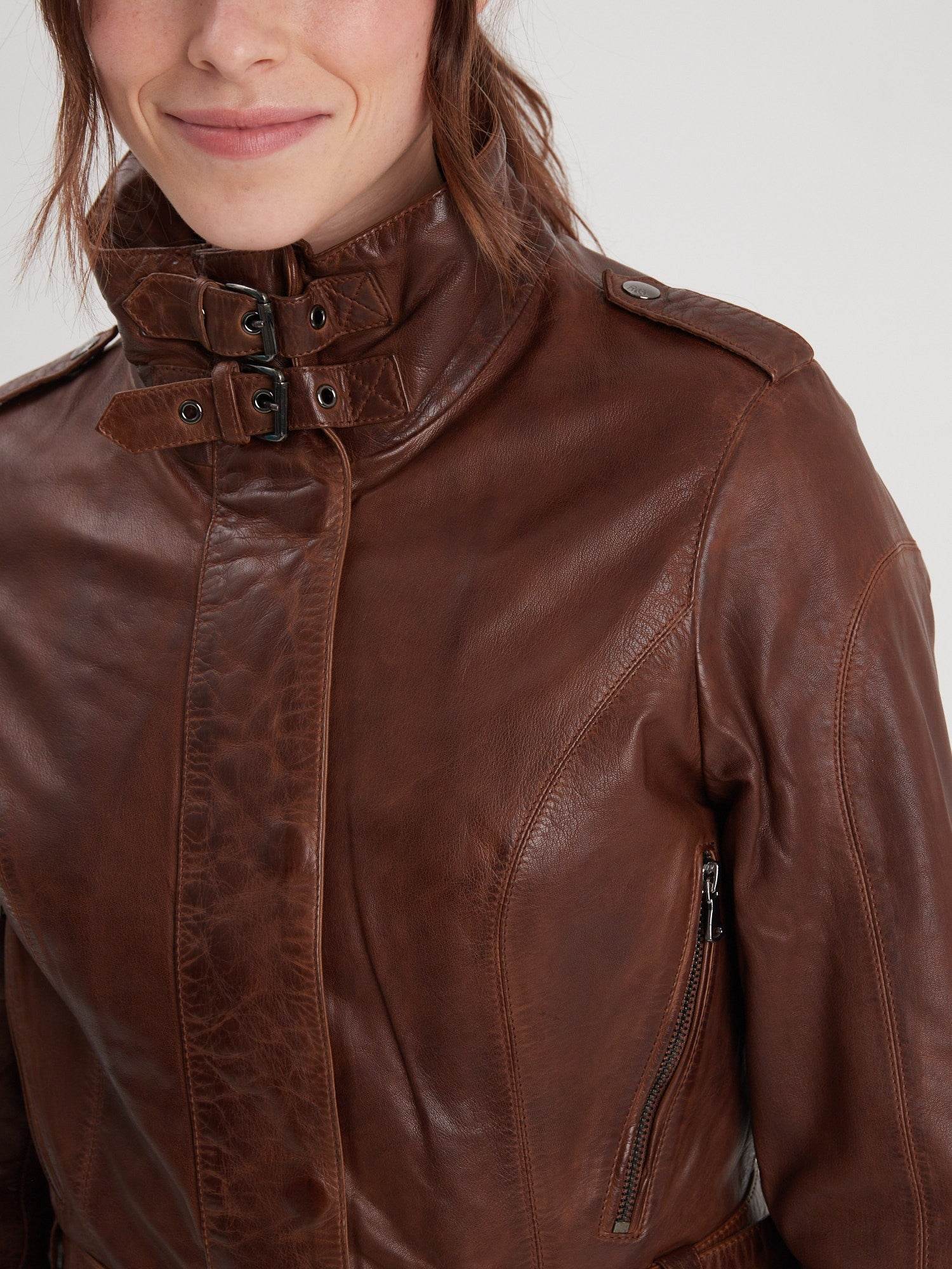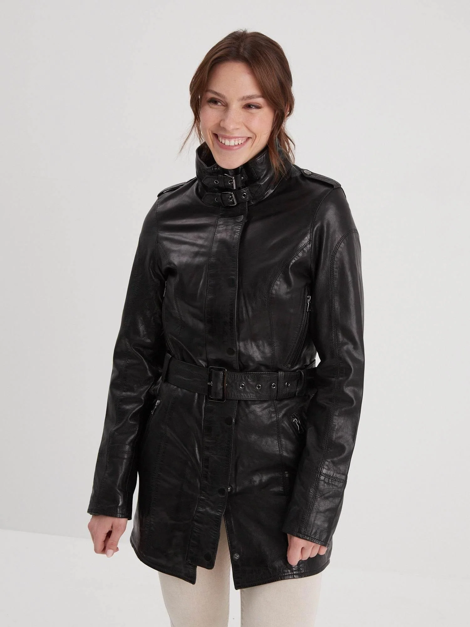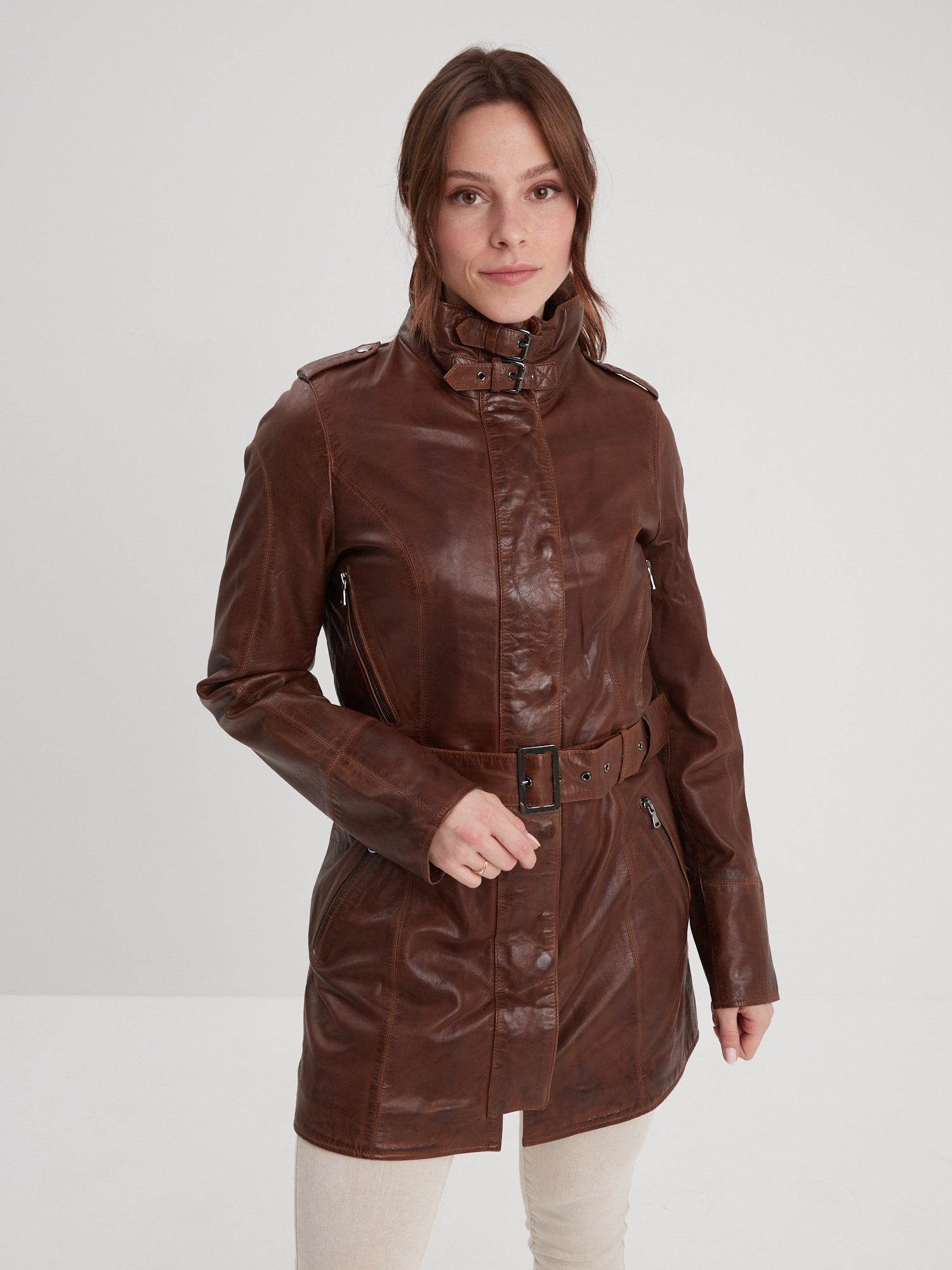 Le long manteau en cuir cintré est un incontournable du prêt-à-porter féminin. Le modèle Twilight dispose d’un col montant ajustable grâce à ses 2 boucles de serrage. Soyez raffinée avec ce trench en cuir indémodable !