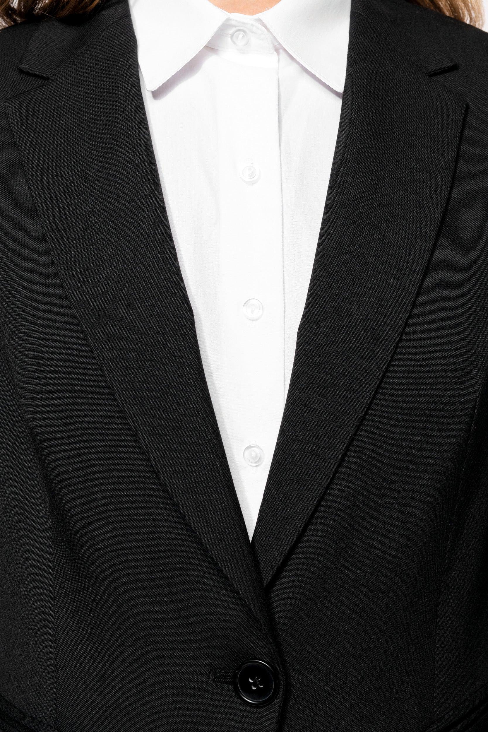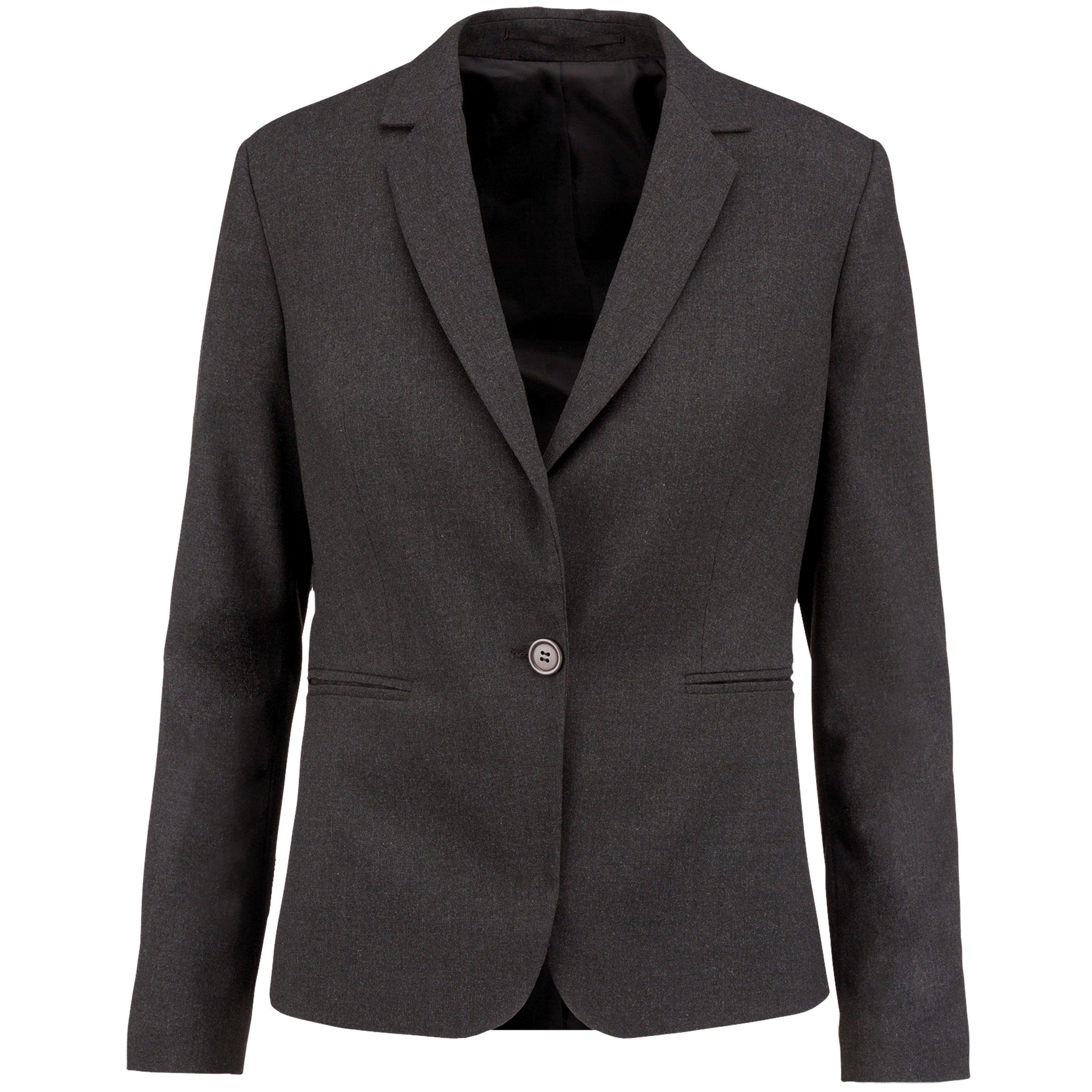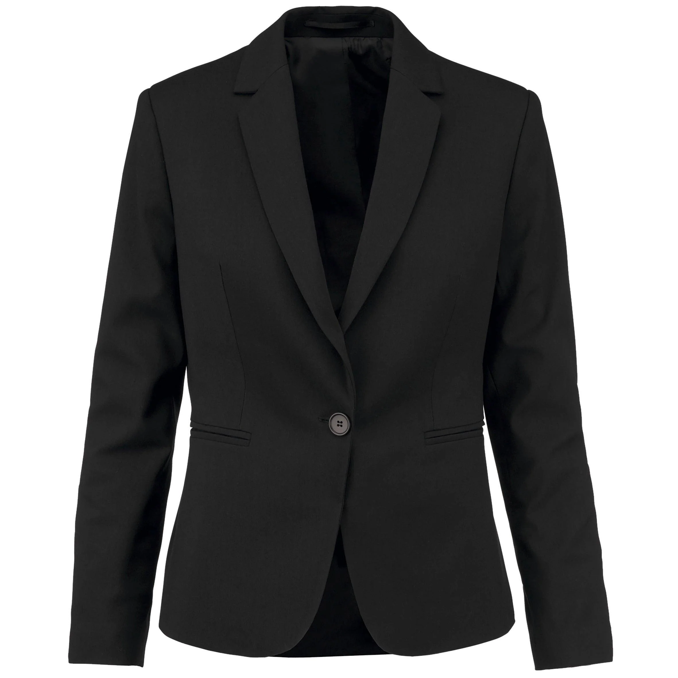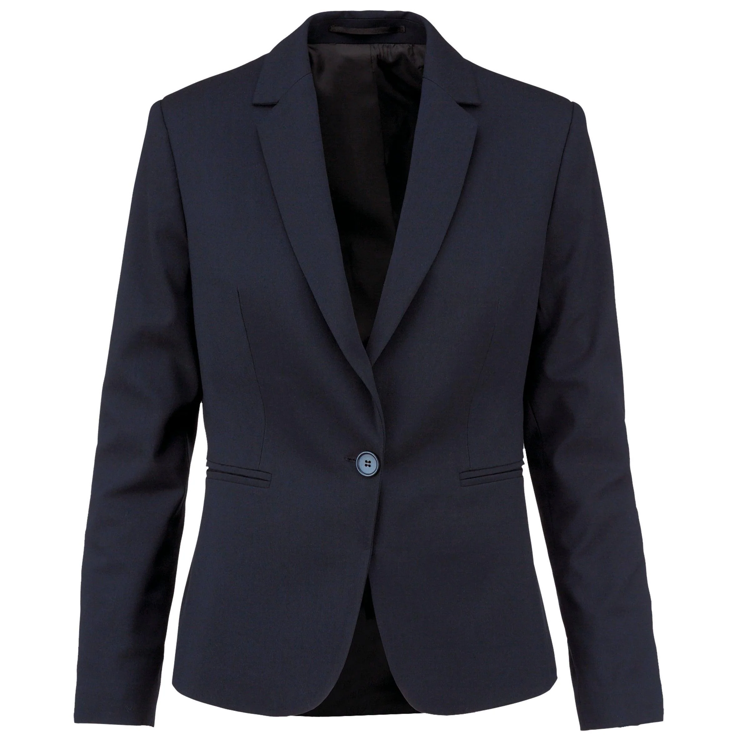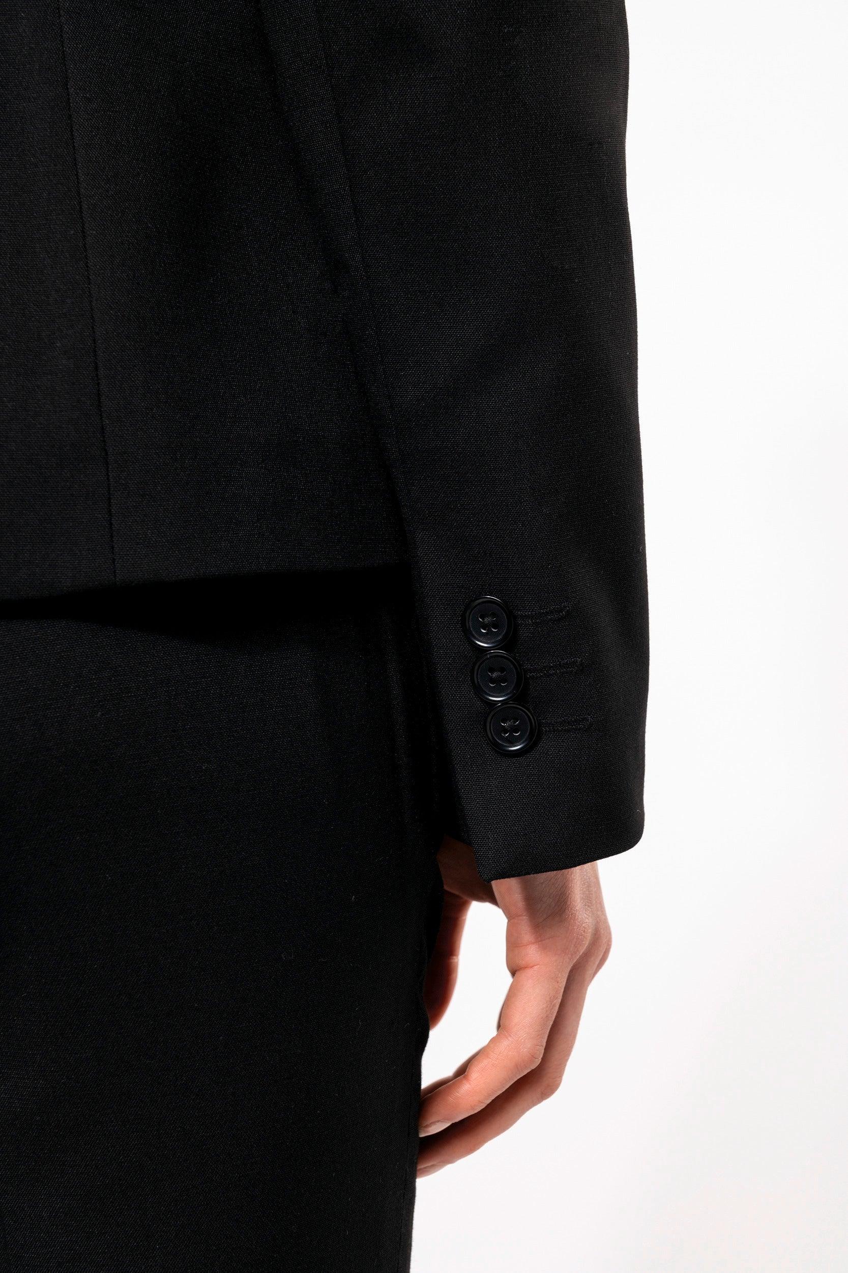 64% polyester / 34% viscose / 2% élasthanne. Doublure 100% polyester taffetas. Veste 1 bouton. 2 poches passepoilées devant. 2 poches intérieures boutonnées. Bas de manches avec 3 boutons. 1 fente d’aisance au dos.