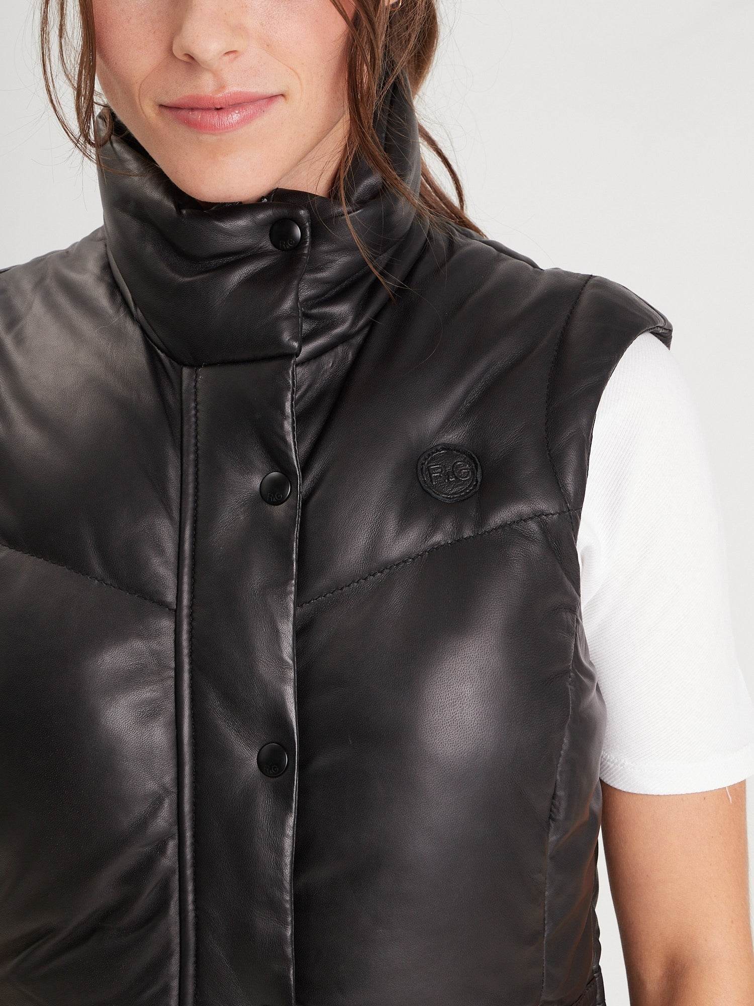 Cette doudoune sans manche est la pièce tendance de l’hiver. Changez très facilement de style selon vos envies. Ce modèle est fabriqué en cuir d’agneau avec une doublure en coton ouatiné certifié Thermocore.