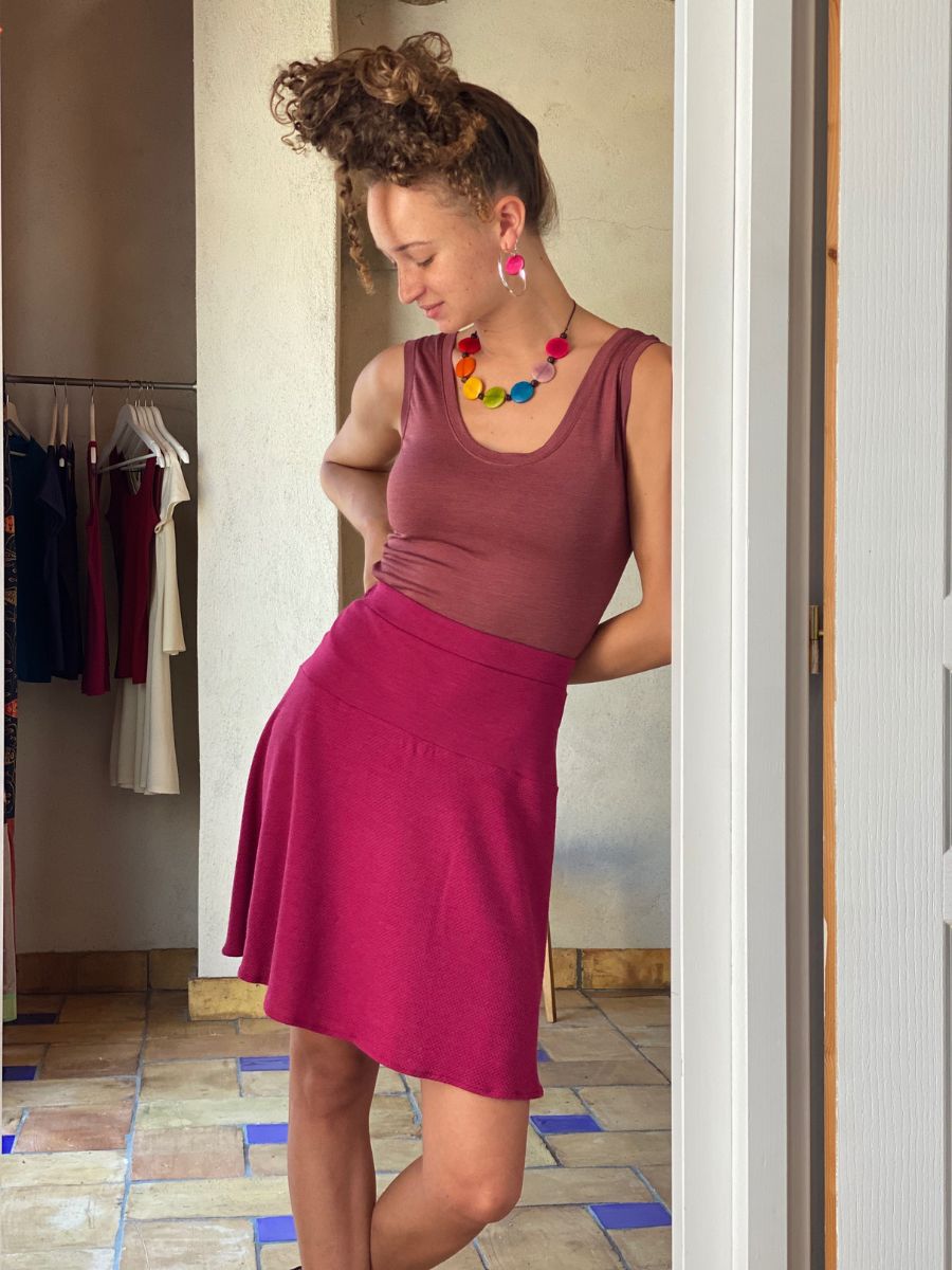Voilà la jupe femme en mérinos bio et soie naturelle incontournable, celle qu’on porte partout et tout le temps, à la ville comme à la plage, jambes nues quand il fait bon, avec notre legging quand le frais se fait sentir !